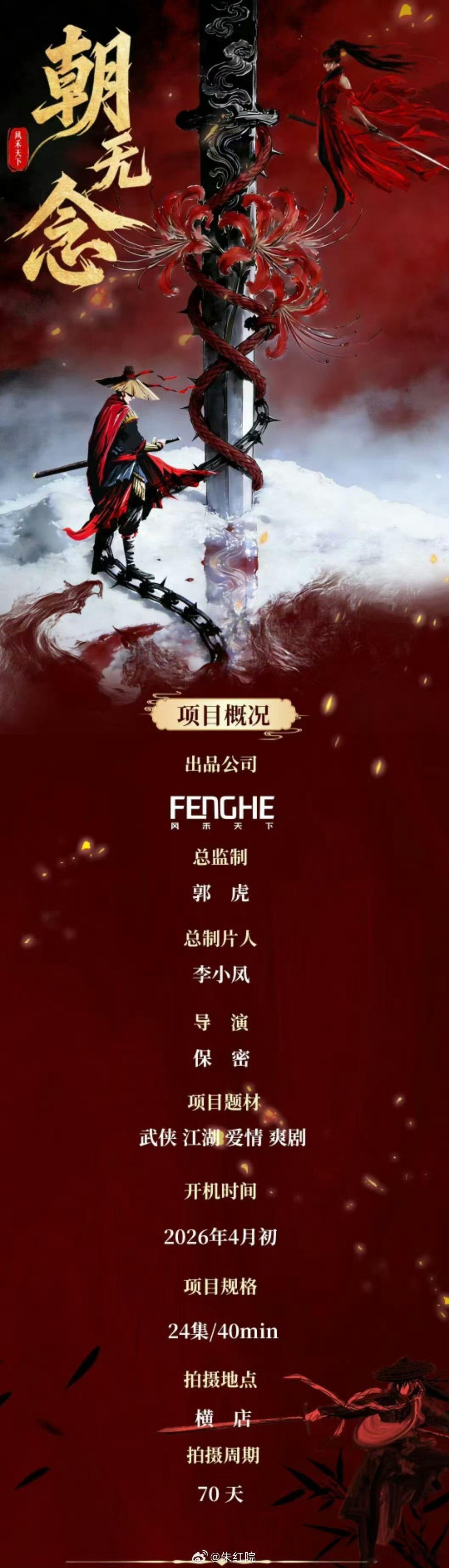 朝无念 吃🍉古装武侠剧《朝无念》4月初横店开机,拍摄周期70天。领衔主演:成毅监制:郭虎(莲花楼、沉香如屑)领衔主演:张淼怡 领衔主演:邢昭林领衔主演:加奈那 金巴 刘梦芮