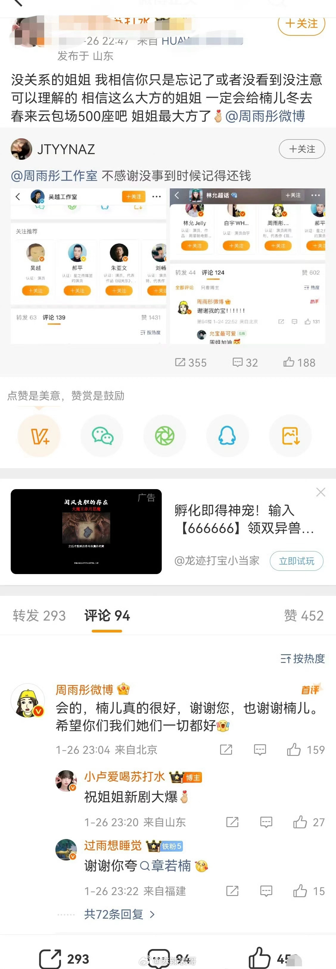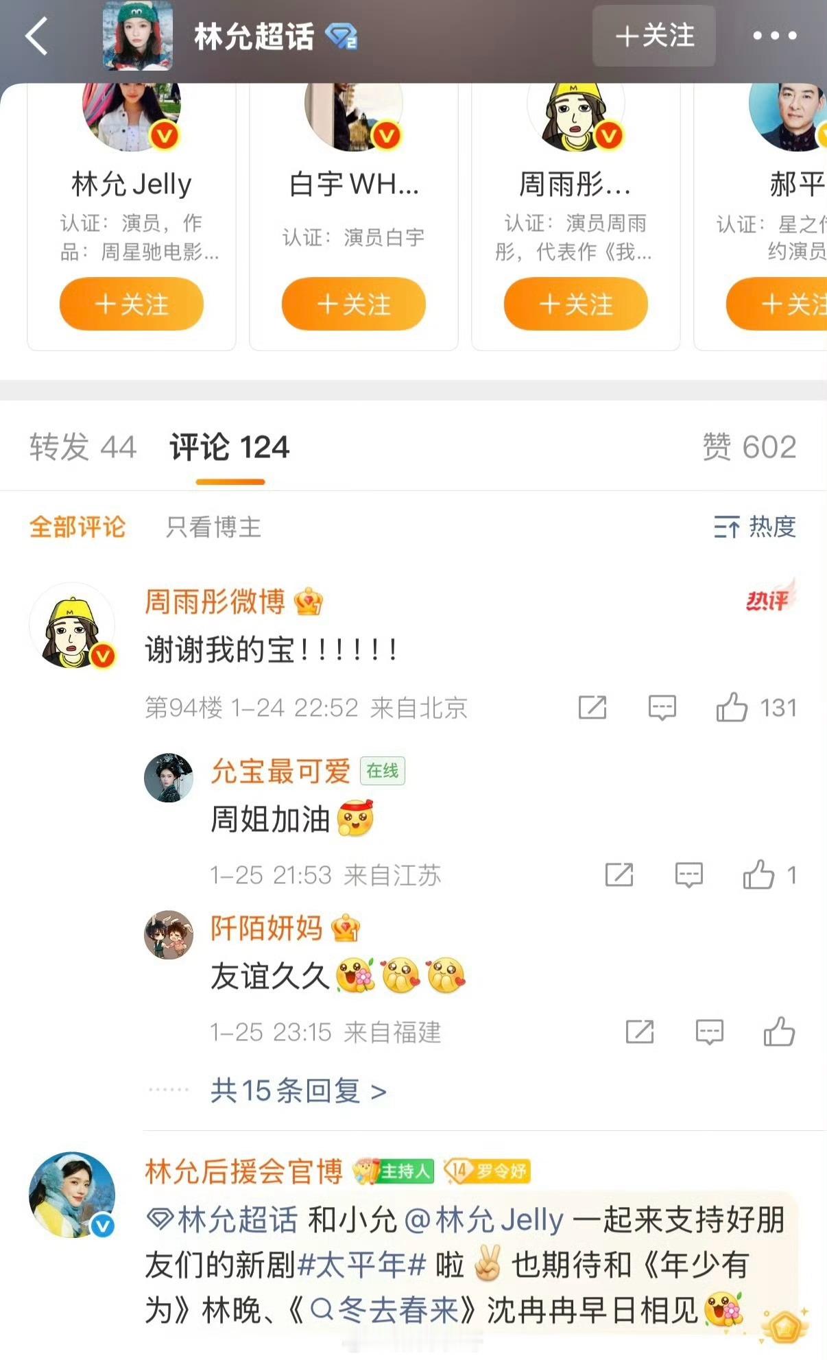 章若楠给周雨彤电视剧云包场,工作室发博宣传,周雨彤上线后感谢了林允和吴越,唯独没有感谢章若楠。章若楠粉丝控诉了三天,发微博艾特周雨彤工作室,周雨彤才回复,并包场支持了章若楠的电视剧。