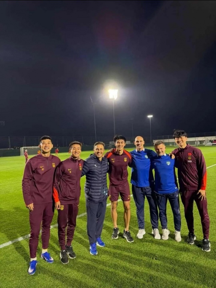 昨日热身赛,国足2-2战平卡纳瓦罗执教的乌兹别克斯坦。赛后,前广州球员刘殿座、韦世豪、吴少聪、高准翼与前广州主帅卡纳瓦罗合影留念,昔日师徒再聚首,5人曾一起夺得2019年中超冠军。