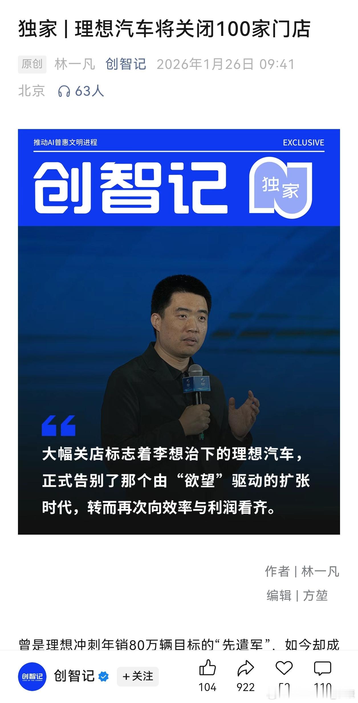 理想汽车将关闭100家门店关闭100家门店,官方至今没有出来确认,不知真假。如果真的要关闭,也符合逻辑。把收益低的门店关闭,等于降低开支,属于正常调整,没什么可说。理想汽车要真正调整是大方向,比如“要清楚知道增程不再是自己的护城河”、“友商都打进来自己的领地,如何有效反击”、“纯电车型怎么走才对”、“是不是坚持不出中低端车型,不卖15万级别SUV”、“别人乐道不是做得挺好吗”等等,把这些问题理清楚后,才能挽救销量。