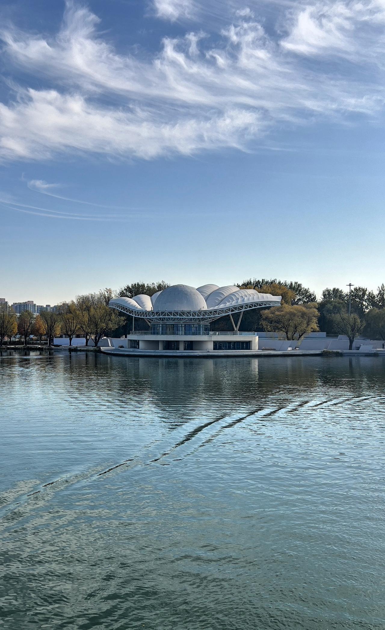 【原创】北京朝阳公园一景:水榭楼台映碧波,云卷云舒入画来。