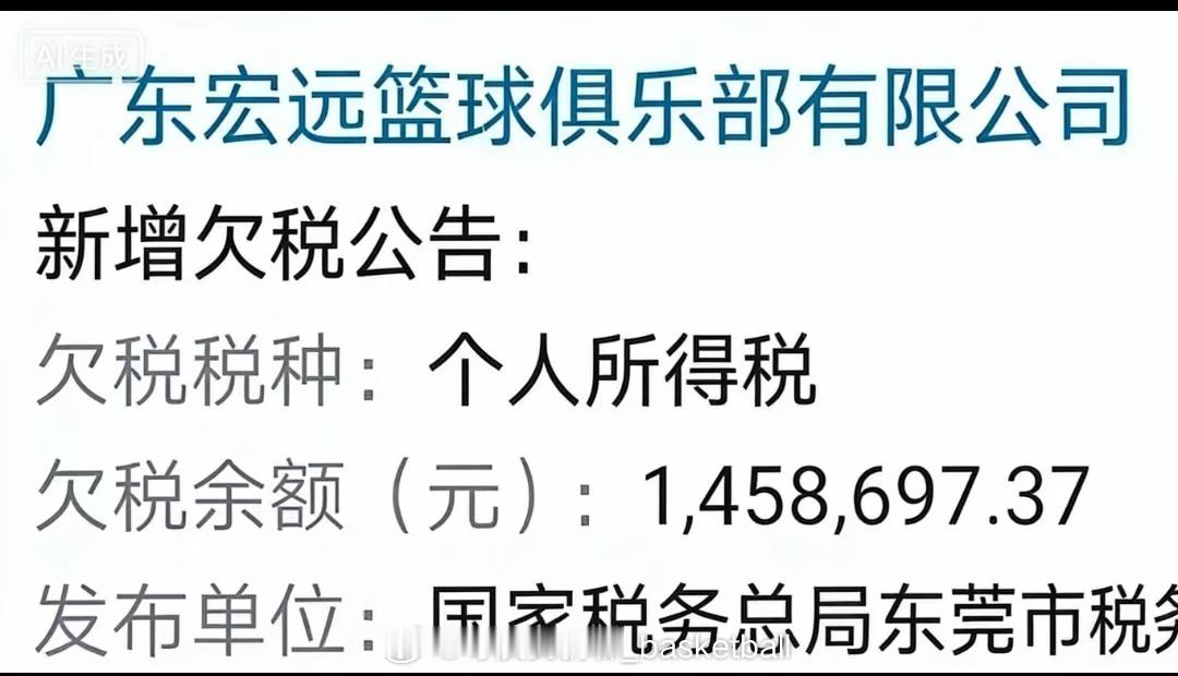 据媒体人报道,东莞税务局发布信息广东宏远篮球俱乐部欠税145.8万元,欠税税种是个人所得税