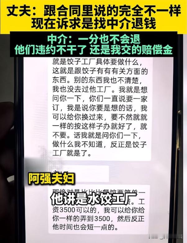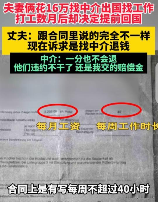 福建三明,有对夫妻听闻去奥地利打工能发家致富,即便中介费高达16万,也咬牙交了。中介帮他们办好手续,安排到奥地利一家饺子馆务工,合同约定月工资3500欧元,每周工作不超40小时。可到了奥地利,他们发现工作强度极大,每天从早8点干到半夜12点,中午都没休息。干了几个月后,夫妻俩回国找中介退钱,中介却称他们违约,还垫付了7200欧元违约金,一分不退。 (来源:第一帮帮团) 2025年5月,阿强夫妻,为改善生活,花16万中介费,通过中介阿峰去了奥地利一家饺子馆打工。合同里写着月工资3500欧元,每周工作不超40小时,夫妻俩满心欢喜,觉得发家有望。 阿强夫妻一直生活在福建三明,但收入也就那么回事,一直盼着能多挣点钱,让生活上个台阶。他们听人说去奥地利打工能发家致富,心里就开始痒痒了。 四处打听后,他们找到了中介阿峰。阿峰说得天花乱坠,说奥地利那边机会多,挣钱容易,工作还轻松。阿强夫妻听得心动不已,尽管中介费高达16万,他们咬咬牙还是交了。 交了钱,办好各种手续,2025年5月,阿强夫妻怀着满心期待踏上了去奥地利的路。一路上,他们都在憧憬着未来的好日子,想着到了那边,每个月能拿3500欧元,每周工作还不超过40小时,这日子不得美死。 可到了奥地利,现实却像一盆冷水,把他们浇了个透心凉。他们被安排到一家饺子馆打工,阿强在饺子厂打杂,妻子在附属餐馆帮忙。每天从早8点就得开始干活,一直干到半夜12点,中午连个休息的时间都没有。 阿强在饺子厂里,一会要搬面粉,一会要搅拌馅料,一会又要帮忙包饺子,一刻都不得闲。妻子在附属餐馆,要招呼客人,要端盘子洗碗,还要打扫卫生,也是忙得晕头转向。 才干了几个月,阿强夫妻就累得撑不住了。他们觉得这根本不是合同里说的那样,这哪是打工啊,简直就是卖苦力。他们商量了一下,决定回国,不能再这么干下去了。 回国后,阿强夫妻第一件事就是找中介阿峰退钱。他们觉得中介欺骗了他们,合同里说的和实际情况完全不一样,这16万中介费不能就这么打了水漂。 可中介阿峰却不这么认为。他一口咬定是阿强夫妻违约了,还说自己还为这事垫付了7200欧元违约金。他理直气壮地说,钱一分都不会退给他们。 阿强夫妻一听就急了,他们觉得中介太不讲道理了。明明是中介没按合同办事,把他们骗到奥地利去受苦,现在却反过来怪他们违约。 阿强夫妻说,合同里明确写着每周工作不超40小时,可他们在奥地利每天工作十几个小时,这明显是中介违约在先。他们要求中介退还全部中介费,还要赔偿他们的损失。 中介阿峰却说,合同里虽然写了工作时间,但实际情况可能会有变化。而且阿强夫妻自己坚持不下去回国,这就是他们违约,自己垫付的违约金就得由他们承担。 双方谁也不肯让步,调解人员来了也没办法。调解人员仔细看了合同,又听了双方的陈述,觉得这事有点复杂。合同里有些条款写得不是很明确,双方都有一定的道理。 调解人员试着从中协调,让中介退一部分钱给阿强夫妻,可中介坚决不同意。阿强夫妻也不肯妥协,他们觉得自己受了这么大的委屈,不能就这么算了。 难道阿强夫妻真的违约了吗?中介不退钱又是否合法呢? 根据民法典规定,依法成立的合同,对当事人具有法律约束力。当事人应当按照约定履行自己的义务,不得擅自变更或者解除合同。阿强夫妻和中介签订了合同,合同里明确约定了工作条件、工资待遇等内容。 从阿强夫妻的角度看,他们认为中介没有按照合同约定提供合适的工作条件。合同里说每周工作不超过40小时,可实际每天工作长达16个小时,这明显违反了合同约定。他们因为无法承受这样的工作强度而回国,并非故意违约。 从中介的角度看,他声称阿强夫妻违约,是因为他们没有完成合同规定的工作期限。但中介没有考虑到实际情况,阿强夫妻是因为工作强度过大才选择回国,这属于不可抗力或者情势变更的情况。 民法典规定,合同成立后,合同的基础条件发生了当事人在订立合同时无法预见的、不属于商业风险的重大变化,继续履行合同对于当事人一方明显不公平的,受不利影响的当事人可以与对方重新协商。 阿强夫妻可以以工作强度过大,合同基础条件发生重大变化为由,与中介重新协商。如果协商不成,他们也可以通过法律途径解决。 中介以阿强夫妻违约为由不退钱,需要有充分的证据证明阿强夫妻是故意违约,否则他的说法是不成立的。 中介称阿强夫妻违约,却没有足够的证据证明。中介垫付违约金的说法也值得怀疑,这很可能是中介为了不退钱而编造的借口。 阿强夫妻作为打工者,处于弱势地位,他们在签订合同的时候可能没有仔细阅读条款,对国外的工作情况也不了解,容易被中介欺骗。 阿强夫妻现在特别后悔,后悔当初没有把合同看清楚,后悔轻易相信了中介的话。他们想通过法律途径解决这个问题,可又不知道从哪里入手,担心打官司要花很多钱,还不一定能赢。