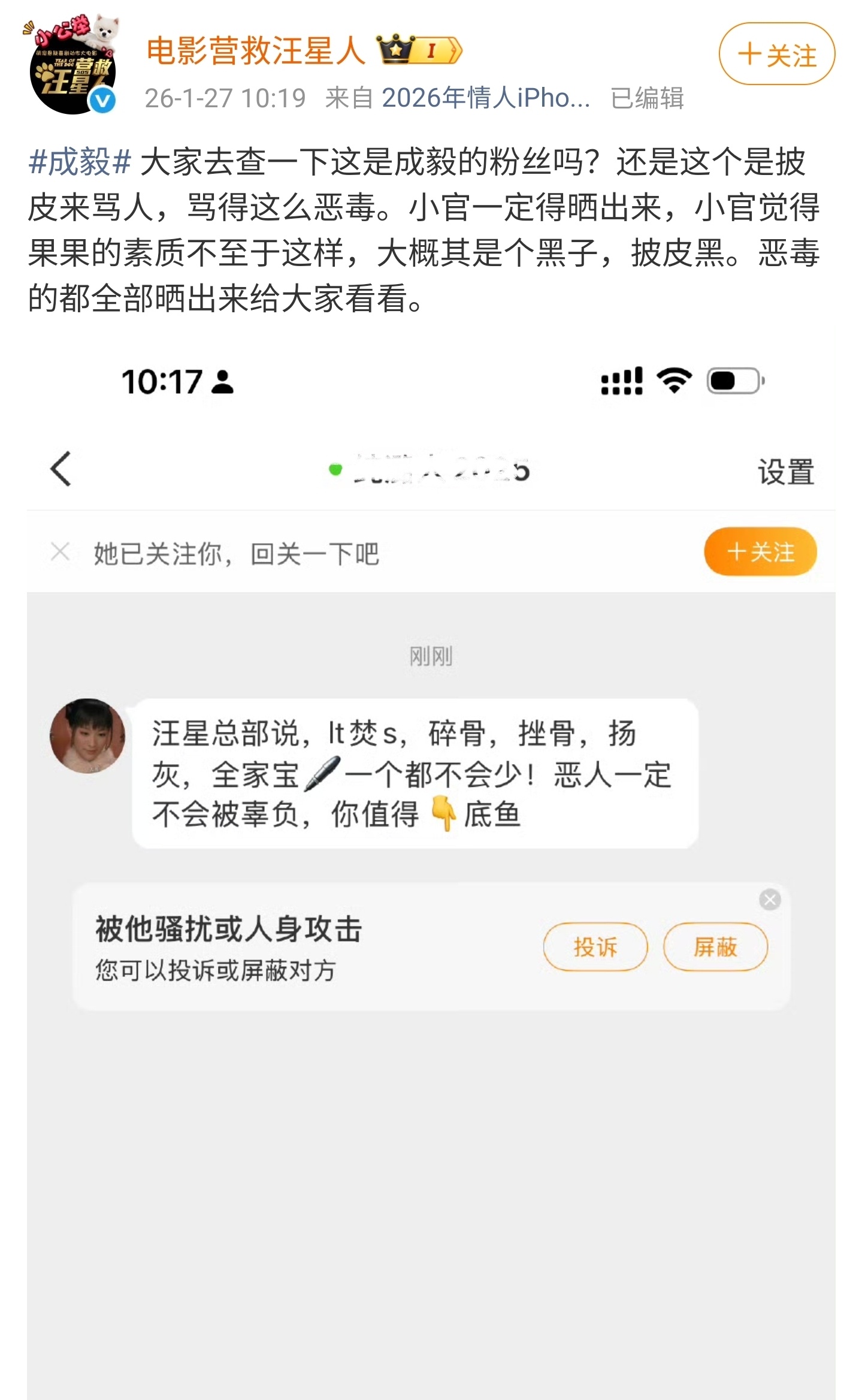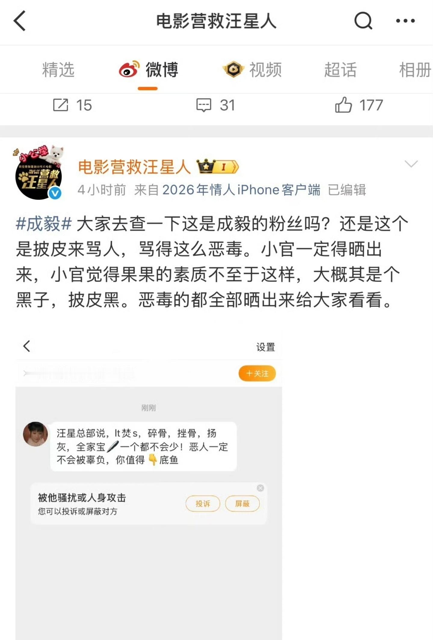 官号挂素人引众怒了。《营救汪星人》这波操作太败好感。1月27日,《营救汪星人》的官号这波操作把所有人看懵了。好好一个电影宣传号,不好好搞物料,反倒下场挂起了素人聊天记录,还点名内涵成毅粉丝。先不说对方到底是不是真粉丝,就算是“披皮黑”,你一个官方账号直接挂素人、贴聊天记录的行为,已经涉嫌侵犯隐私、违反平台规则了吧?本来宣传电影是正事,现在非要下场引战,把饭圈那套撕逼逻辑搬上台面,到底是想炒热度还是想毁口碑?评论区里路人都看懵了:“官号这么玩真的合规吗?”“挂素人太掉价了吧!”本来大家对萌宠电影还挺有好感,这下直接败光路人缘。说到底,官方账号该有个官方的样子,靠撕逼博眼球只会反噬自己。真要维权可以走正规渠道,别拿“挂人”当武器,不然电影还没上映,先把路人缘作没了,这波血亏啊!