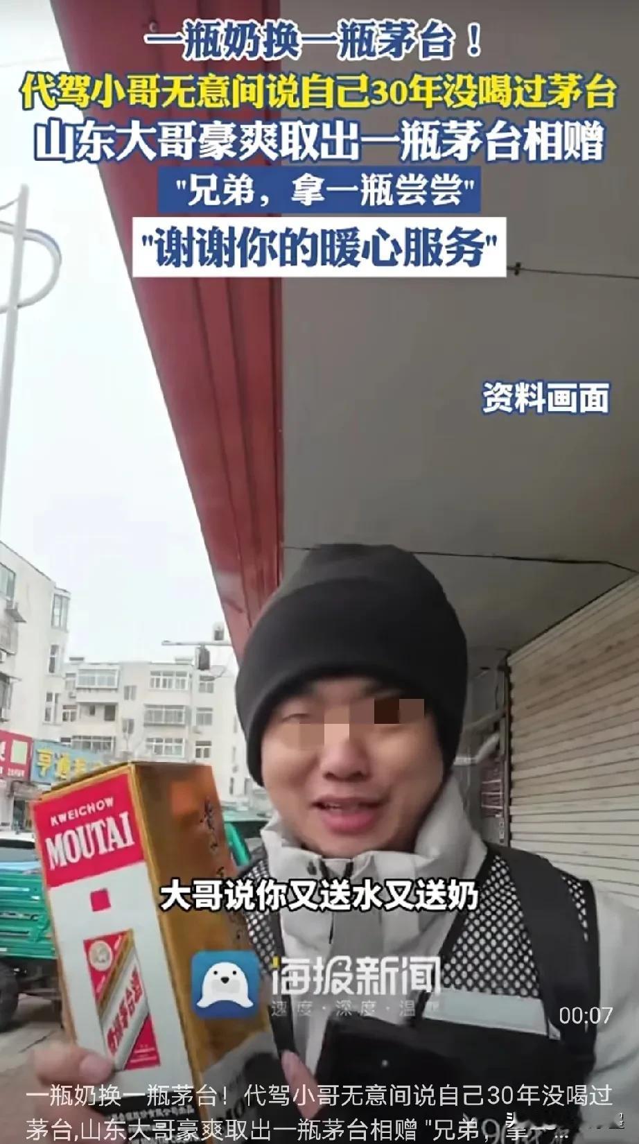 代驾小哥30年没喝过茅台,山东大哥帮他圆梦了! 起因是,山东一位大哥因为喝酒了,散场回家时便叫了一位代驾,看到这位大哥喝的很多,代驾小哥便随手递给大哥一瓶酸奶,让他缓解一下! 走到半道,大哥身体不舒服想吐,代驾小哥便暖心的跑到路边商店买了一些矿泉水和火腿肠给大哥。 期间与大哥聊天时,无意说出自己活了30年了还没喝过茅台呢,言语间充满了对生活的无奈! 让人意外的是,把大哥送到家时,大哥直接从后备箱掏出一瓶茅台送给了代驾小哥,说:代驾费不给你了,送你一瓶茅台尝尝! 代驾小哥连忙表示拒绝,这一单3公里也就20块,想着大哥可能是喝醉了,于是先收下了,第二天再给大哥送过去! 可是第二天当他再次联系大哥的时候,大哥表示:自己当时意识很清醒,之所以送给你这瓶茅台酒,是被你在路上细心的关怀暖到了,这瓶酒就是你的,你拿着喝吧! 代驾小哥打算把这瓶酒带回家,过年的时候跟家里人一块品尝! 这位山东大哥太场面了,暖心的帮一个陌生人圆了梦![赞][赞][赞] 说实话,有多少人活了30年没喝过茅台,有的人甚至一辈子都没尝过茅台什么味,虽然茅台现在降价了,有几个普通人舍得花一千多给自己买一瓶喝啊! 欢迎大家留言,讨论一下自己喝过最好的酒是哪一款,谢谢!