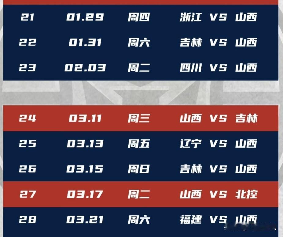 等着我!山西汾酒男篮新外援登场倒计时! 张宁伤休6-8周,复出时间最迟到3月16日左右,大概会错过9场比赛。目前已经错过3场比赛,春节前还需要错过3场比。春节后可能会错过3-4场比赛。 焦海龙伤休4-6周,复出时间最迟为3月3日左右。大概率会错过6场比赛。目前已经错过3场比赛,春节前还需要错过3场比赛,春节窗口期过后就能复出。不会耽误3月11日的首场比赛。 春节前,也就是今天起,山西汾酒男篮还有连续三场客场比赛。明天兵发杭州,1月29日挑战风头正劲的浙江稠州金租男篮。然后北上东北吉林,1月31日与长白山恩都里交手。之后南下飞抵成都,2月3日与四川丰谷酒业男篮过招。 这就是山西汾酒男篮春节前的赛程了。春节前的这三场比赛,大概率盖伊会出场,随着焦海龙和张宁的逐步复出,春节后第二阶段的18轮常规赛还很漫长,还有的打。等着我!