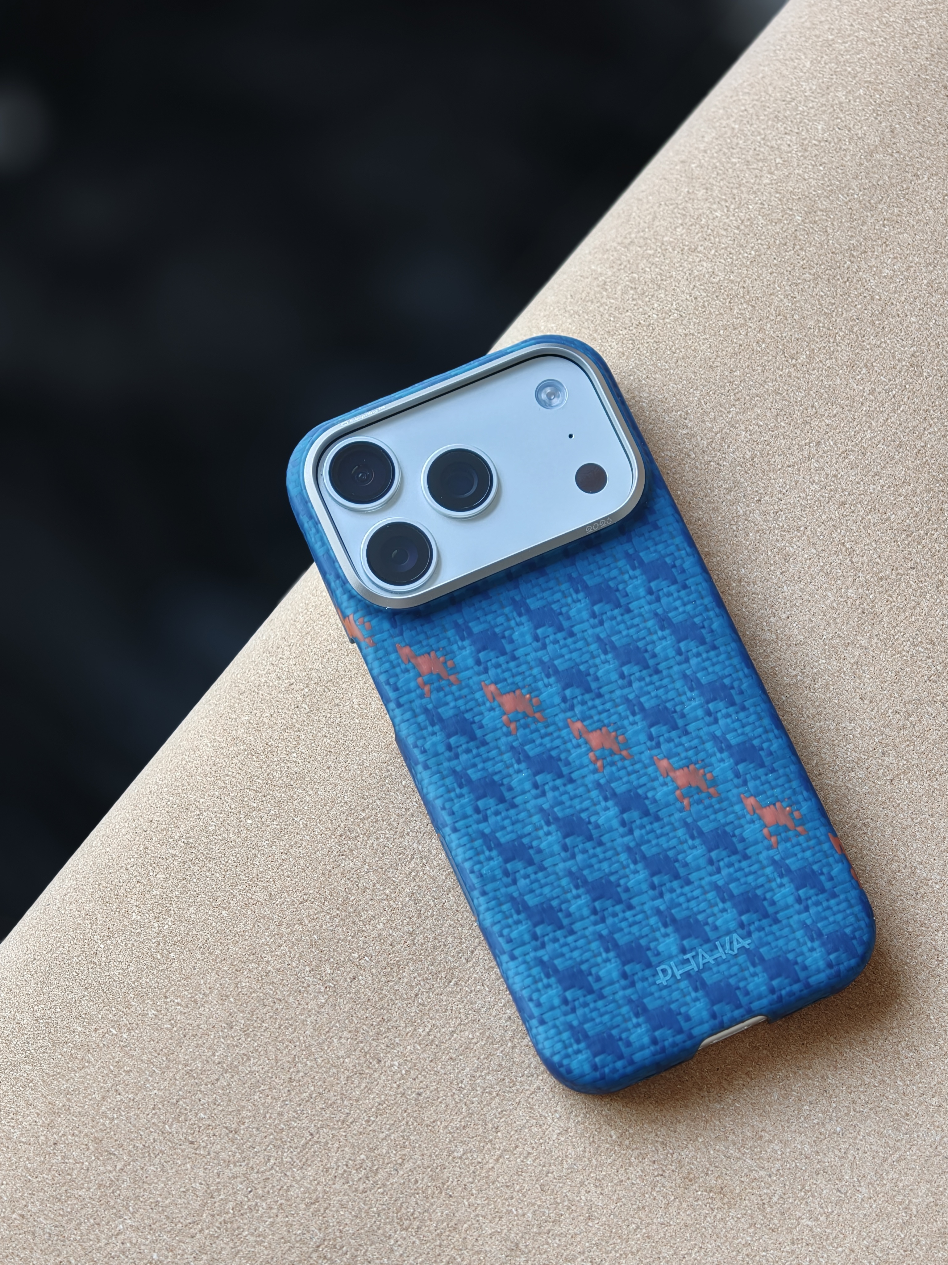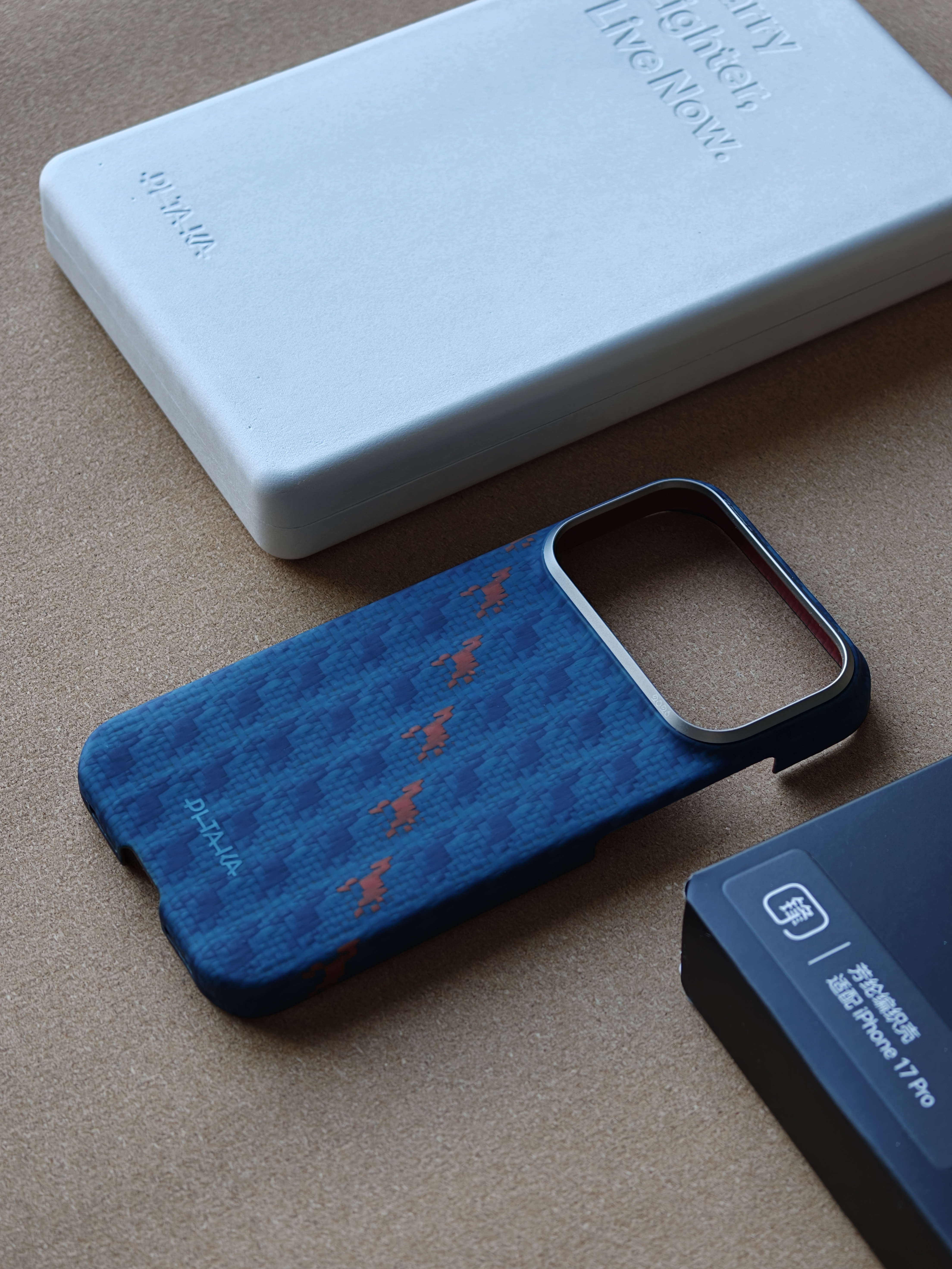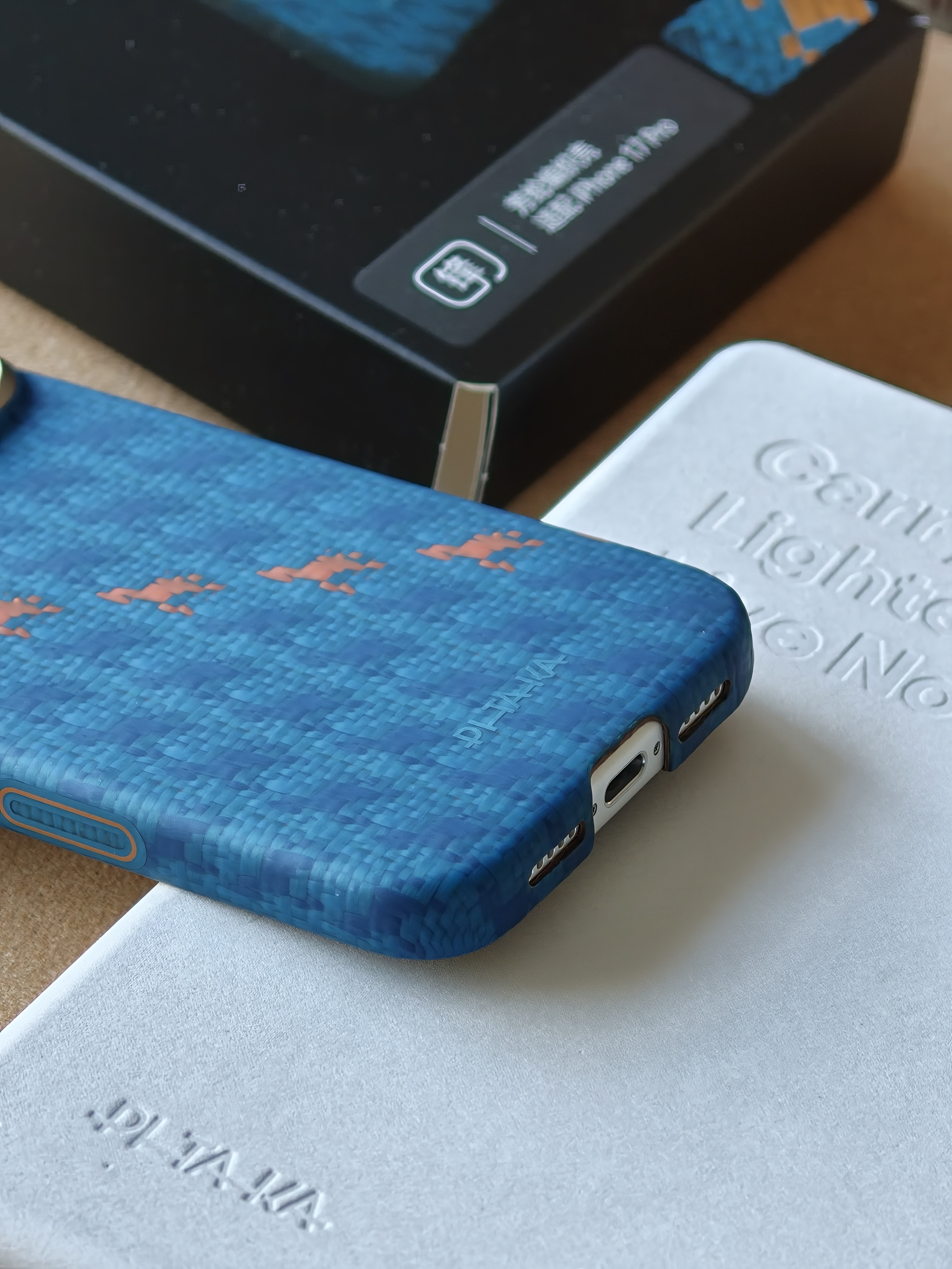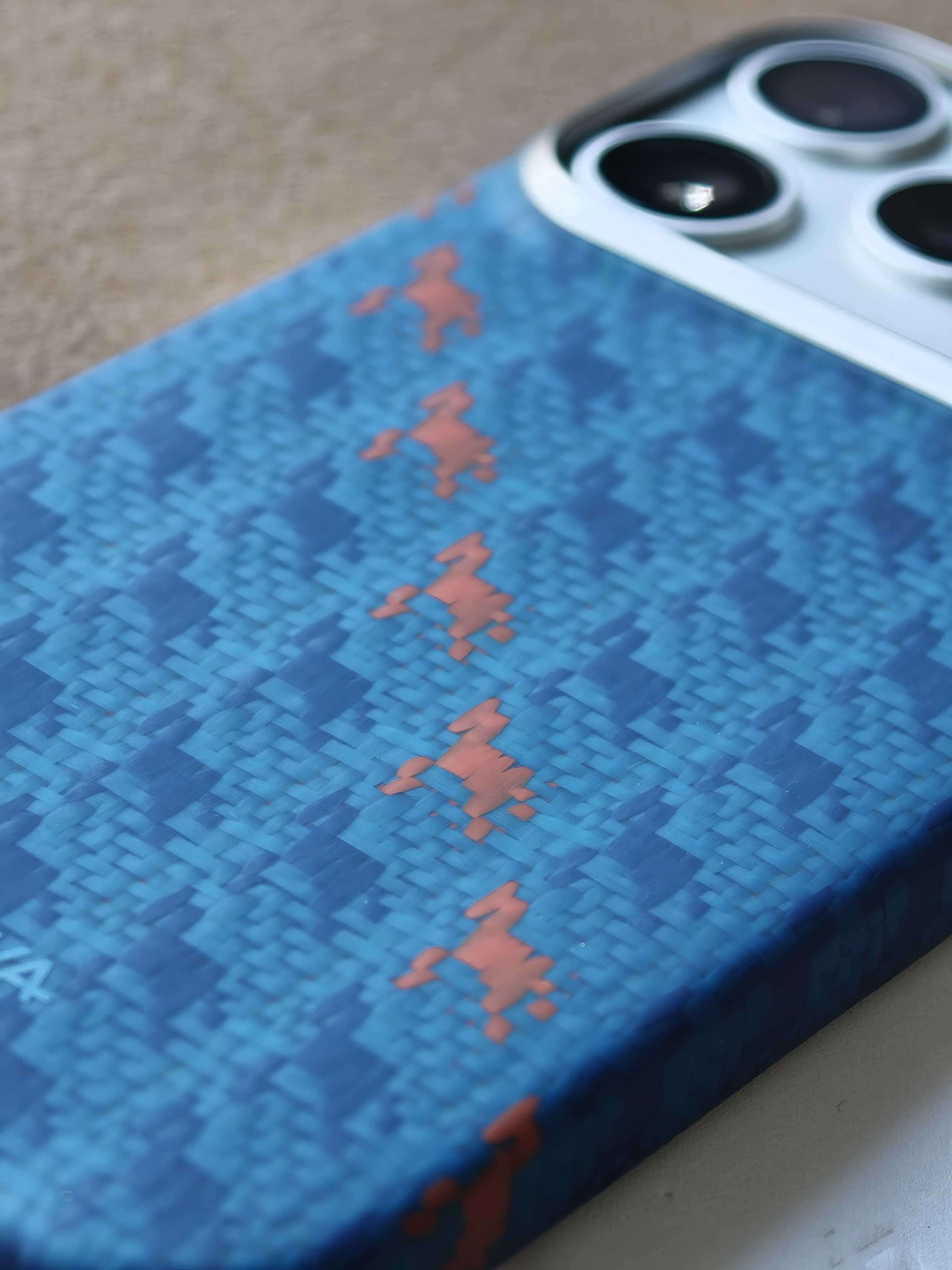 PITAKA 骉骉跃岁·马年限定iPhone 17 Pro 手机壳开箱自费 459 购入, 壳背面是很多个抽象小马的图案,像织毛衣一样用凯夫拉材质编织而成。复杂编织的手机壳有一个缺点就是会厚一些,这个马年限定也逃不过,Pro 重量26g,大家可以做个参考。浅蓝色不容易沾手印,适合手汗党,蓝色中间有一丝橙色小马作为点缀,挺点睛之笔的,背面几乎没有什么颗粒感,更多的是图案编织出来的起伏感。整体边缘细节处理蛮好的。PITAKA作为老牌凯夫拉厂还是有点东西在的,现在做的产品越来越偏年轻、时尚化了。