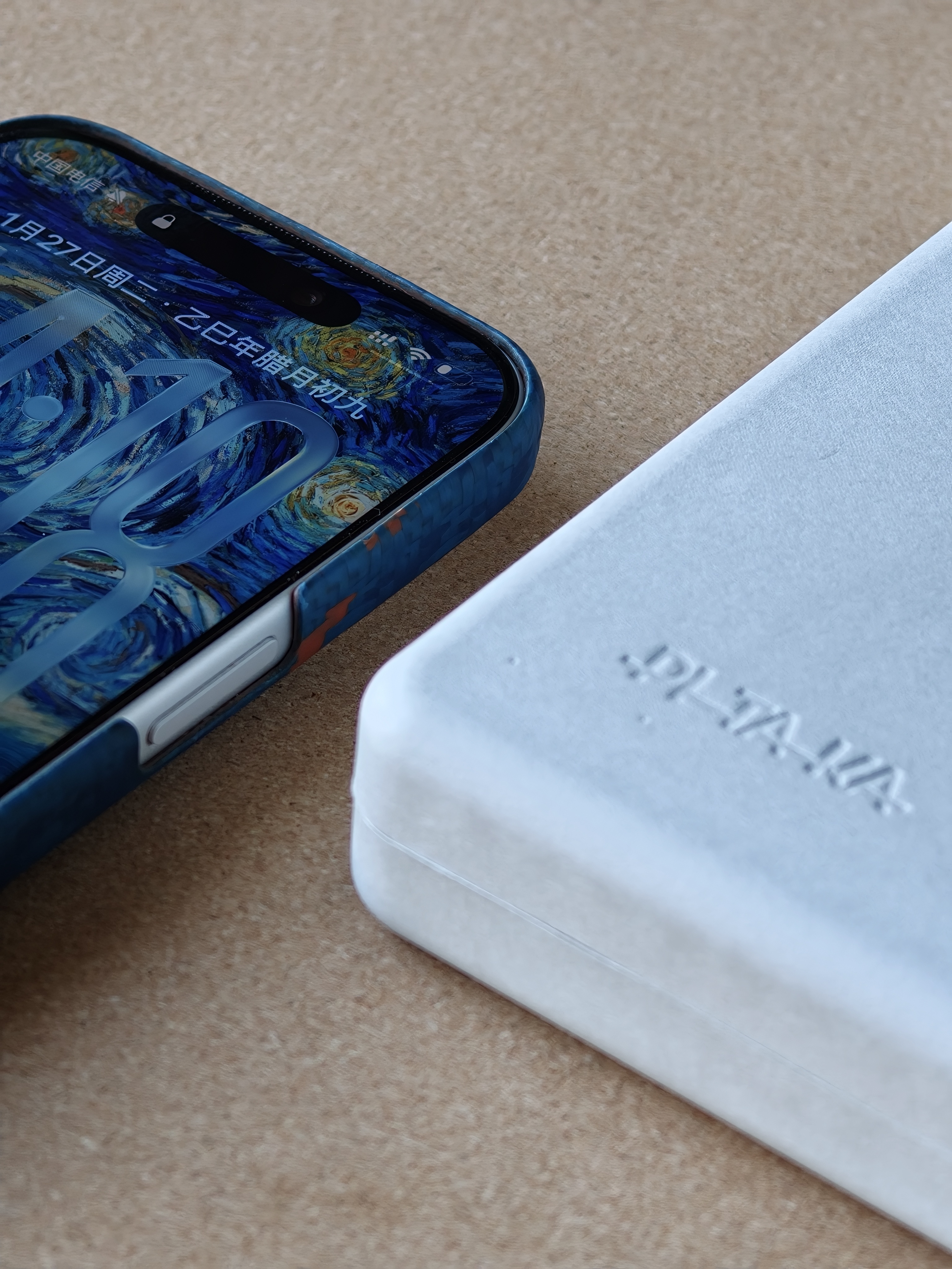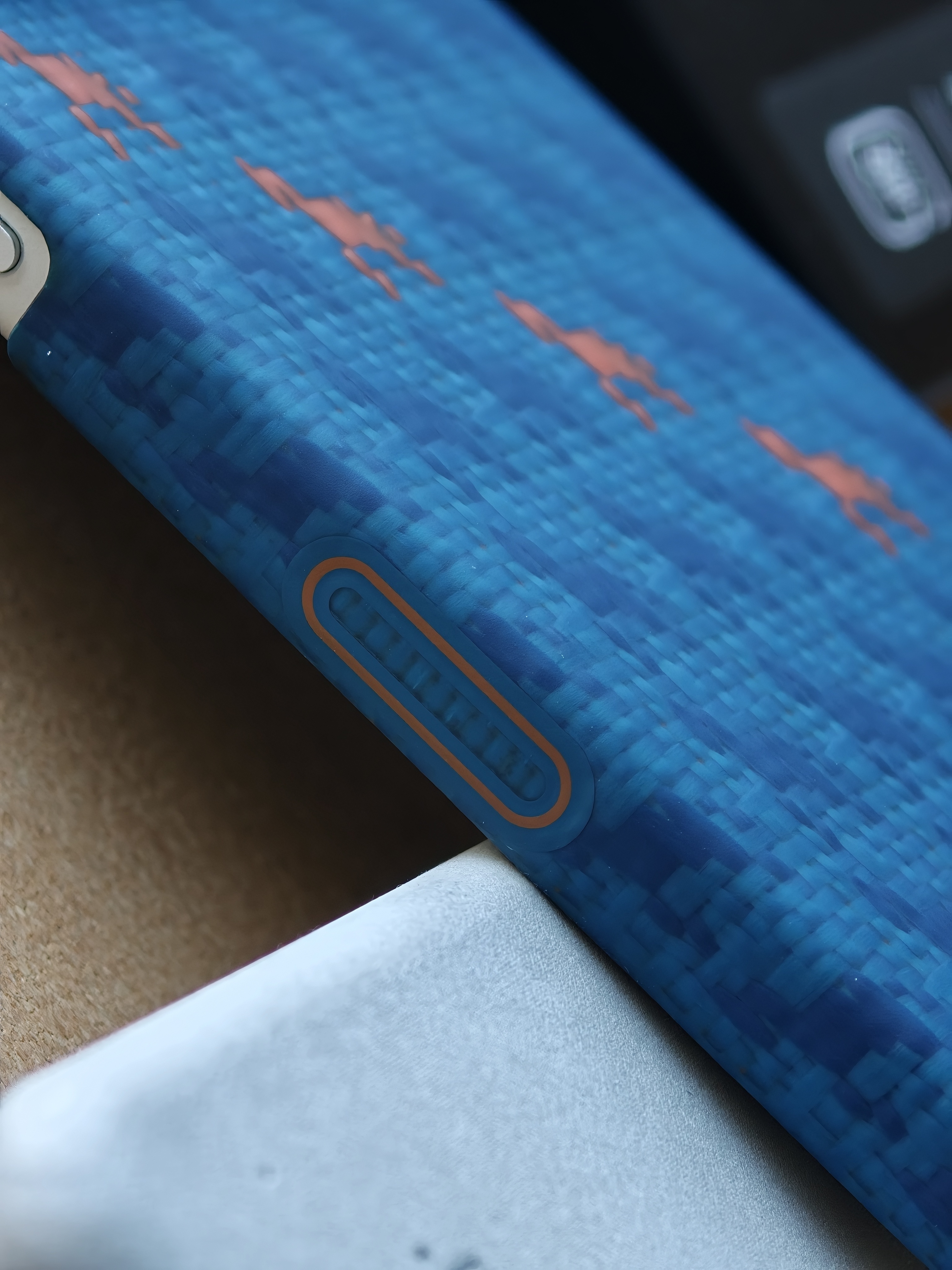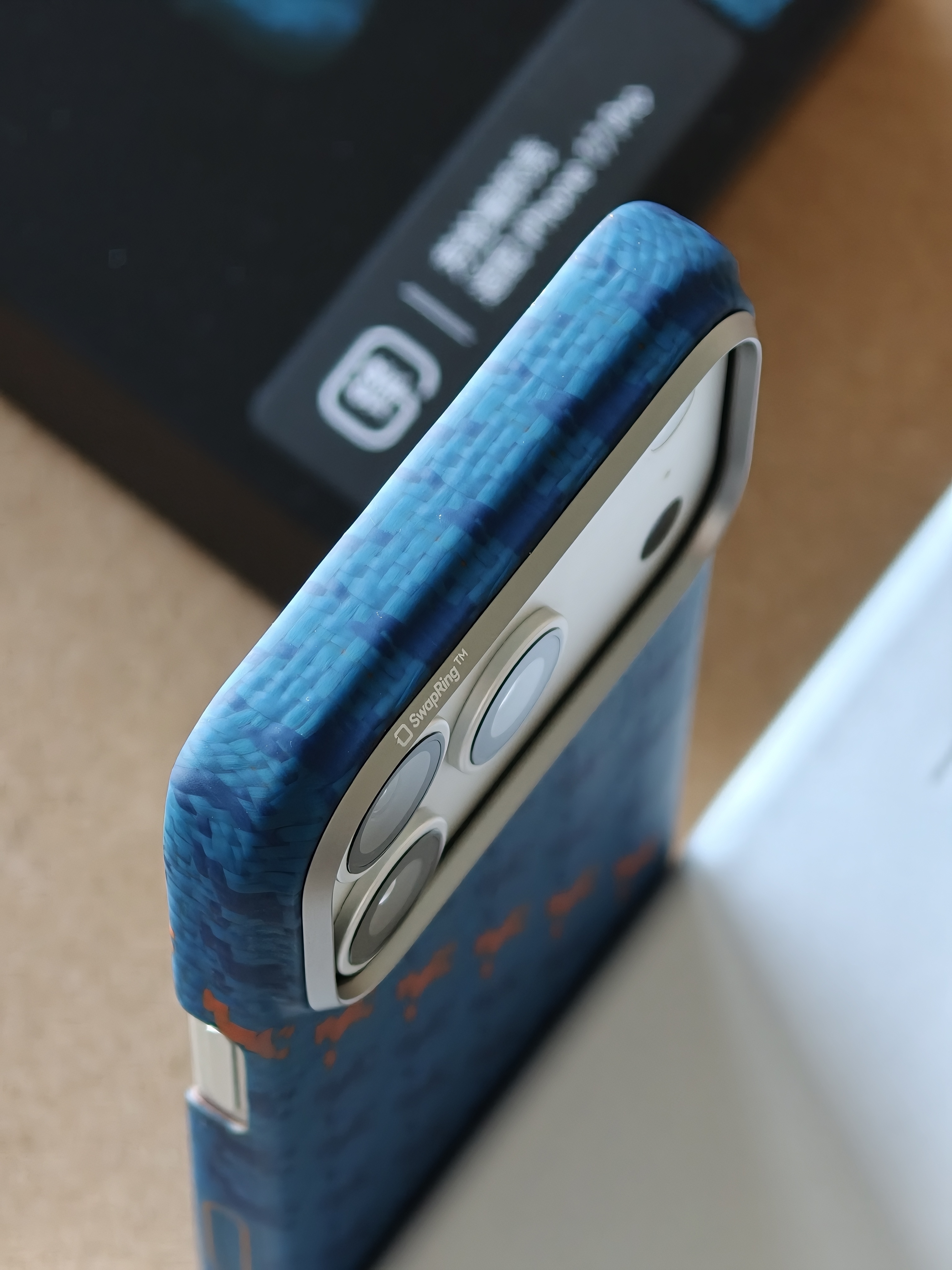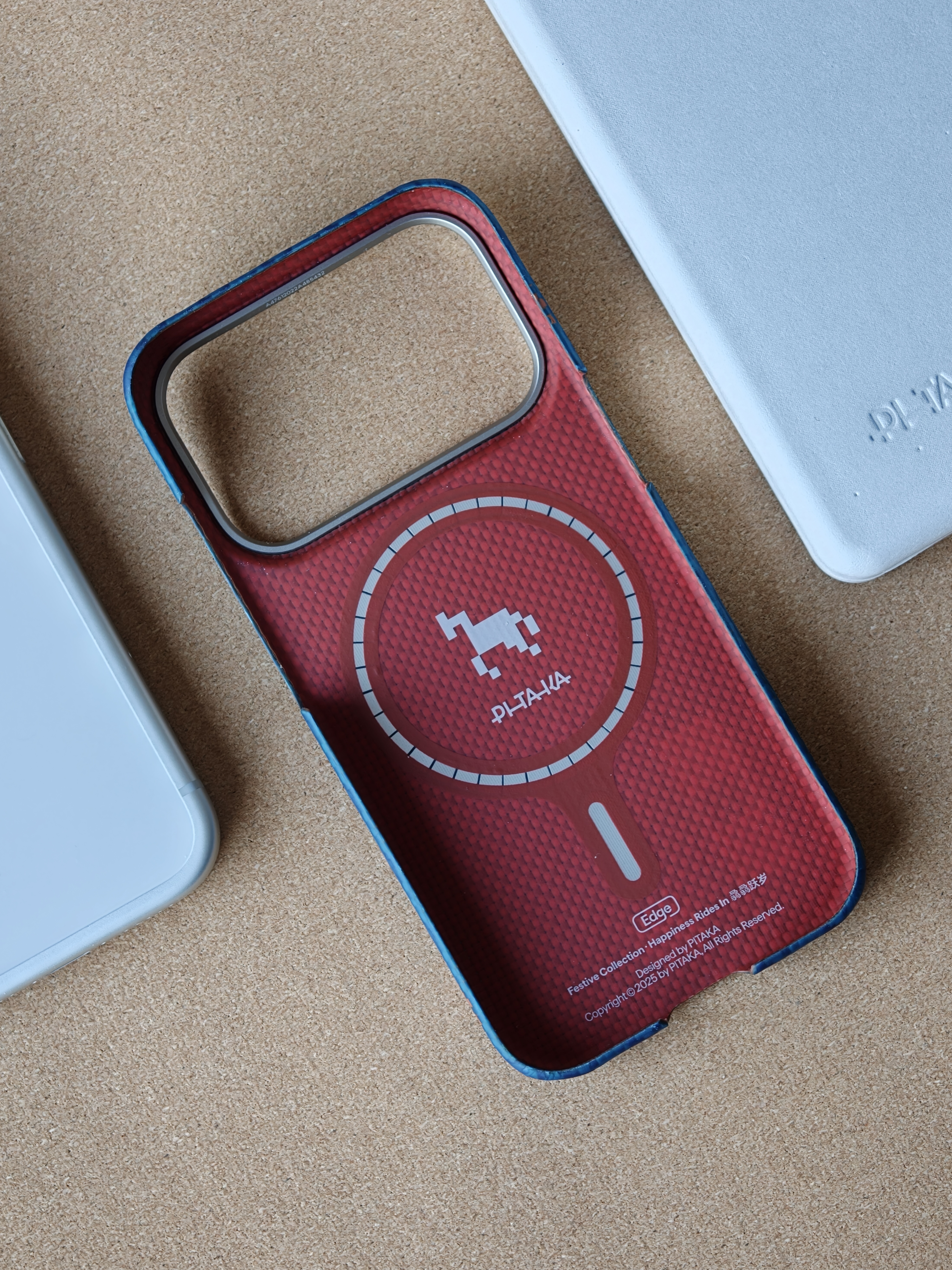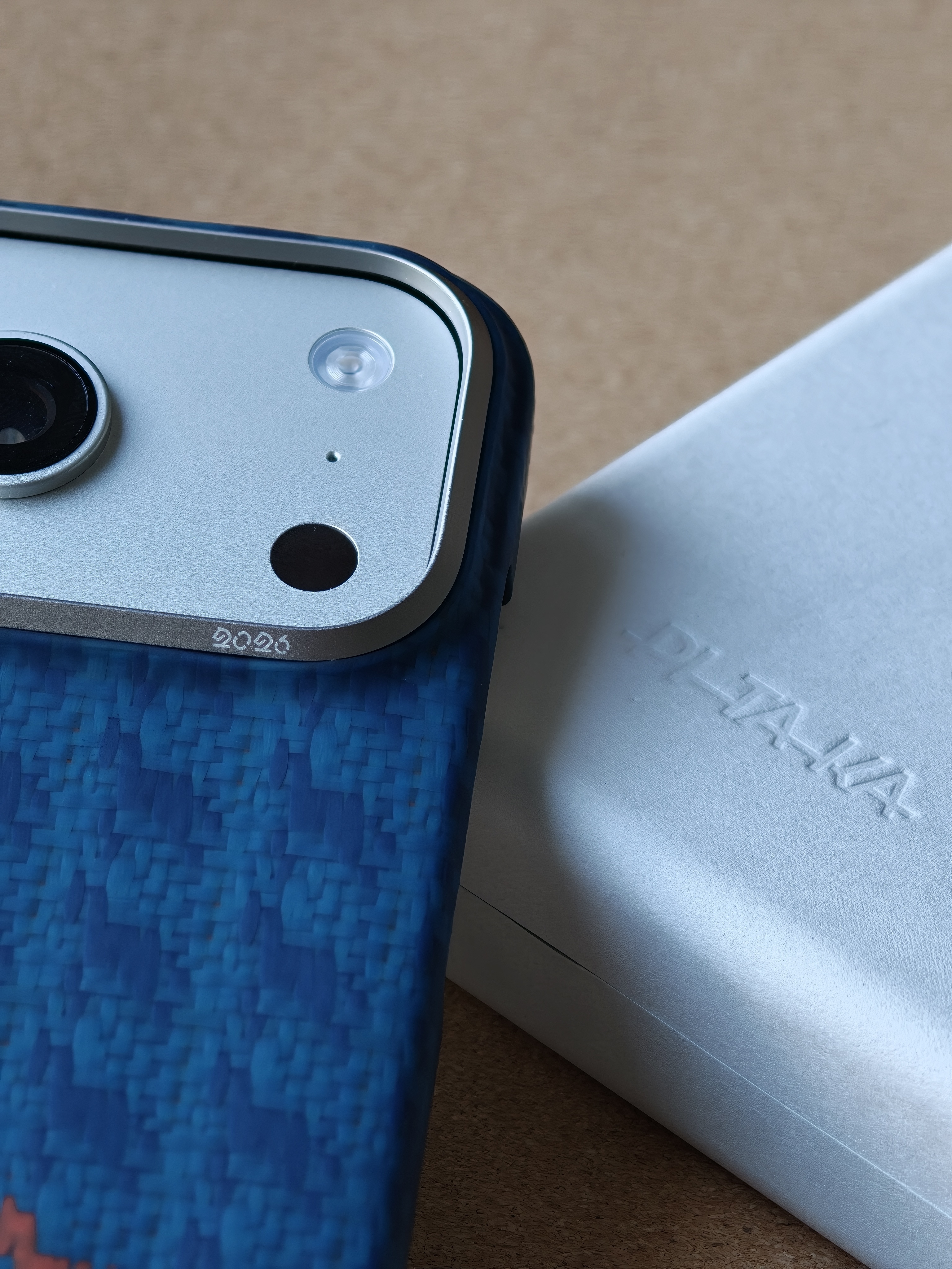 PITAKA 骉骉跃岁·马年限定iPhone 17 Pro 手机壳开箱自费 459 购入, 壳背面是很多个抽象小马的图案,像织毛衣一样用凯夫拉材质编织而成。复杂编织的手机壳有一个缺点就是会厚一些,这个马年限定也逃不过,Pro 重量26g,大家可以做个参考。浅蓝色不容易沾手印,适合手汗党,蓝色中间有一丝橙色小马作为点缀,挺点睛之笔的,背面几乎没有什么颗粒感,更多的是图案编织出来的起伏感。整体边缘细节处理蛮好的。PITAKA作为老牌凯夫拉厂还是有点东西在的,现在做的产品越来越偏年轻、时尚化了。
