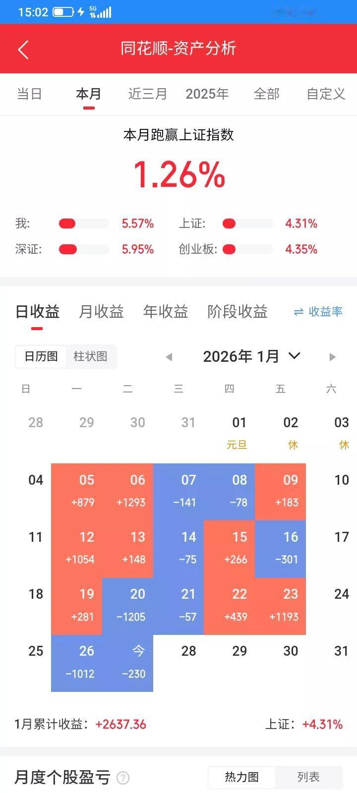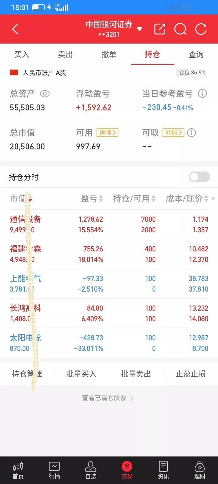 2026.01.27,今天又是指数跌宕起伏的一天,上蹿下跳的,波动剧烈,但是最终还是强势收红,我持有的股票都大跌,赚了指数,亏了钱,赚了一个寂寞。 仓位太轻了,早上怕踏空了,没有管住手,又冲到购买了一些,基本上都买错了,多亏了一百多块钱,还是应该管住手,按照规则做,至少可以少亏一点。 金森昨天涨停破板,收盘拉起来原来是诱多,早知道卖完了就好了,今天就不会亏那么多,早上直接跌停开盘,跌停了当天就不可能再下跌,反正仓位太轻,就买一点吧,12.06买入100股,买对了,没有一直封住跌停,收盘前又追高以12.48追高买入100股,收盘以12.37再买入100股,几分钟又多亏了11块钱,贪心怕买不到了,今后错过了就算了吧,还是收盘买,至少不会再下跌了。 太阳跳空低开,预估应该会反弹了吧,集合竞价以9.10买入100股,但是判断错了,买在最高价,又是大跌,收大阴线,放弃幻想,收盘以8.70卖掉100股,多亏了41块钱。值得庆幸的是昨天收盘卖掉一些,不然还要亏得更惨。 上能也是一样,大幅低开反弹一点点,继续下跌,怕完全踏空了,开盘集合竞价以38.78买入100股,又套在高位了,最低跌到36.65才触底反弹,而且反弹力度也不大,最多的时候又多亏了200多块钱,收盘拉起来一些,继续等待,留下这100股做底仓,涨跌从容。还是等待阳线再重新重仓了吧。 长鸿继续下跌,收阴线,继续观望等待,因为留有底仓,又多亏了几十块钱。 通信设备etf今天低开高走,偏偏这只没有买,就上涨,预估会收阳线,反弹上涨一路追着买,都没有追上就拉高到1.360了,怕完全踏空了,回落以1.354买入1000股,买入之后总于下跌了,下跌中以1.345再买入2000股,成交之后继续下跌了一点点,就反弹上涨了,收盘收阳线,还是按照计划重新买回来,收盘以1.357再买回来2000股,昨天1.323卖掉,又是低卖高买。成本增加了,但是避免了继续下跌的风险,不下跌就再买回来,下跌就再卖掉吧,总有一次会买对的。 昨天止损了互联网etf,今天也反弹了,总是和我对着干,放弃它了。 今天没有管住手,不然亏得少一点,还好昨天收盘卖掉了大部分,亏得少一点了。 今天总市值2.05万元,总资产5.55万元,今天总体账户亏损232元。