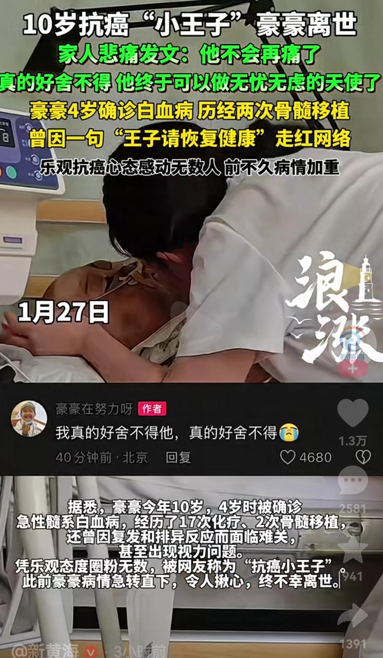 泪目了!那个被全网叫“抗癌小王子”的豪豪,那个4岁确诊白血病、扛过17次化疗、2次骨髓移植的10岁小男孩,于1月27日,因抢救无效,还是永远地离开了我们。 家人在他的账号里写:“他不会再痛了,他曾经和我说过他是天上来的天使,那他一定是回天上继续做无忧无虑的小天使了吧。” 我第一次刷到豪豪的视频,是他躺在病床上,举着小手奶声奶气地说:“王子,请恢复健康!” 当时我就被这个小家伙逗笑了,又心疼得不行。明明是被病痛折磨得连路都走不稳的孩子,却用最可爱的方式给自己打气。 6年里,他经历了数不清的骨穿、腰穿、化疗,头发掉了又长,长了又掉,甚至连眼睛都因为排异反应看不清东西。 可他对着镜头永远是笑嘻嘻的,会比耶,会撒娇,会用稚嫩的声音安慰难过的妈妈:“我没事的,过几天就好了。” 我们总说“成年人的世界没有容易二字”,可豪豪的世界里,从来没有“容易”这两个字。他却用小小的肩膀,扛下了所有,还把乐观和温暖留给了我们。 原来最痛的告别,是“他终于不用再痛了” 我们总以为来日方长,却忘了世事无常 豪豪的故事,像一记重锤,敲醒了我们这些在生活里麻木的成年人。 我们总在抱怨工作太累、生活太苦,却忘了健康的活着,就是最大的福气。我们总在和家人拌嘴、和朋友冷战,却忘了明天和意外,不知道哪一个先来。 豪豪用他短暂的一生告诉我们: 别把“等一下”“下次吧”挂在嘴边,想爱的人现在就去抱,想说的话现在就去讲。 最后,希望他一路走好,天堂没有痛苦和疾病!