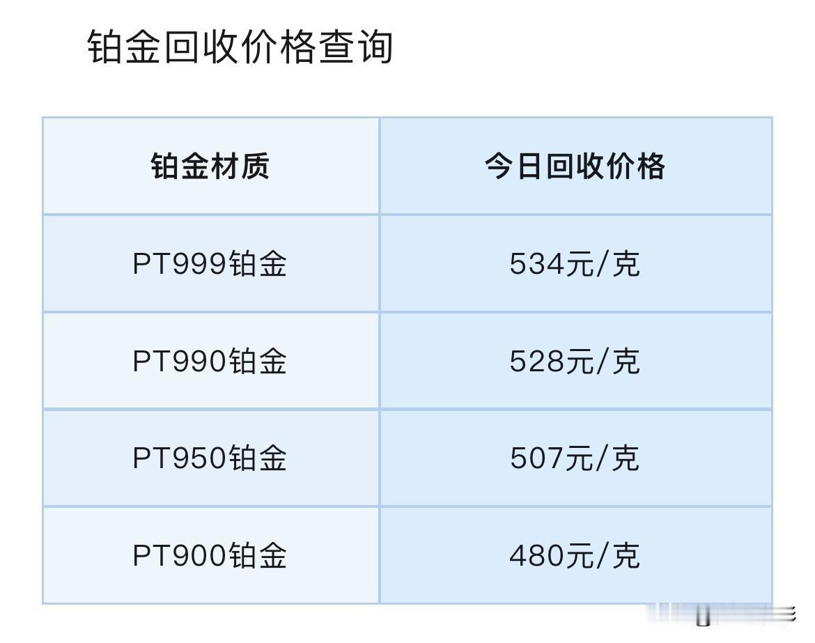 今日铂金、钯金报价!有所回落! 今天铂金、钯金回收价格可以查看了!先来看看,今天铂金、钯金回收价格及报价多少钱一克了? PT999铂金534元/克,PT990铂金528元/克,PT950铂金507元/克,PT900铂金480元/克。 同昨日铂金回收报价相比较,今天铂金回收价格都整体大降了。 PT999铂金回收价格下降了54元/克,PT990铂金回收价格也下降了54元/克,PT950铂金回收价格下降了51元/克,PT900铂金回收价格下降了49元/克。 再看看,钯金回收价格是多少钱一克? Pd999钯金369元/克,Pd990钯金365元/克,Pd950钯金350元/克,Pd900钯金332元/克。 同昨日钯金回收报价相比较,今天钯金回收价格同铂金一样也都整体下降了。 Pd999钯金回收价格下降了18元/克,Pd990钯金回收价格也下降了18元/克,Pd950钯金回收价格下降了17元/克,Pd900钯金回收价格下降了16元/克。 根据黄金网消息: 在避险升温、美元持续下跌以及强势买盘支撑下,今日金价银价上涨又爆了再创新高,现货黄金单日飙升超100美元并强势突破5110美元关口。 现货白银强势突破113美元关口,现货铂金一度攀升至2917.8美元! 不过在纽约尾盘的时候,受获利了结的影响,贵金属价格集体冲高回落,黄金白银基本上回吐日内大部分涨幅,而铂金钯金由上涨转为下跌。 截至今日:现货黄金上涨0.44%至每盎司5008.5美元,现货白银上涨0.44%至每盎司103.6美元,现货铂金下跌0.34%至每盎司2757.4美元,现货钯金下跌1.74%至每盎司1996.7美元。 黄金实时价格1121.6元,白银实时价格26.5元,铂金实时价格562.9元,钯金实时价格434.8元。 铂金回收有这以下4个知识点,特别的重要,谨防上当吃亏。 第一,铂金回收是不需要发票和以前的购买凭证的。如果有人跟你说因为没有发票要扣你手续费,那他一定是在坑你。 第二,铂金回收是没有折旧费一说的,不管你是戴了几十年还是刚刚买的,回收的时候只看重量和纯度,只要纯度是3个9以上的,回收价格都是一样的。 第三,卖之前一定要知道自己首饰的精准克重,以防被其他人偷秤。 第四,铂金回收就是按照当天的国际金价减个几块钱一克回收,所以要提前查一下当天的国际金价。 只要注意这4点,根本没有人能够坑得到你。 最后说声,所有信息,都只是提供参考价值! 投资有风险,理财需谨慎!铂金行情分析 白银铂金回收 钯金价格 钯金市场 铂金价格 铂金回收行情 铂金价格波动