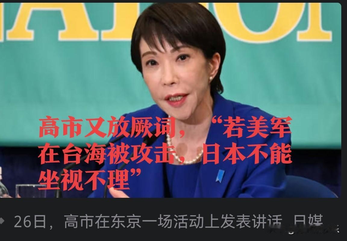 日本首相高市再就台海放厥词,扬言“不能坐视美军被攻击” 据外媒报道日本首相高市早苗在台海问题上的挑衅言论持续发酵。1月26日,她参加朝日电视台节目时宣称,若美军在台海遭攻击而日本未回应,美日同盟将“崩溃”。她强调“需救援日美公民”,并称将在法律框架内“全面判断”局势。此前,高市抛出“台湾有事即日本有事”论调,导致中日关系恶化,日本经济已遭反噬。 同日,高市在日本记者俱乐部辩论会上被问及对华关系时,表示“将考虑直接对话以阐明立场”,态度看似“积极”。但日媒质疑其言论实为转移国内矛盾。 高市近期宣布解散众议院,提前举行大选,并放话若执政联盟未获半数席位将辞职。分析认为,此举或为谋求党派利益,但激进对华政策已引发广泛担忧。
