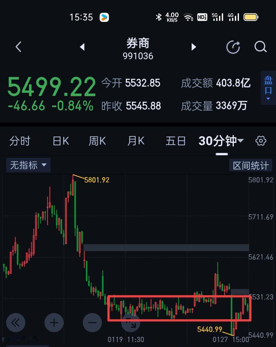 券商板块,由于5531的破坏,随后展开了三十分钟一笔下的调整。在图〈1〉结构中用五分钟同级别分解,低点5540开启的五分钟一笔上又回到了5532,所以5531并未有实质性的效破坏。明天如果能有效站稳5440上方,今天的低点5440可以暂当图〈2〉五分钟中枢的盘整背驰的一买点。如果后市5440的一买点能得到进一步确认,围绕图〈3〉的三十分钟中枢二买点将会形成。后面不排除由此衍生出券商板块的反转(前面文章中一直强调的是反弹,今天大胆用反转阐述,后市5440不被破坏是关键)行情。