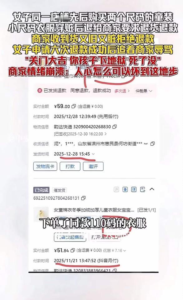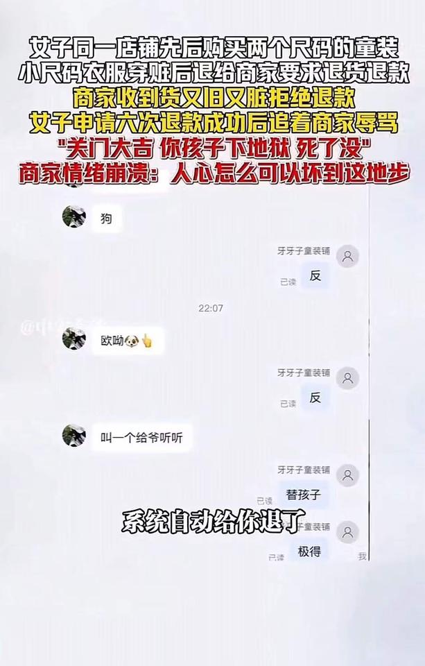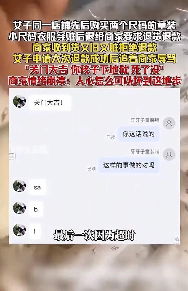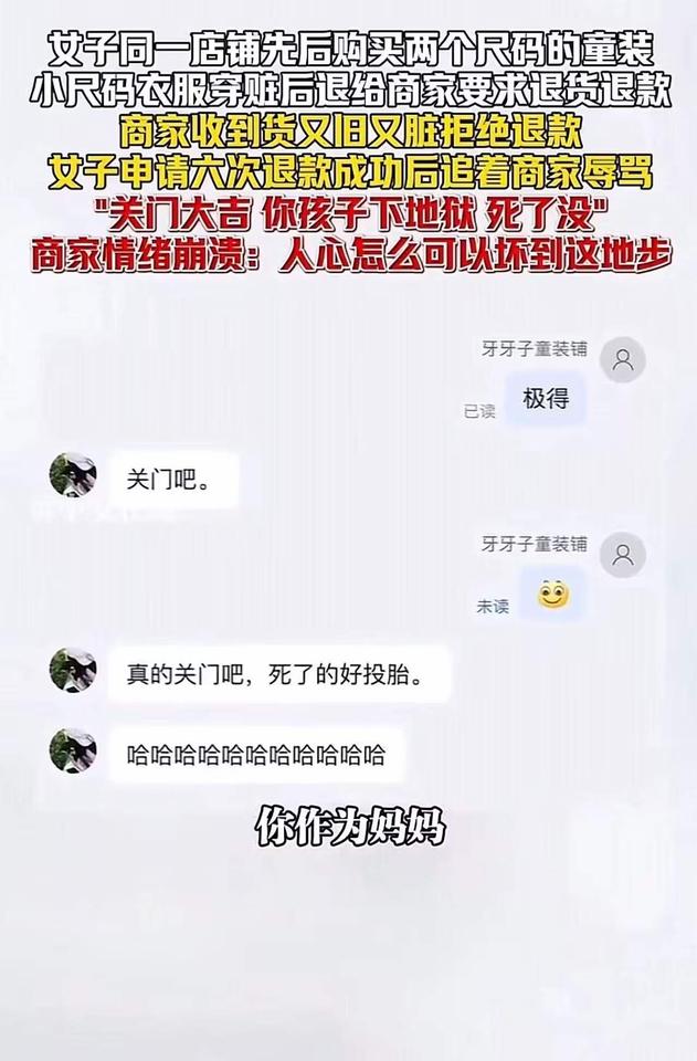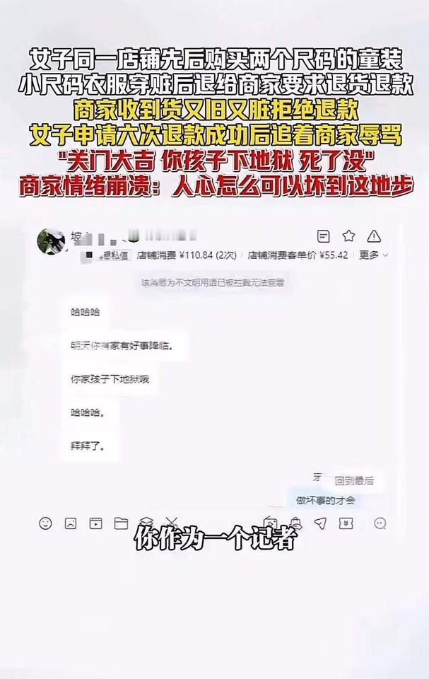 这是一场关于底线与人性的较量,也是现代社会中“善恶边界”的一次深刻拷问。一个普通的网购退货事件,竟然演变成如此令人震惊的道德审判,让人不禁反思:我们在追求权益的同时,是否也迷失了人性最基本的善良与尊重? 事情的起因很简单:一位记者购买了一件童装,穿着又脏又旧,显然已经超出了合理使用的范围。作为消费者,申请退货退款本无可厚非,然而商家的拒绝让这场“理性”的交涉变得激烈。令人震惊的是,这位记者竟然在私信中用极端的言辞辱骂商家,甚至扬言“关门大吉”,更令人发指的是,他竟然还对孩子说出了“你下地狱”的狠话。 这不仅仅是一场普通的争执,更是一场关于人性底线的碰撞。商家情绪崩溃,愤怒地发出视频控诉:“人心怎么可以坏到这地步?”的呼喊,戳中了无数人的心。这位母亲的控诉,犹如一面镜子,映照出当今社会一些人心的扭曲:只为自己的利益,不择手段,甚至不惜伤害无辜。 我们必须问:这样的行为,是“维护权益”还是“践踏人性”?在追求正义的同时,是否也应该守住那份最基本的善良和尊重?一个母亲的控诉,不仅是对个人行为的谴责,更是对整个社会价值观的警醒。我们常说“善有善报,恶有恶报”,但现实中,善良的人似乎变得越来越稀缺。那些以恶意对待他人的人,难道真的不知道自己在伤害的不仅仅是一个商家的利益,更是社会的良知和人性的底线? 这件事让我们看到一个令人担忧的现象:一些人在追求所谓的“权益”时,迷失了最基本的道德准则。我们不能允许这种“以恶制恶”的逻辑泛滥成灾。我们需要更多的理性、更多的善意,更需要用法律和道德的力量,去守护那份最纯粹的人性光辉。 同时,也希望每一个人都能从中反思:我们在表达不满和维护权益时,是否也应尊重对方的尊严?我们是否能在愤怒中保持理智,在冲突中坚持善良?毕竟,社会的温度,取决于我们每个人的选择。 让我们用这次事件,呼吁更多的理性与善意。不要让“利益”蒙蔽了我们的双眼,也不要让“恶意”成为常态。因为,只有当我们都愿意守住那份善良,社会才能真正变得更加温暖和美好。守住道德底线 无道德底线商家 底线与良知