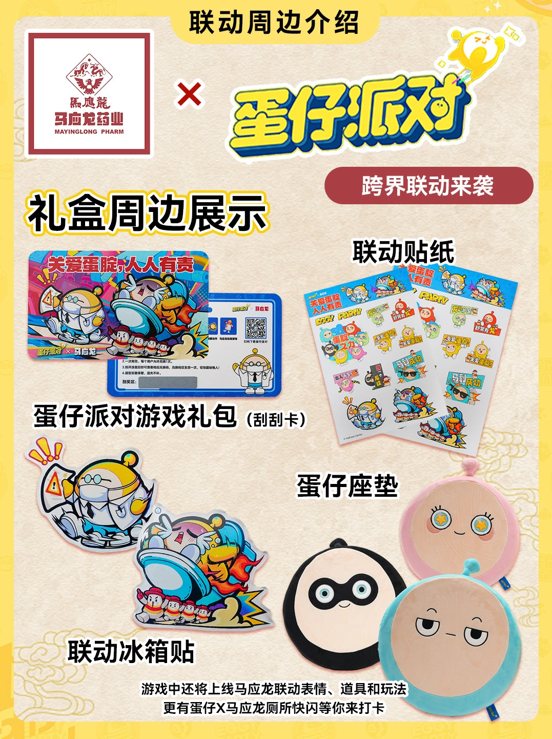 🌟联名贴纸、萌趣冰箱贴、能刮出动作表情背饰的刮刮卡,还有专属联名坐垫,一波周边直接戳中玩家心巴!更别说游戏里的专属联动表情、道具和趣味玩法,马应龙秒变我的本命游戏搭子!