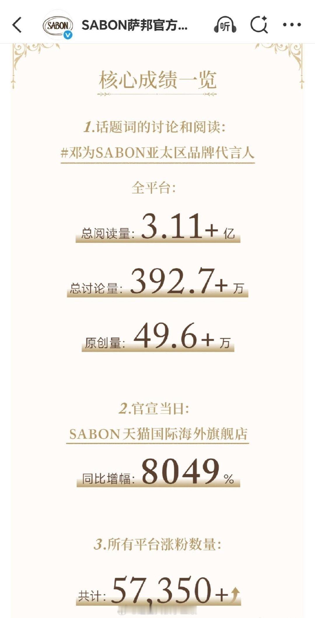 邓为SABON发布战报,旗舰店同比增幅8049%,全平台涨 粉57350+!优秀🐮