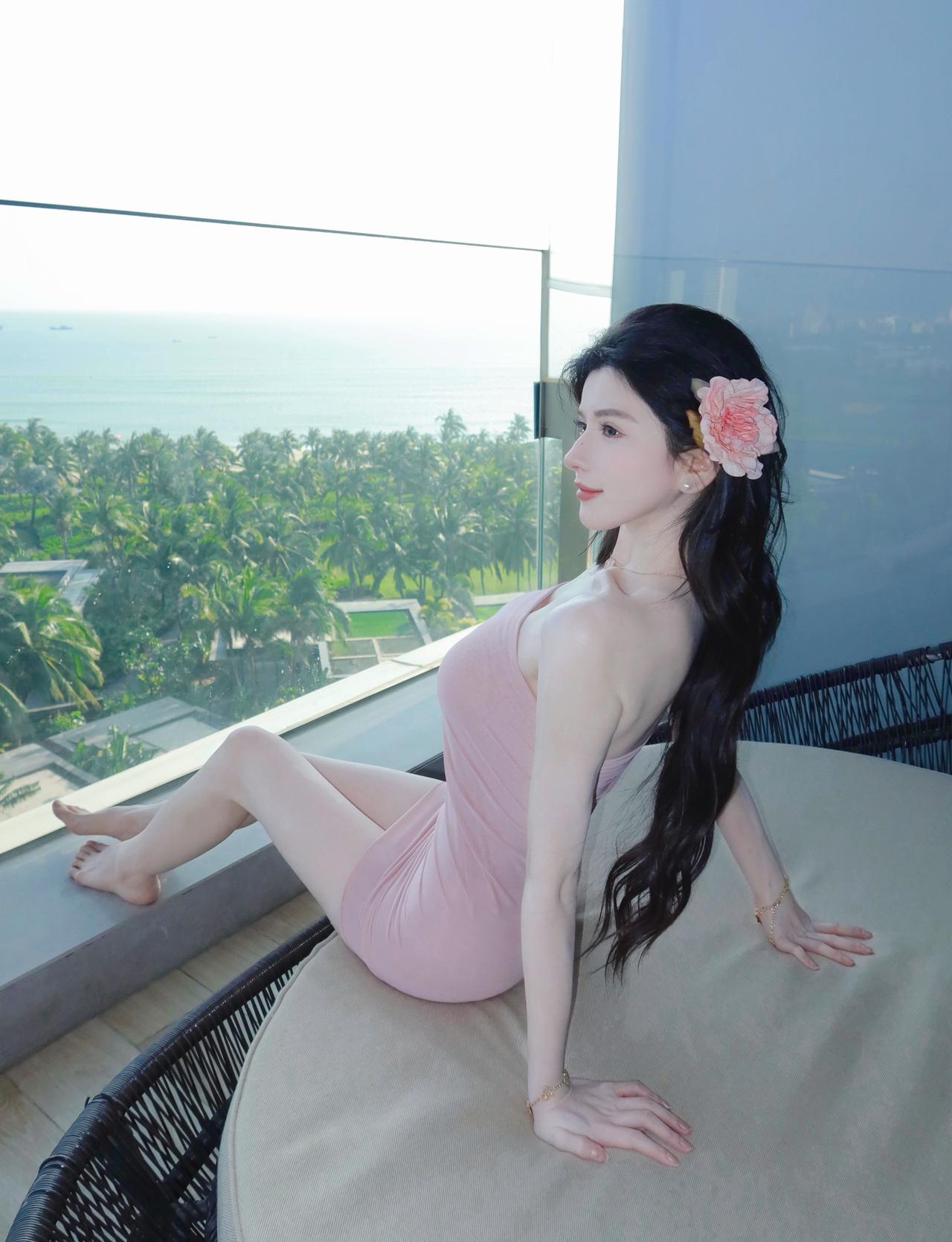 《旅畔春纱》 粉裙轻软趁风斜, 鬓畔簪花照落霞。 椰树连天浮碧海, 一襟清梦在天涯。原创诗词