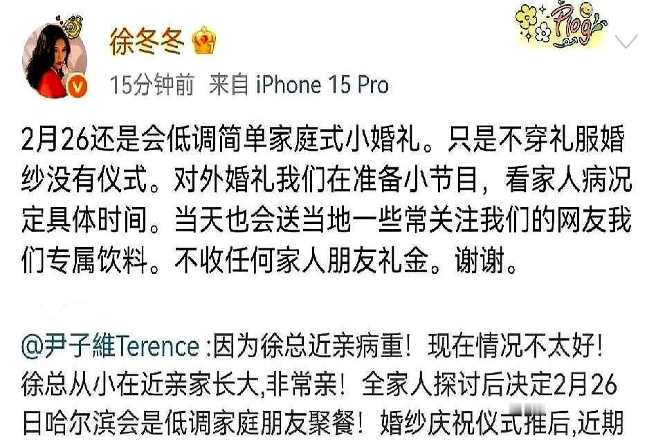婚礼前5天,徐冬冬把哈尔滨婚礼全取消了! 梦幻的冰雪城堡,热闹的流水席……统统没了。 2月26号当天,直接改成一桌家庭聚餐。她自己说,不穿礼服、无仪式。 不是感情崩了!是把她从小带大的至亲,突然重病进了ICU抢救。 未婚夫尹子维第一时间站出来承诺:只要人能康复,一定补办一个更圆满的婚礼。 但徐冬冬转头就拉着合作15年的椰树,给粉丝发一万份定制“囍汁”! 她还特意在网上说,优先哈尔滨关注他们的老铁。 不收任何礼金,先把家人和家乡粉丝安排明白了。