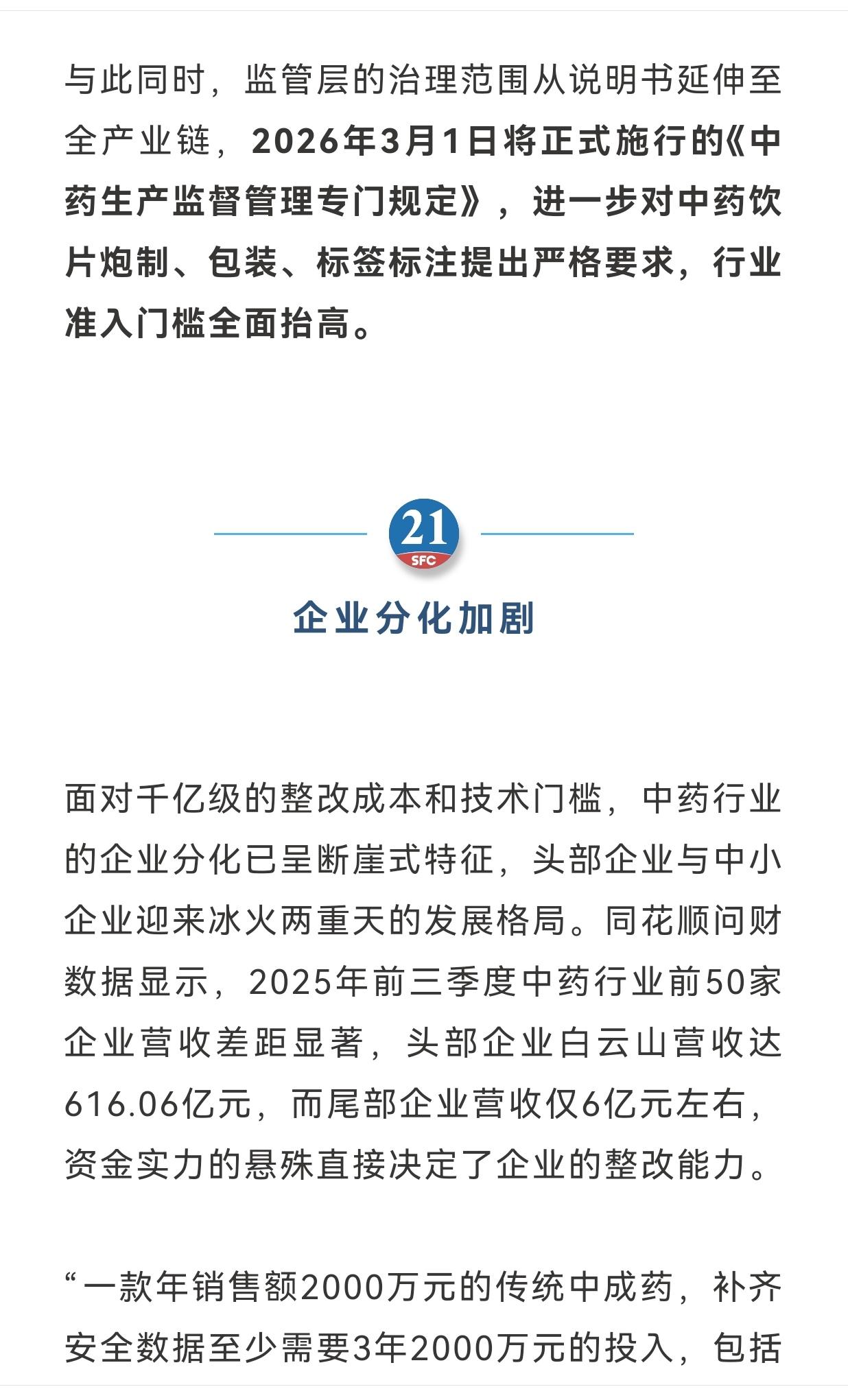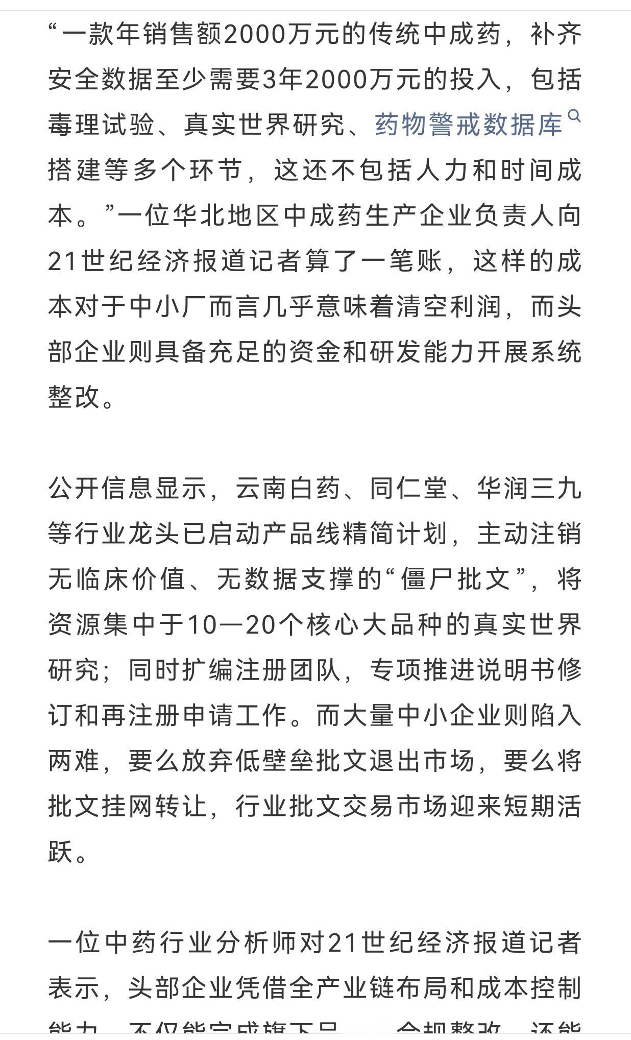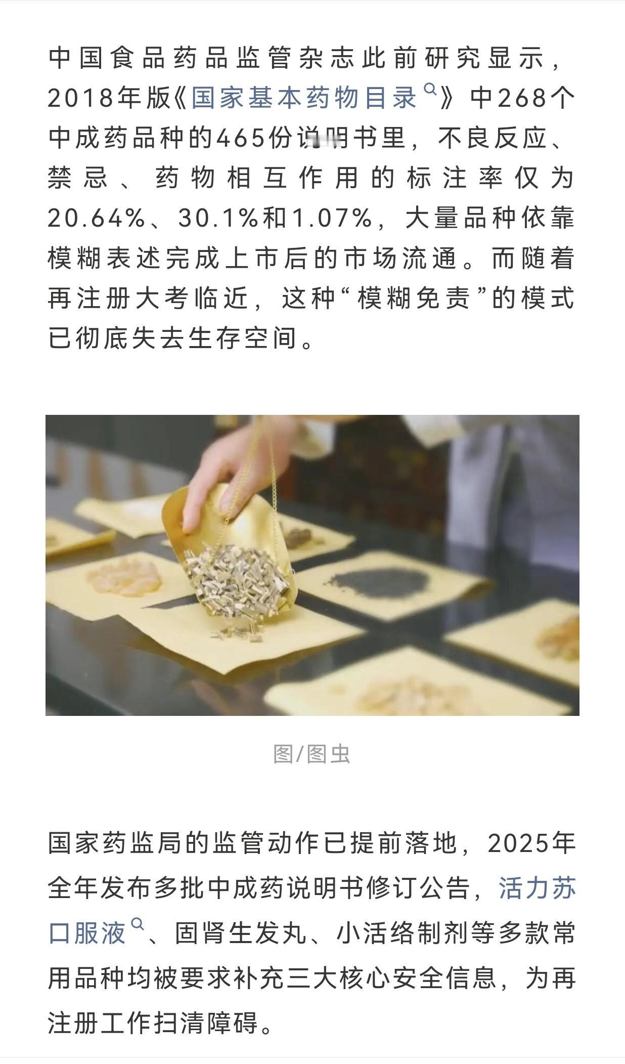 根据《21世纪经济报道》消息: 截止到2026年7月1号后,将有大批中成药将因为说明书中的“禁忌”“不良反应”“注意事项”中,任意一项仍旧标有“尚不明确”的中成药,再申请注册时将依法不予以通过! 这是从2023年7月1号开始的3年过渡期的结束。这也是彻底终结中成药说明书长期以来的“尚不明确”时代,以法律倒逼的形式让药品持有人补齐上市后的安全数据短板,让千万老百姓用药更安全、更放心! -3uvzav8zCDQaQhiQ