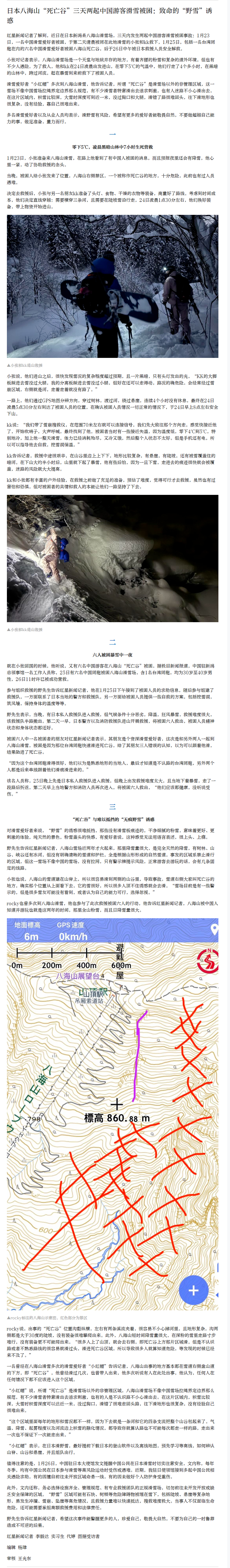 【#日本死亡谷3天2起中国游客滑雪被困#】#日本死亡谷游客被困救援者发声# 红星新闻记者了解到,近日在日本新潟县八海山滑雪场,三天内发生两起中国游客滑雪被困事故:1月23日,一名中国滑雪爱好者被困,于第二天清晨被同在此地滑雪的小张和kk救下,1月25日,包括一名台湾同胞在内的六名中国滑雪爱好者被困八海山死亡谷,后于26日中午被日本救援人员安全解救。小张对记者表示,八海山滑雪场是一个天堂与地狱并存的地方,有着齐腰的粉雪和复杂的道外环境,但也有不少人遇险。为了救人,他和kk在24日凌晨出发进山,在零下5℃的气温中,他们行走了4个多小时,在黑暗的山林中,跨过河流,赶在暴雪到来前救下了被困人员。 滑雪爱好者“小红帽”多次到八海山滑雪,他告诉记者,所谓“死亡谷”是滑雪场以外的非管理区域,这一雪场不像中国雪场拉绳界定边界那么规范,有不少滑雪者特意滑出去追求刺激,也有人迷路不小心滑出去。在这片区域内,积雪比较深,大雪时深度可到近一米,没过胸口和大腿,滑错了路很难回头,往下滑地形也很复杂,没有经验,靠自己很难出来。 多名滑雪爱好者以及从业人员均表示,滑野雪有风险,希望有更多的爱好者能敬畏自然,不要做超越自己能力的事,做足准备,量力而行。就在小张回国的时候,他听说,又有六名中国游客在八海山“死亡谷”被困。据极目新闻报道,中国驻新潟总领事馆一名工作人员称,25日有六名中国同胞被困八海山滑雪场,含1名台湾同胞,均为30岁至40岁男性,26日11时许已被成功营救。参与组织救援的野先生告诉红星新闻记者,他在1月25日下午接到了被困人员的求助信息,随后参与组建了救援队,一方面联系了日本当地的警方和救援队,另一方面给被困人员提供一些自救的方案,包括挖雪洞,筑风墙,保持身体的温度等等。 野先生表示,当晚,有日本私人救援队进入救援,但气候条件十分恶劣,降温,狂风暴雪,救援难度很大,该救援队半路撤出。第二天一早,日本警方以及消防救援队进山开展救援,将被困六人救出,被困人员精神状态和身体状态都还好。 被困六人中一名被困者的朋友对红星新闻记者表示,其朋友是个资深滑雪爱好者,这次是和另外两人一起到八海山滑雪,被困是因为那位台湾同胞快速滑进死亡谷,给了其朋友三人错误的认知,以为可以跟着他滑,结果陷进了死亡谷。 “因为这个台湾同胞滑得很好,他们以为是熟悉地形的当地人,最后才知道是不认路的台湾同胞,另外两个人都是后来单独跟着他们滑痕滑进来的。” 该名人员称,25日晚上先是日本私人救援队进入救援,但晚上出发救援难度太大,且当地下着暴雪,走了一段路后折返,第二天早上当地警方和消防人员再次进入,将被困六人救出,“他们应该都健康,没听说受伤。”#日本死亡谷多次发生滑雪者遇险# 网页链接