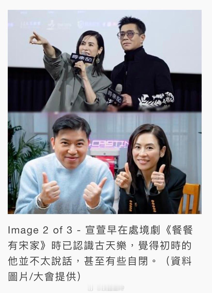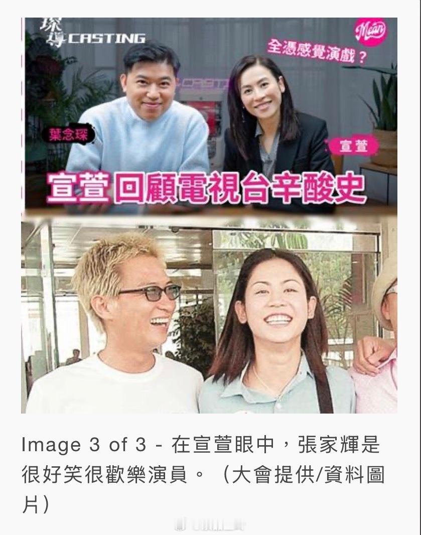 【明報即時】宣萱談電視台歲月辛酸史 細數視帝影帝鮮為人知真面目 宣萱細數和古天樂﹑羅嘉良及張家輝合作點滴。(資料圖片/大會提供)宣萱因《尋秦記》電影版而人氣急升,在公眾眼中,宣萱跟古天樂熒幕CP大受觀迎,而宣萱在葉念琛主導的YouTube 頻道《Meaningful》擔任《琛導Casting》嘉賓,更透露更多不同合作拍檔幕後趣聞。宣萱憶當年拍劇集《天地男兒》時,曾發生「喊唔到」情况,她表示:「記得一場戲跟張智霖分手,我在家中望電視,沒有播片,你要靠自己想像看著畫面去喊」﹑「我做不到」﹑「最後選擇不一定用眼淚,而是用動作,或身體語言去表現」。在TVB工作期間,宣萱亦曾問鄧萃雯「其實你怎樣哭」,鄧萃雯分享很玄的方法:「哭是一種感覺,要來的時候就會來」,宣萱聽完似懂非懂,當時雖然放下,後來恍然大悟。談及跟不同藝人合作,其中曾合演《流金歲月》﹑《難兄難弟》的羅嘉良,在宣萱眼中既勤力且專注,她說:「他是其中一個會聊天的人,不一定講做戲,會講人生」﹑「他會分享個人歷史,包括在圈中不好經歷,例如簽了什麼經理人」﹑「跟他做戲你不同想太多,他一定給予你100%」。除羅嘉良外,跟宣萱另一作品《騙中傳奇》的張家輝,原來當年拍攝期間,亦發起趣事:「我們4人包括錢嘉樂﹑張家輝﹑我﹑苑瓊丹要上去跟監製說不可以那樣拍」﹑「他寫到我們常抱在一起,每場都4人」﹑「你分開兩條線我們至少可休息一下」﹑「他說你們4人一起好看,我說這樣不行,其實我們受不了」,幸好後來終於有聽取意見。在宣萱眼中,張家輝是很好笑很歡樂演員,但當時連他也受不住「你知道他已差不多到了頂點」﹑「當他不出聲時,我們都不敢出聲,我們不是最辛苦」﹑「有一場戲我辛苦到,我第一次,拍完拔頭套就走」﹑「每晚可能只睡1至2個小時,等於沒睡!」宣萱早在處境劇《餐餐有宋家》時已認識古天樂,覺得初時的他並不太說話,甚至有些自閉:「但我是一個很喜歡說話的人,我有時就會撩他,慢慢他就覺得我沒有惡意」﹑「之後他做訪問喜歡跟我一起做,因為他不用說太多話」﹑「早期做演員還是很快樂,後來有自己公司,就對外表現出較嚴肅的一面」。即使宣萱長年在電視台工作,也會因為電視台幕後一些轉變,而覺得待不下去:「這班人一起合作你很開心,但一有轉變就會驚」﹑「原先亦想觀察一年,能合作就走下去,不能合作就算」﹑「因為我覺得做人最緊要開心」﹑「他們的運作方式可能適合某些人,但不適合我」。(即時娛樂)