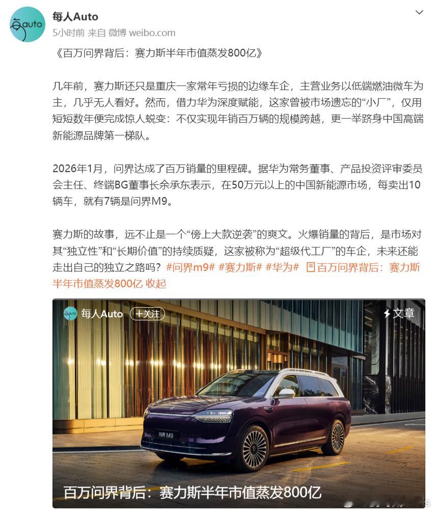 聊下大A中的赛力斯或者大A中的汽车股。最近很少在微博上发汽车内容,全因每天的注意力全在大A上。账户红了,车马费不过是可有可无的零花钱;一旦绿了,默默翻找公关微信,婉转催问结款进度——毕竟饭还是要吃的。我猜,不少同行老师最近的心态与操作,也大抵如此吧。之所以想聊聊大A中的赛力斯,是被每人AUTO发的文章《百万问界背后:赛力斯半年市值蒸发800亿》一文触动。作为持有赛力斯两年半的A股练习生,我对赛力斯这只「前妻股」的革命感情不可谓不深。它曾陪伴我从79元一路冲至140元,期间累计涨幅接近80%,近乎翻倍。然而,我最终选择在2025年7月和她「和平分手」,原因在于:自2024年底被纳入沪深300、上证50等核心指数后,赛力斯股价便进入了漫长的横盘震荡期。我不愿在“躲牛”中继续消耗机会成本,故而清仓。未曾想,分手三个月后,它在2025年9月30日触及了174元的历史峰值。戏剧性的是,登顶之后便是漫长的下坡路。从去年9月至今年1月,短短四个月内,其股价自高点回撤约35%,市值从2800亿元的高位缩水至约1961亿元,蒸发近840亿元。截至今日,股价报收于112.58元。我摘了每人AUTO的一些相关数据,大家也可以去翻阅原文,看完这些数据后,大概就知道赛力斯为什么与牛市背道而驰。- 支付华为硬件费用:赛力斯每年需向华为采购大量智能驾驶、智能座舱等核心汽车零部件。2022年到2025年上半年,相关采购额分别为58亿、72亿、420亿及200亿元,占总采购额的14.5%、17.4%、30.2%及33%,三年半采购额累计高达750亿元。尤其2025年上半年,费用占同期营收的三分之一,相当于卖一辆车,赛力斯需要向华为支付约13.6万元;- 华为零售体系赋能的营销费用:赛力斯的广告宣传、品牌形象店建设及渠道服务相关支出从2022年的40.36亿元急剧攀升至2024年的181.11亿元。进入2025年上半年,该项支出已达84.31亿元,占同期销售及经销费用总额的94.3%;- 增长放缓:2024年问界累计销量38.71万辆,同比暴增268%;而2025年全年销量为42万辆,同比增速骤降至不足10%;- 「长子效应」稀释:2025年,鸿蒙智行全系累计交付近59万辆,其中问界贡献约42万辆,占比约71%;而在2024年,这一比例曾高达87%。问界借助华为高升,反过来也帮助华为扩大了朋友圈,五界(问界、享界、智界、尚界、尊界)、三境(启境、奕境、华境),每一家都在不同程度上共享华为的技术优势。2026年,华为乾崑智驾合作的车型高达80款,规模效应持续放大,长子效应逐渐稀释;- 新的增长和未来:赛力斯董事长张兴海明确表示,2026年公司将“双线并进」:一方面继续夯实问界主业——这是当前生存与现金流的压舱石;另一方面加速布局海外市场,并探索“智能体”等创新业务。究其根本,并非赛力斯独自从「小甜甜」变成了「牛夫人」,而是整个中国汽车行业的投资逻辑与市场地位发生了系统性嬗变。 这个曾被誉为“制造业皇冠”的行业,正经历一场从“成长故事”到“现实经营”的转型,具体表现在:- 市场属性根本转变:中国汽车市场已从高速增长的增量市场(年销量复合增长率曾超10%)全面进入以存量替换为主的存量市场。年销量规模稳定在约2500万辆的平台上,增长已趋于个位数甚至持平,竞争进入残酷的零和博弈阶段。- 出海受阻,内卷加剧:地缘政治与贸易壁垒高企(如欧盟对中国电动汽车加征的临时关税最高可达38.1%),严重制约了规模化出海的路径。无法向全球市场释放产能,导致所有压力回流至国内,引发价格战、配置战、营销战的全方位“内卷”。- 盈利空间被极致压缩:在激烈内卷下,行业整体盈利能力大幅下滑。目前,主流中国品牌汽车的平均毛利率已普遍压降至15% 以下,部分企业甚至出现“卖一辆亏一辆”的情况,净利润率常年徘徊在2%-5% 的微利区间,成为一个“规模不经济”的苦命行业。- 政策想象空间收窄:在最新的国家「十五五」规划纲要中,新能源汽车虽仍被提及,但其战略优先序已明显让位于新一代人工智能、量子技术、商业航天等前沿领域。这意味着,汽车行业作为资本市场「宏大叙事」和享受超高估值溢价的黄金时代已然落幕。- A股估值逻辑的背离:A股市场本质上是一个高度依赖产业趋势、政策红利与成长想象空间的“叙事市”。当一个行业同时面临增长见顶、盈利微薄、政策光环褪去时,其在投资者心中的定位就会从“成长股”迅速滑向“价值股”甚至“周期股”,即所谓的“老登股”。这与白酒、光伏等行业走过的路径相似。汽车板块的沉寂,是宏观环境、产业周期、政策导向与市场情绪多重共振的结果。短期内,行业难以彻底“反内卷”或完成产能出清。这也解释了为何如理想、小鹏、小米等头部玩家,纷纷将战略重心转向AI或具身机器人领域。这并非简单的概念炒作,而是基于深刻的技术共通性:智能汽车所积累的规模化制造能力、自动驾驶算法、高性能芯片集成与智能制造体系,恰恰是发展先进机器人产业可以直接「拿来主义」的基础。向AI与机器人进军,或许正是汽车品牌们在“造车”故事之外,试图为资本市场寻找的、最后一个具有爆发潜力的「新增长点」与估值锚点。作为这一切的旁观者与亲历者,看着赛力斯和中国汽车工业的与大A的K线图逐渐背离,心情复杂。它曾是我们寄托「换道超车」的载体,股价从79元冲向174元的轨迹,何尝不是中国新能源汽车产业从质疑中突围、在聚光灯下狂飙的缩影。资本
