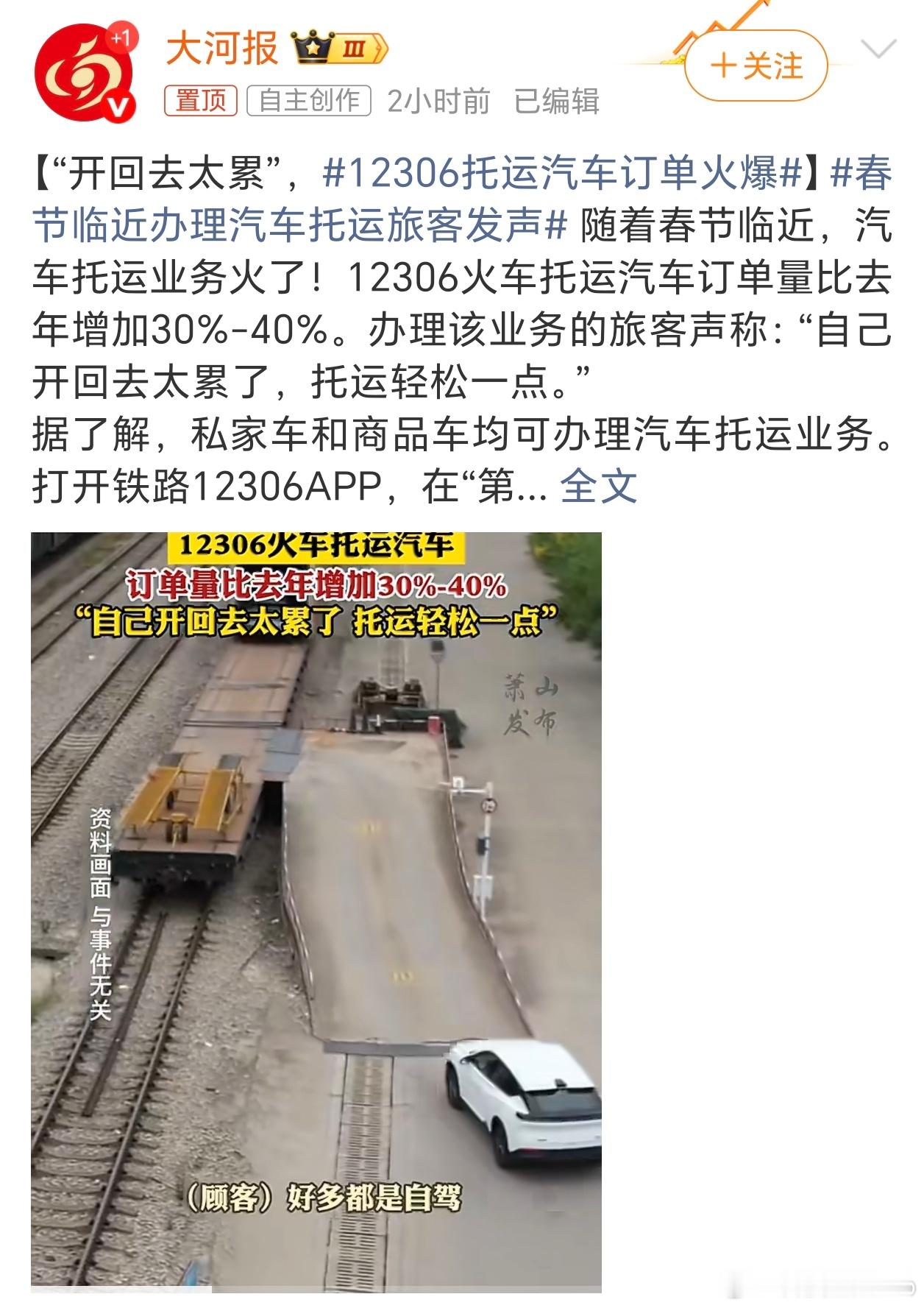 12306托运汽车订单火爆啊?才知道12306可以托运汽车这对长距离返程的人来说挺合适啊,返程更轻松了,不用担心堵车,到达目的地直接开车回家,舒服