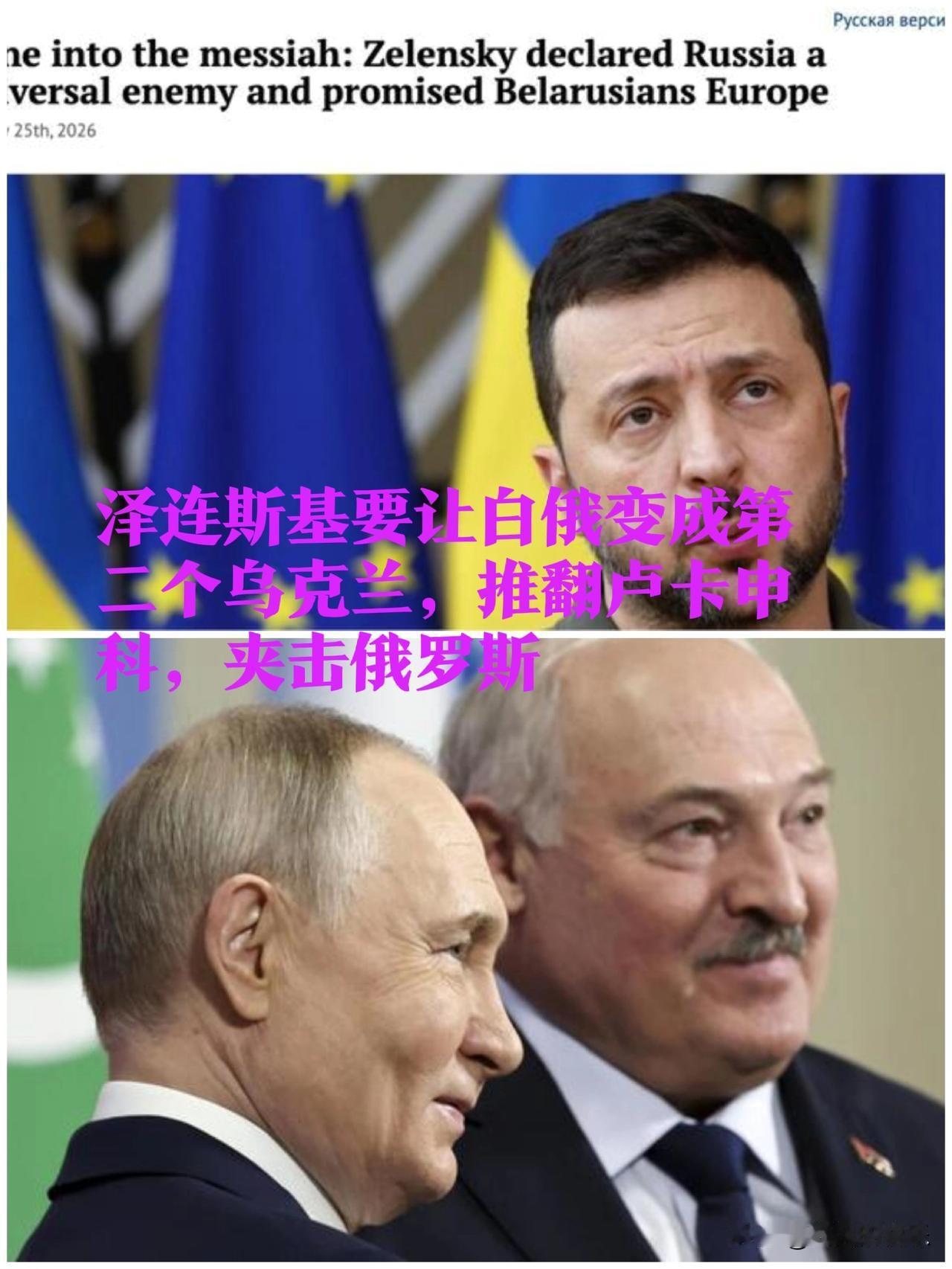 泽连斯基煽动白俄"颜色革命" 欲打造"第二乌克兰"夹击俄罗斯 据外媒俄罗斯《EADaily》1月25日报道,乌克兰总统泽连斯基在访问立陶宛期间发表煽动性演说,将白俄罗斯总统卢卡申科贬低为俄罗斯的"博美犬",并鼓动白俄罗斯人加入"自由欧洲"。 泽连斯基特意提及2020年白俄罗斯骚乱,声称当年的"起义"本应获胜。分析认为,这是试图在白俄罗斯复制"颜色革命"模式,推翻卢卡申科政权,将白俄罗斯变成第二个乌克兰。 对乌克兰而言,白俄罗斯是俄罗斯的战略后方,俄军可利用其领土进行兵力投送和后勤补给。若白俄罗斯发生骚乱,俄罗斯将被迫分兵应对,从而减轻乌克兰压力。若白俄罗斯"变天",俄罗斯将面临双线作战困境。 但白俄罗斯民众对泽连斯基的煽动反应冷淡。乌克兰自身为"融入欧洲"付出的代价——主权丧失、青壮年男性大量伤亡——让白俄罗斯人看清了所谓"欧洲选择"的真相。 白俄罗斯是俄罗斯抵御西方入侵的最后战略缓冲区。普京已明确表示,绝不允许白俄罗斯脱离俄罗斯势力范围,为此不惜动用经济支持和核威慑等手段。
