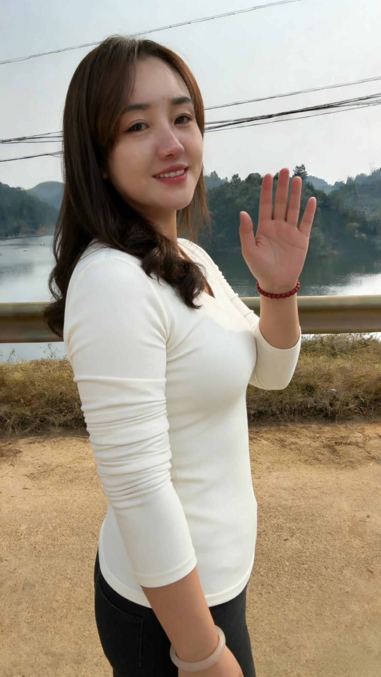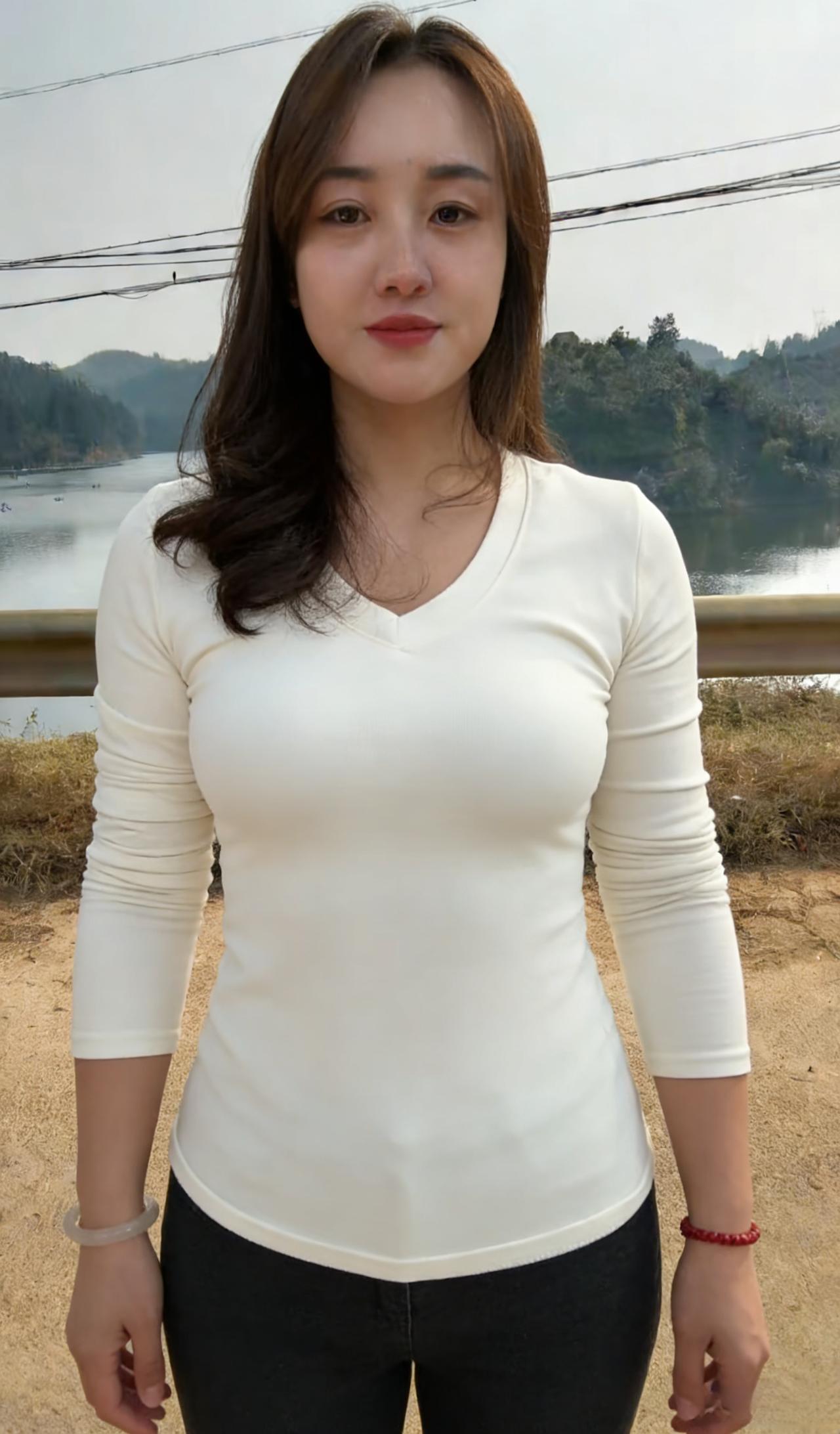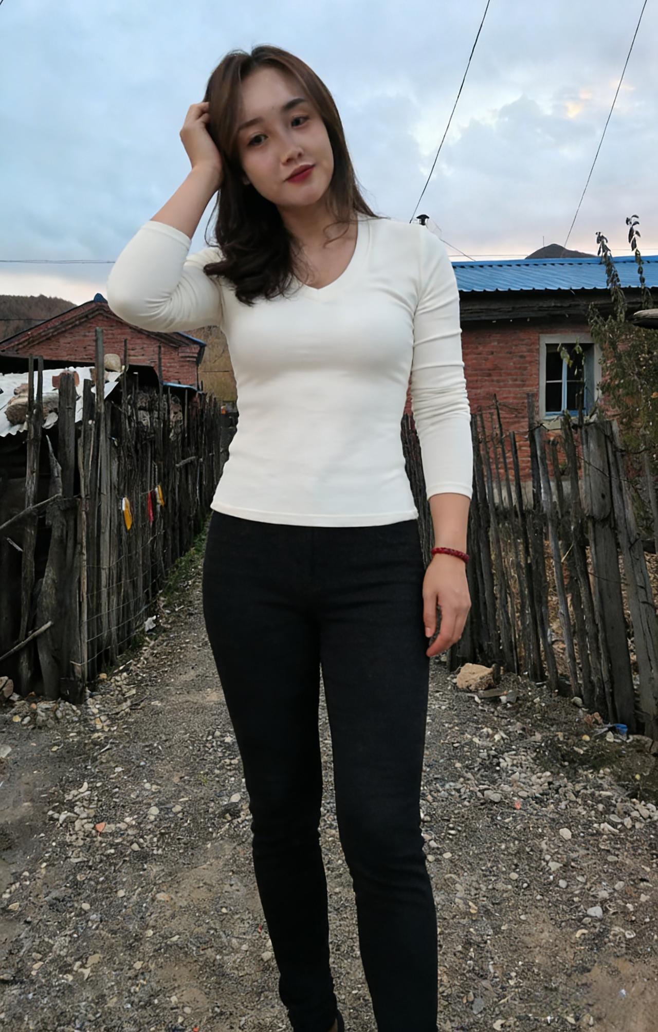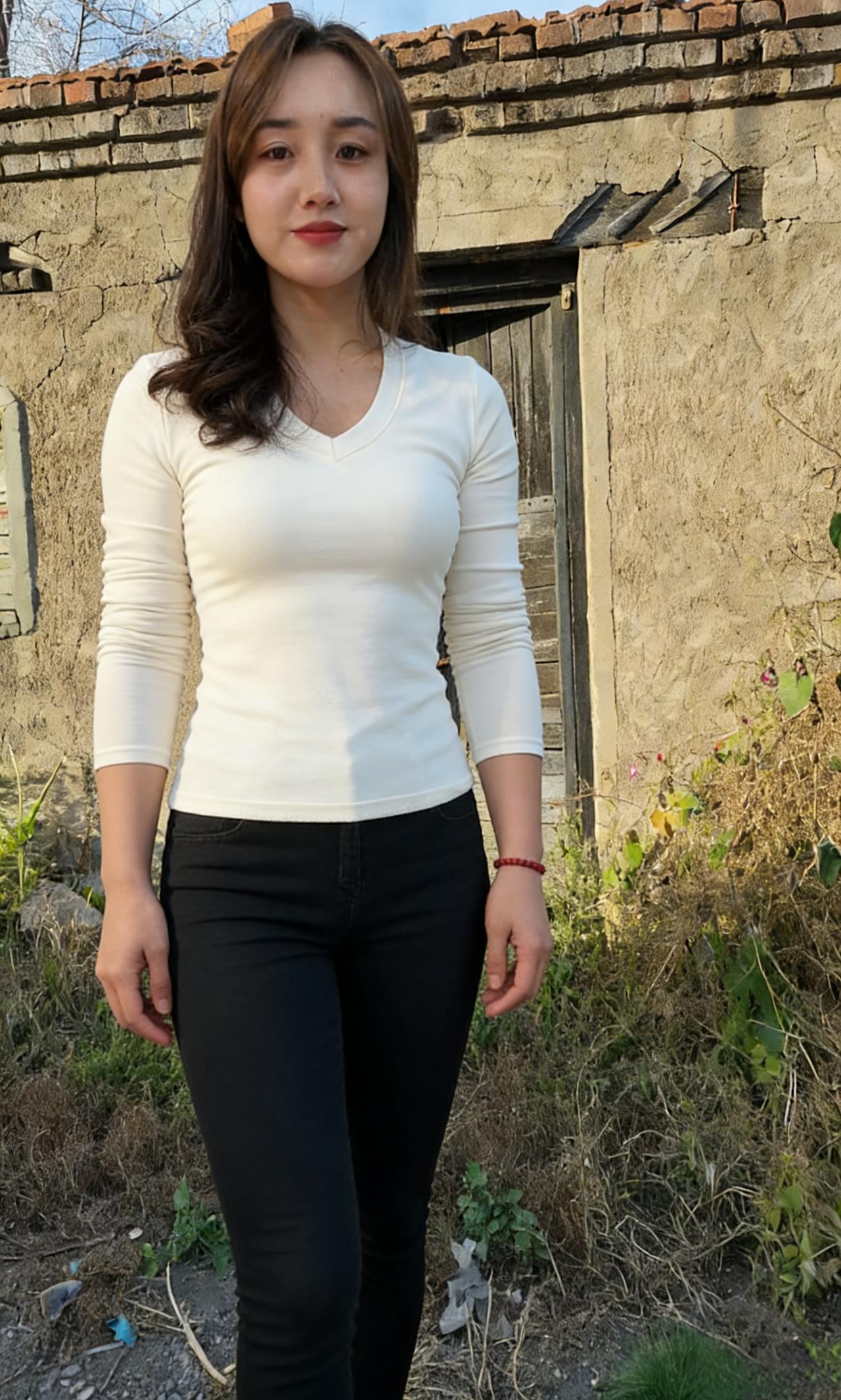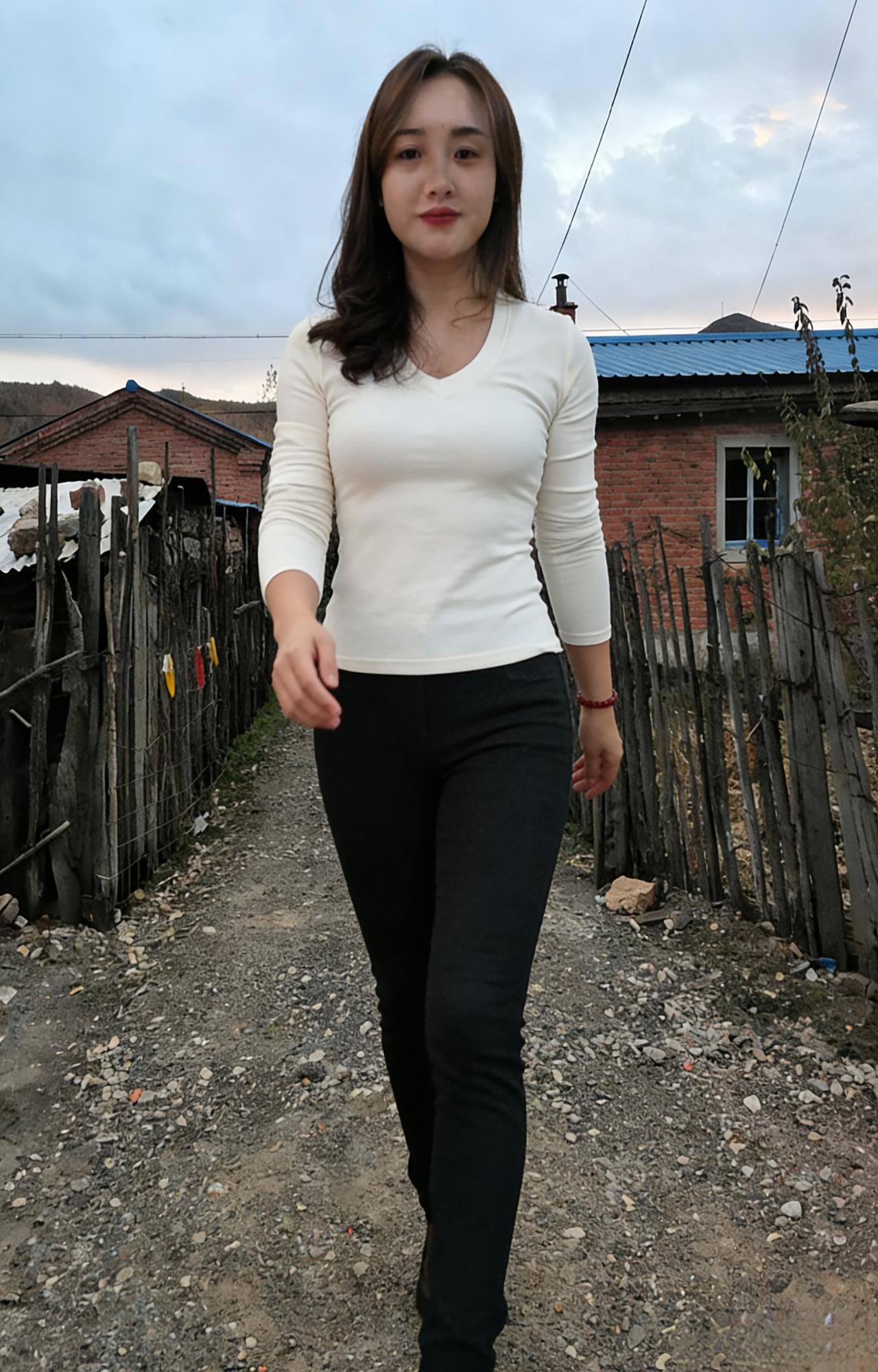 素衫玄裤立荒郊,暮色凝霜鬓畔飘。 一笑红唇融冷寂,春风暗度石溪桥。