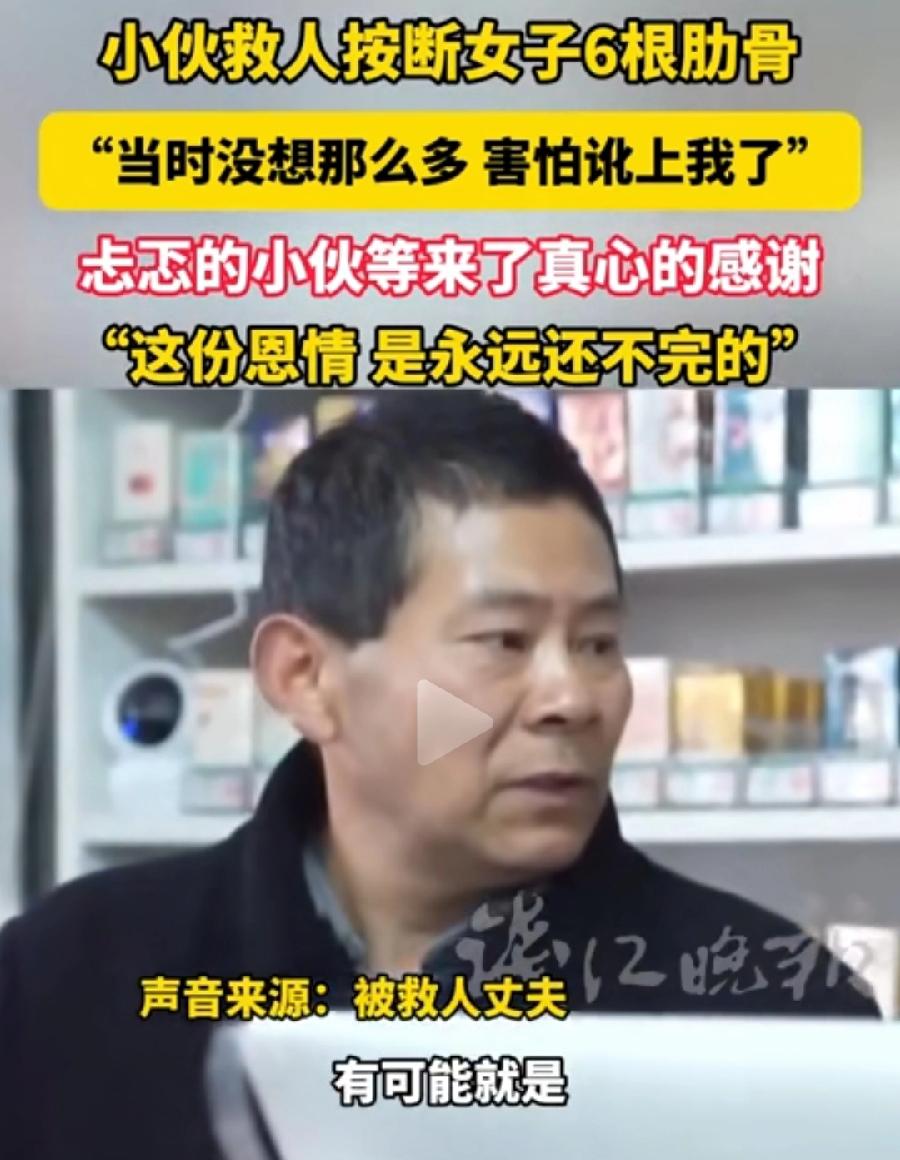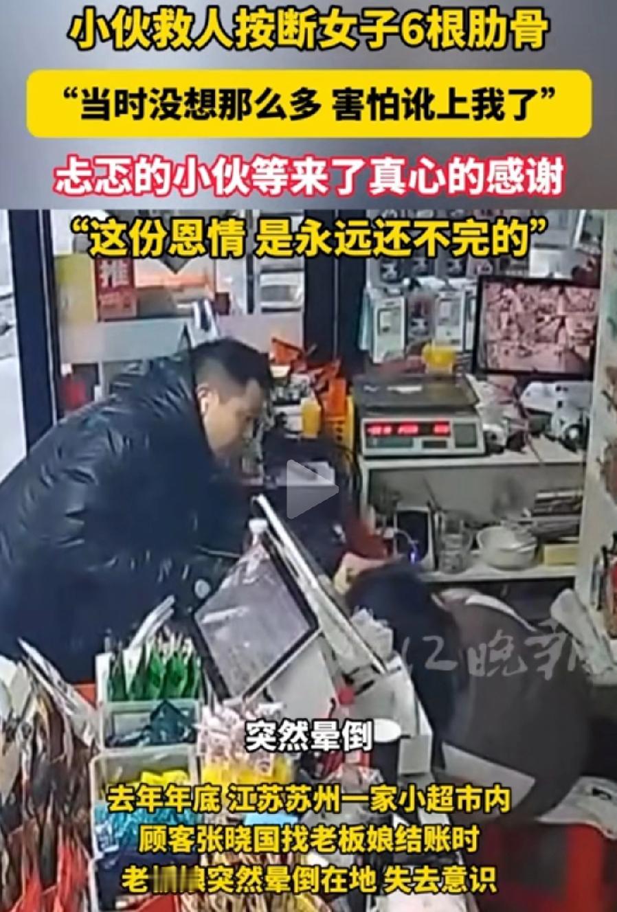 苏州小伙急救超市老板娘按断六根肋骨,老板娘丈夫感恩说谢谢!幸亏遇到了通情达理的丈夫,小伙也说了,就怕人救不回来,反而被讹诈,这也是人之常情,苏州经济发达是有原因的,人的素质也比较高!普通人不是急救专业人士,冒着被讹诈的风险还勇敢救人,肋骨断了可以长好可以医治,命没了真的没了!老板娘丈夫明事理懂感恩,这既是对小伙爱心的回报,也激励更多的人!
