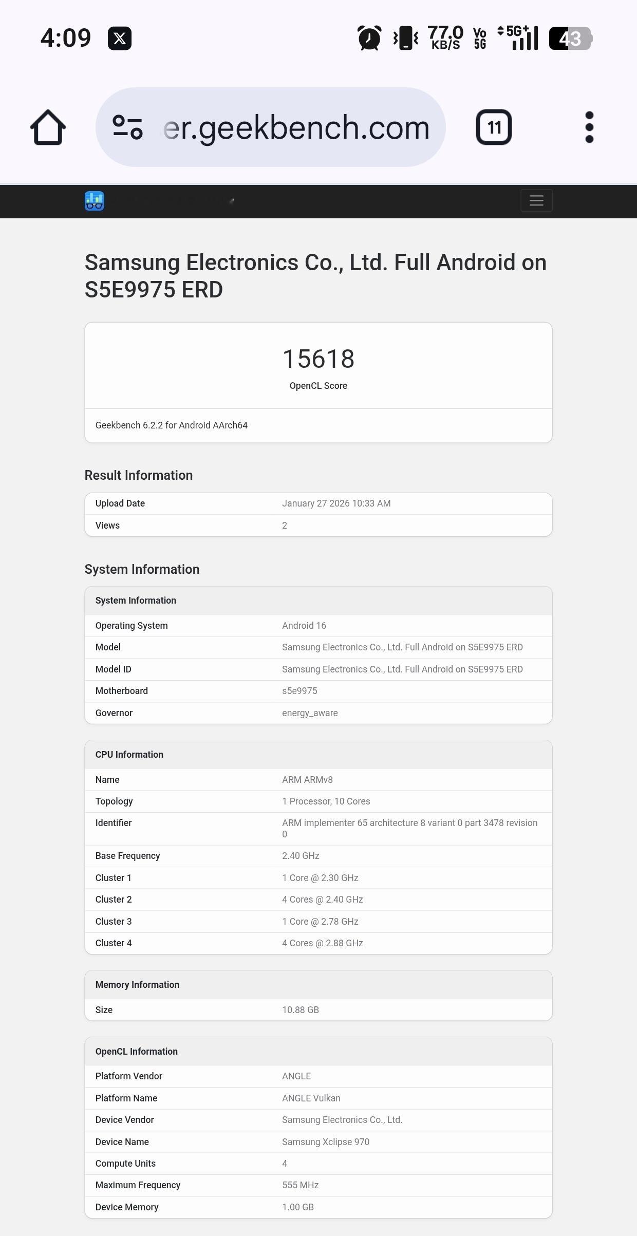 三星Exynos 2700 早期跑分出现了,这也太早了吧?不得不令人怀疑它的真实性。采用四从集1+4+1+4 架构。很迷