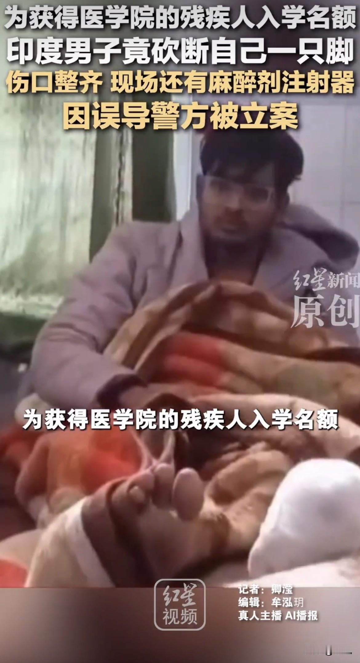 太狠了!2026年1月18号晚上,印度北方邦的苏拉杰·巴斯卡尔,一个二十多岁、学过药学的年轻人,给自己打了麻醉,切掉了左脚的四根脚趾和部分脚掌。 他哥哥跑去报警,说弟弟被不明身份的人袭击砍伤了脚。但警察越查越不对。 伤口太整齐了,像机器切的。现场还发现了用过的麻醉注射器。他的供词前后矛盾,变来变去。警察找到他的日记,里面反反复复就写着一句话:“我将在2026年成为MBBS医生。” 他女朋友也说,他痴迷于考医学院,甚至说过“不惜一切代价”。 这条路,他之前试着走过正门,但被关在了外面。去年十月,他就特意跑去贝拿勒斯印度教大学的医院,想办一张残疾证明,没办成。他也试过歪门邪道,想贿赂官员弄证明,也失败了。 他拼了命想挤进去的,是印度国家医学入学考试NEET。想当医生,几乎必须过这一关。去年有220万人报名,只招大约11万人。这11万个位子里,给残疾考生留了5%的名额。想用这个名额,残疾程度必须达到40%以上,还得有指定的医院委员会出具证明。 这个证明不是有残疾就一定能开。委员会评估得很严,要看你身体的功能到底能不能学医、将来行医。 所以,苏拉杰想得太简单了。就算他现在真的残疾了,也要先经过这套严格的医学评估,证明他“适合”学医,然后还得再去考一次NEET,并且分数要达到残疾类别的录取线。他之前已经考砸过两次了。 现在,他还在医院治伤。警察在等法律意见,看能不能以报假案、误导调查之类的罪名起诉他。他那截切下来的脚,警察到现场找过,但没找到。 讽刺的是,当他真正需要那张残疾证明来应对未来生活时,流程可能才刚刚开始。 一个年轻人用毁灭身体的方式,去赌一个从一开始就理解错了的“机会”。他以为那是条捷径,没想到是条更窄的死胡同。这事你怎么看?