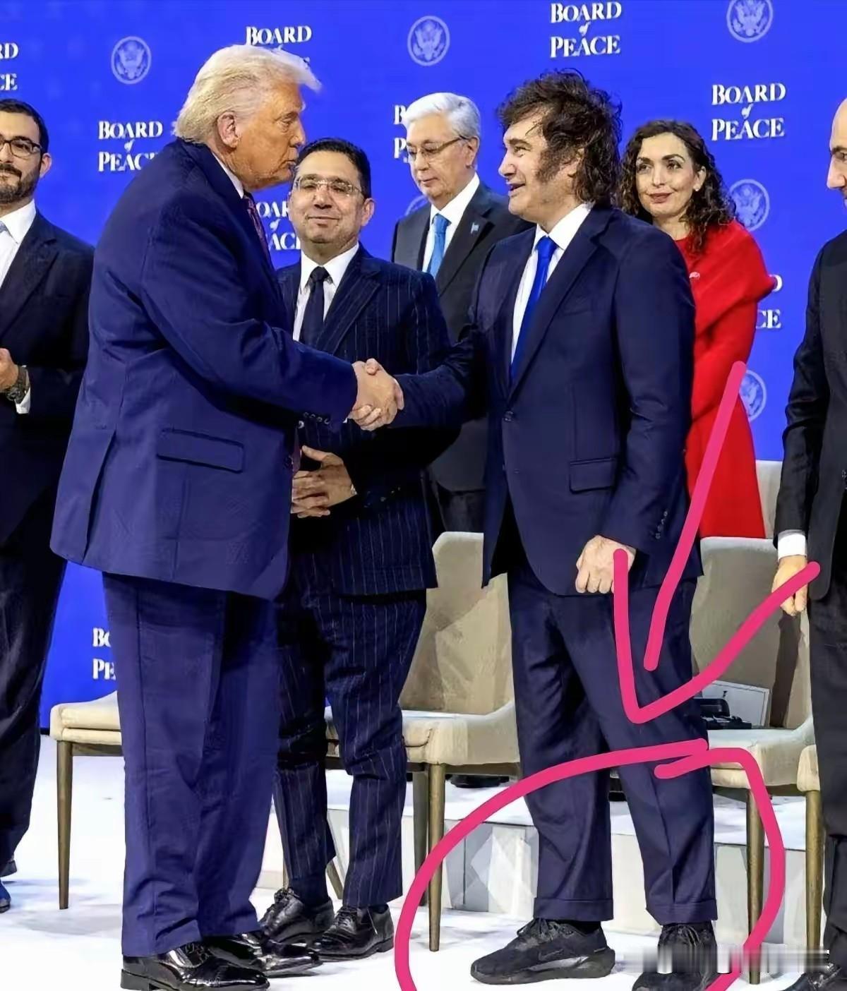 阿根廷总统米莱,跑去见了特朗普。 ​镜头拉近,俩人握手,上半身看着都挺正常,西装笔挺。可镜头一往下摇——米莱的西裤底下,居然蹬着一双耐克运动鞋。 ​你想想那个场面。 ​一屋子人,不是政客就是大佬,个个皮鞋擦得能照出人影。闪光灯咔咔地响,连空气里都是那种“正式”的味道。 ​结果,他就这么大大咧咧地站那儿,裤脚底下那个钩子标志,比谁脸上的笑都显眼。 ​这一下就把人看蒙了。 ​按规矩,这种场合,穿错一粒纽扣都算失误。他倒好,直接把下半身穿成了去楼下慢跑的造型。 ​你说,这到底是新一代政治家不拘小节,还是压根就没把这套老派的规矩放在眼里?或许,米莱的这双运动鞋,正是他向旧秩序发出的挑战信号。在传统政治场上,条条框框的规矩就像无形的枷锁,限制着每一个人的言行。而米莱,这位带着“变革”标签上台的总统,似乎从一开始就没打算走寻常路。 特朗普在一旁,看着米莱这新奇的搭配,眼神中闪过一丝复杂的神情。是对老友的调侃,还是对这种打破常规的暗自欣赏?谁也说不清楚。毕竟,特朗普自己也曾是政治舞台上的“异类”,他的行事风格就像一阵旋风,搅乱了原本平静的政治湖面。 米莱的这双运动鞋,就像一颗投入舆论大海的石子,激起了千层浪。媒体们纷纷聚焦,评论员们各抒己见。有人批判他的着装是对场合的不尊重,是缺乏礼仪的表现;但也有人觉得,这恰恰体现了米莱的真实和随性,在充斥着虚伪和做作的政治世界里,他就像一股清流。 也许,米莱正是想用这双运动鞋告诉世界:他不会被传统的政治规则束缚,在他的字典里,变革和创新才是最重要的。他要以一种独特的姿态,带领阿根廷走向新的未来,哪怕这双运动鞋会成为众人眼中的“异类标志”,他也在所不惜。