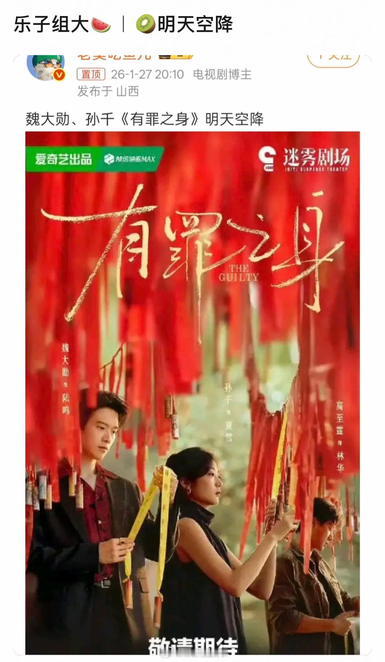 我的天,有罪之身真空降啊,今天晚上六点播,可以看魏大勋新剧了。