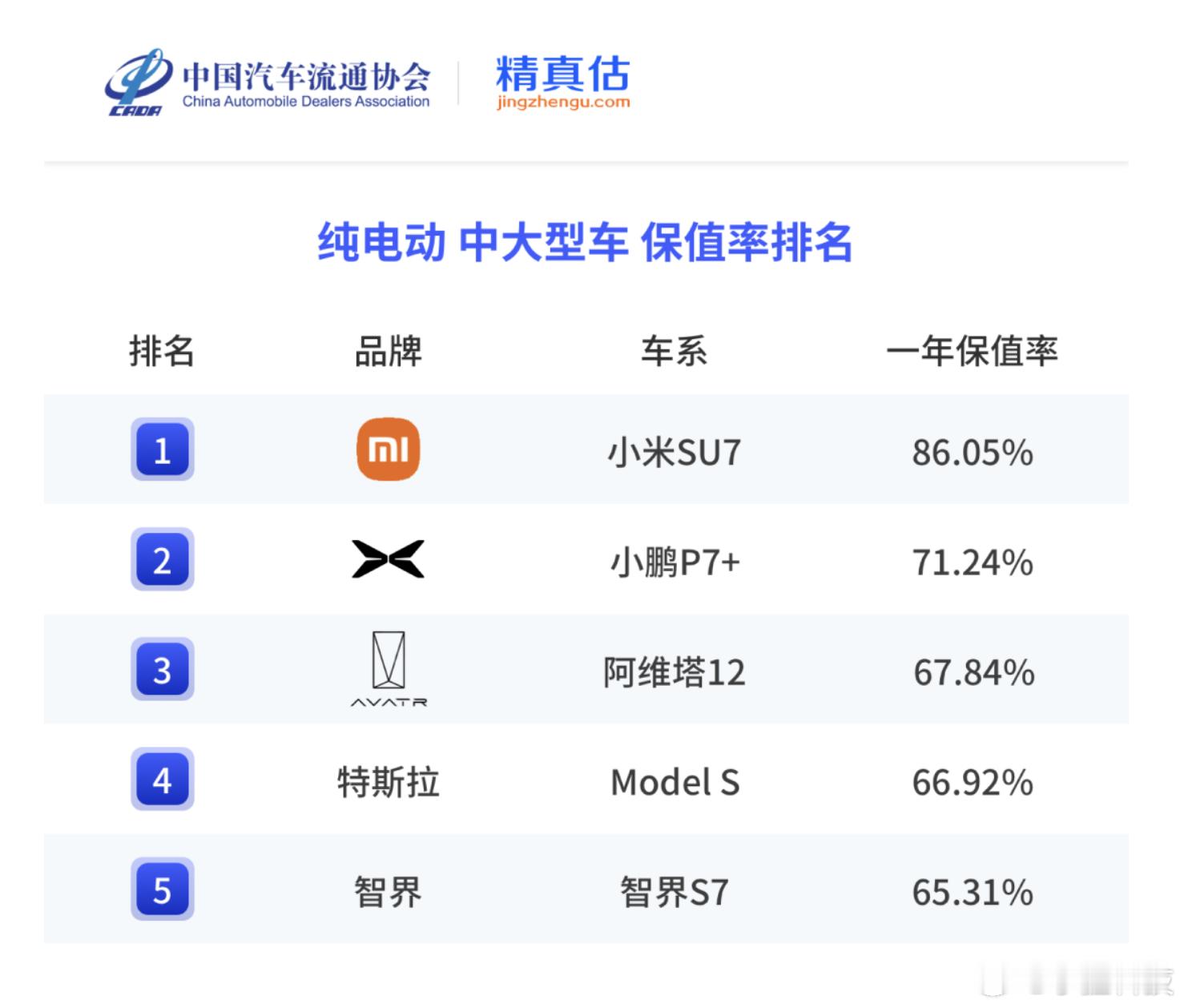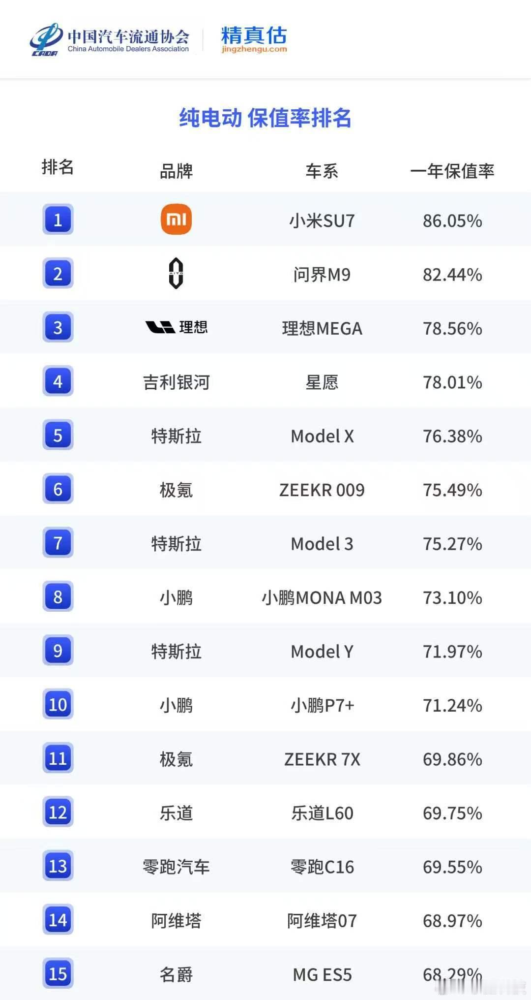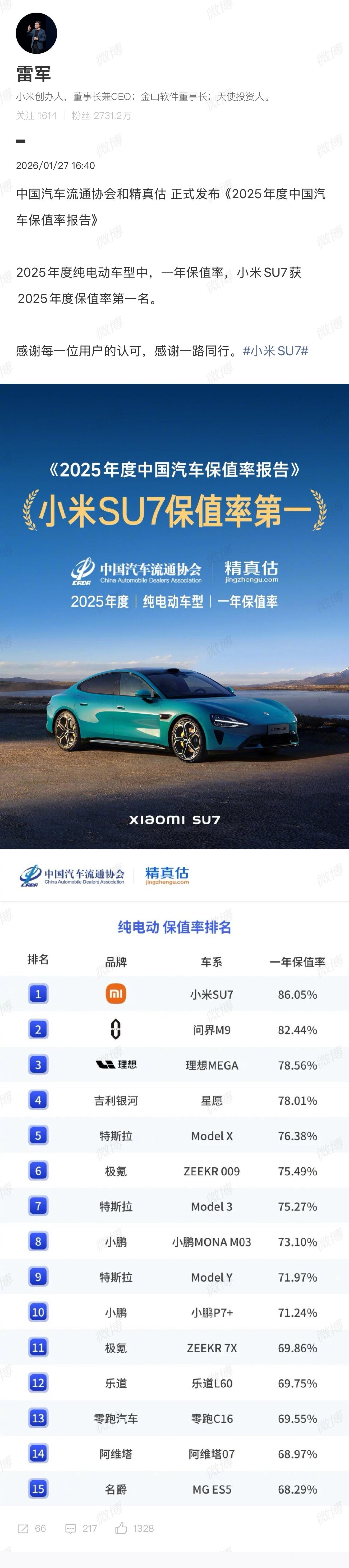 雷军回应小米SU7保值率第一名一年保值率86.05%,小米SU7这个保值率的含金量有多高,懂得人都懂。不是单纯的第一这么简单,而是作为一家后来入场的车企的强悍实力。一方面一年保值率80%以上都算非常不错了,跟Model X、宝马X5、奔驰C级相媲美。其次2025年纯电保值率位居第一,也超出2024年/2023年一大截。因为24年Model X保值率是81%,23年Taycan保值率是80%,SU7第一次上榜就创下三年最高,真的非常惊人。这就说明好的产品,市场是会说话的。虽然网上各种声音不断,抹hei或刻意带节奏的不少,但是数据说明了一切,市场反应说明了一切,hei子们可以退场了。保值率高意味着什么?说白了就是销量好、流通顺,受到大众欢迎。这一点从易车数据就能看得出来,SU7销量超39万。以后大家买车一定要注意,保值率高的会更靠谱一些。实际上SU7在安全、操控、智能化上确实没有什么短板,妥妥的“六边形战士”,产品力硬,保值率上才够硬气。以前总有人说电动车保值率不如油车,SU7改变了这种偏见。老SU7表现这么好,新一代SU7应该也会很不错,大家感觉呢?