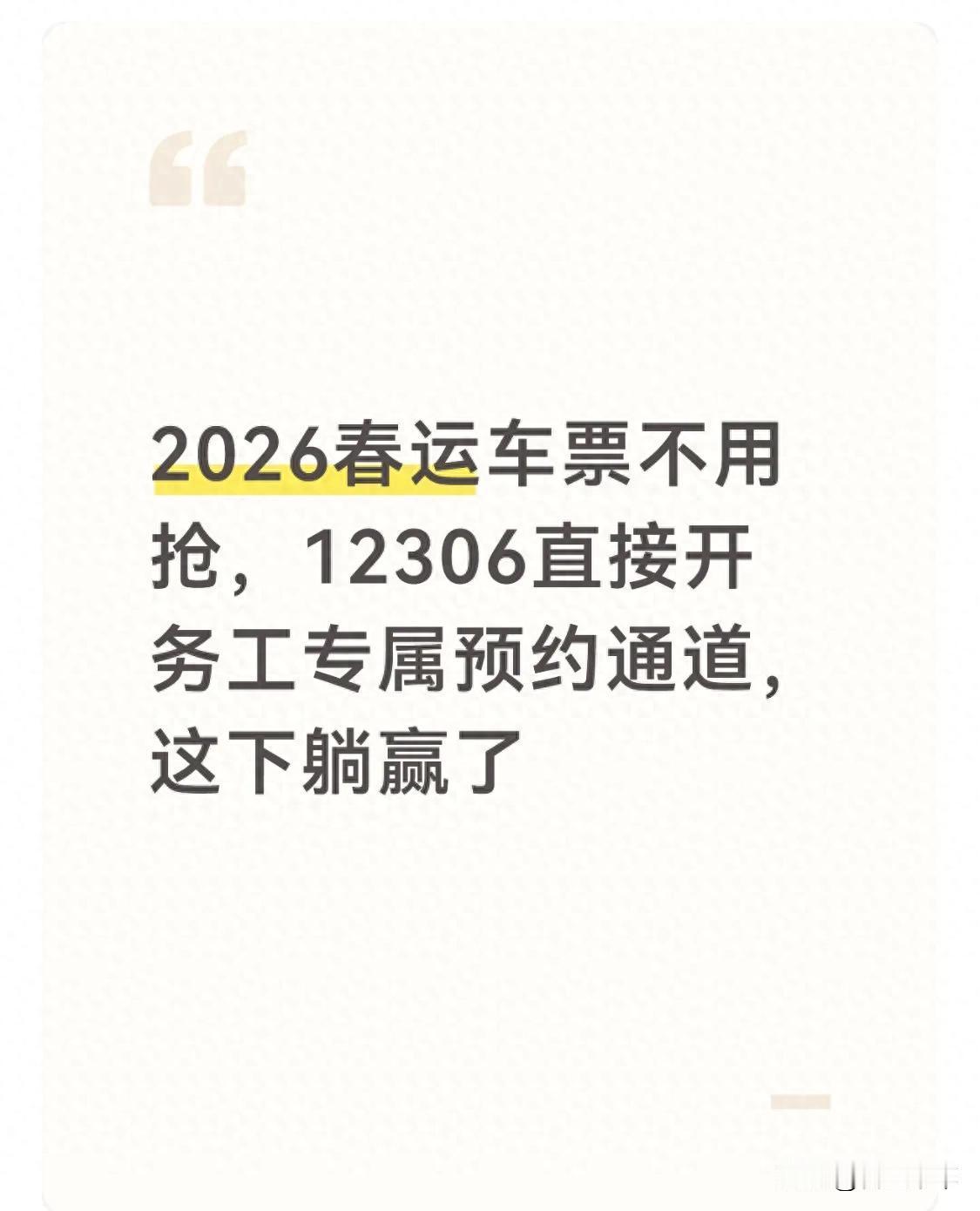 春节最迫切是什么,就是能有票回家,在外奔波一年了,谁也不想在过年的时候,还是一个人,无论多苦多累,回家,和家人团聚,是给你们一年辛劳最好的褒奖。 今年春节铁路方面又将迎来大考:预计发运旅客5.39亿人次;相当于整个欧洲总人口的70%要在春节这段时间流动;当然真实坐火车的没有这么多,但是还不包括,开车、骑摩托车返乡的人群;所以这是世界上其他任何国家难以想象的人口大迁移! 有时候真的佩服我的国,春运绝对是世界上举世无双的交通壮举!没有任何一个国家能做到! 这次铁路客运也是有针对春运的新规出台:主要是误购 30 分钟免费退,务工有专属抢票通道 ;打工返乡、回家过年都省心,赶紧记好! ① 误购车票 30 分钟内免费退:线上退票零手续费,以前手滑买错日期站点,最少扣 20% 手续费,现在彻底不心疼;我同事上周买错票,30 分钟内退了没花一分钱,重新抢票顺利搞定。 ② 务工人员专属购票通道:12306 单独开放,提交用工证明就能预约,不用和所有人抢票,成功率翻倍!年底抢票难的问题,终于有解决方案了! 三步操作谨记: 1、打开“铁路12306”App,提前完成“实名核验”。这是使用一切专属服务的前提。同时确认你是个人或1-19人的小团体(这是线上通道的主要对象)。 2、在App首页点 “我的” → 找到 “务工人员春运预约购票服务” 入口(开放至2月26日)。在里面填好出行日期、目的地和乘车人(最多19人),然后提交。这相当于“提前挂号”,比公开发售要早。 3、提交后就不用管了,系统会在开车前第16天统一“发榜”配票。你会收到短信通知结果。最关键的一步:如果成功了,必须在收到短信的当天晚上23点前付款,过时订单就自动取消了。 预祝所有的打工人,都能心想事成,顺利返家,阖家幸福,马年行大运! 温馨提示:本文内容仅供参考,政策以官方最新通知为准,健康建议请结合自身情况,维权 / 反诈请联系官方渠道。