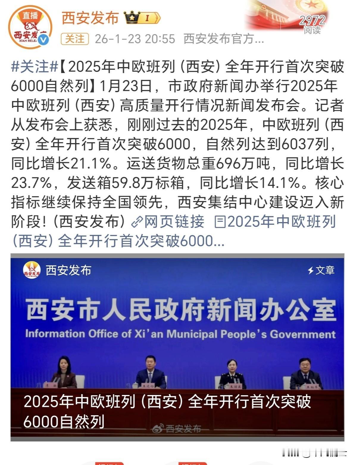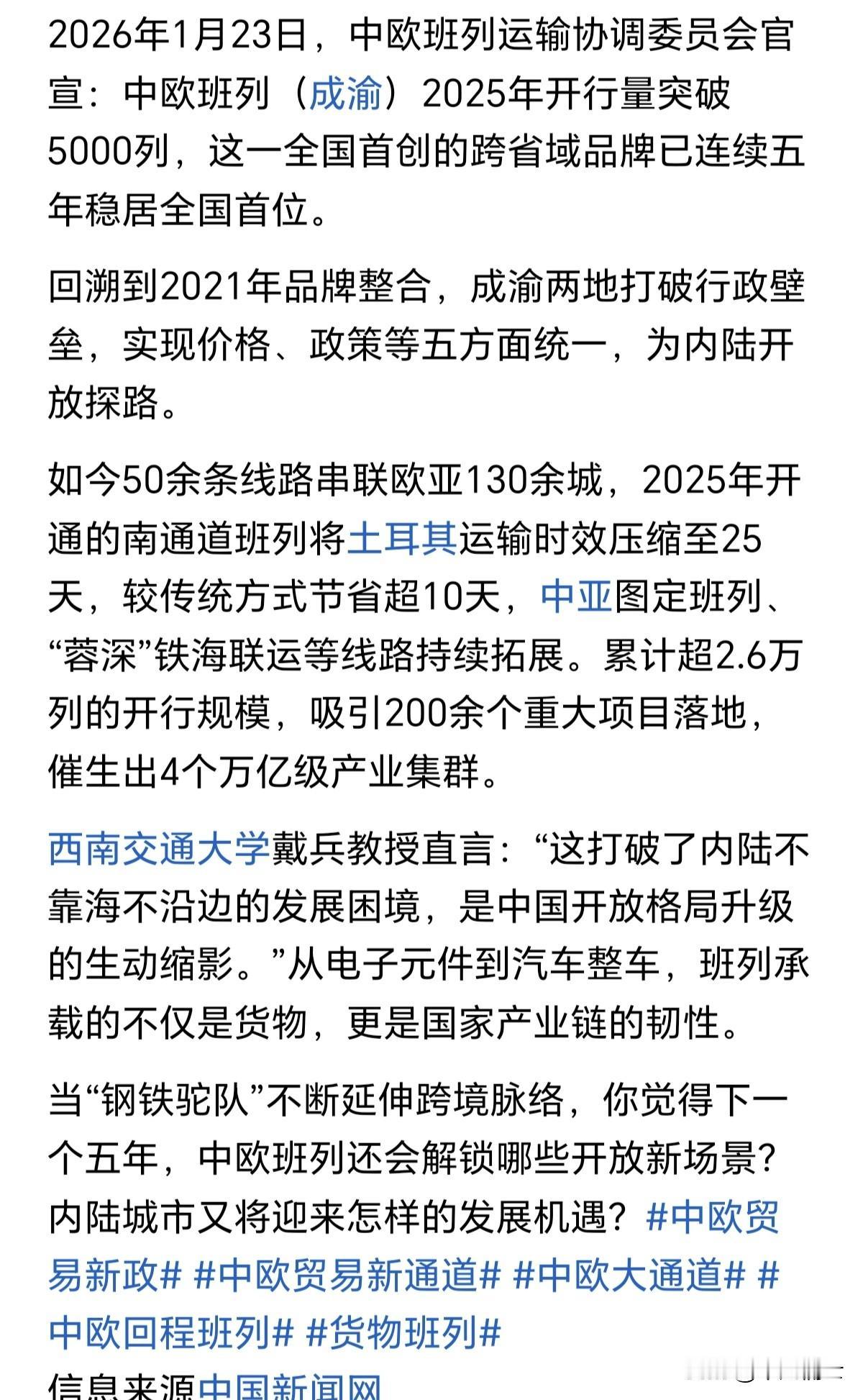 到底谁才是中欧班列开行量第一呢?成渝报道说2025年开行中欧班列超5000列,位居全国第一。西安的新闻说,中欧班列全年开行超6000列,达到6037列,核心指标继续保持全国领先。 如果简单的按照开行中欧班列数量,明显是西安超过了成渝,但为什么成渝在数量少的情况下还说自己是第一呢?我们不懂统计专业的事情,谁能说清楚是怎么一回事呢!至于具体到城市,我相信一定是西安第一,毕竟成渝统计的可是成都和重庆两个城市,而且一个是直辖市,一个号称西部第一省会城市。所以,我们还是应该为西安感到自豪,竟然成为了中国最大的内陆港口城市,这样的成就本身就不简单。