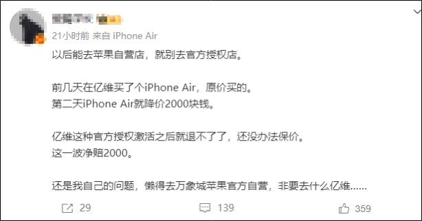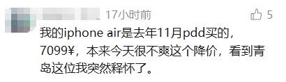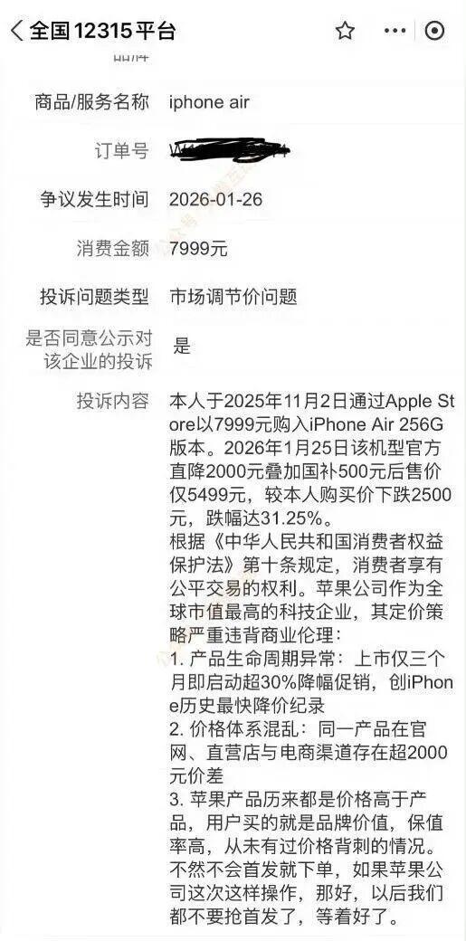 苹果突然大降价,有人买完第二天就降2000元! 苹果退钱 近日,多名网友反映在青岛苹果授权店原价购入iPhone Air后,次日该机型便开启限时优惠,官方立减2000元叠加国补后最高优惠2500元,而授权店无无理由退货及保价政策,网友直呼“净赔2000元”。相关投诉已涌上黑猫平台,部分用户还向12315发起维权。 据悉,iPhone Air去年9月发布,2025年10月中国开售,因定价接近Pro系列却配置缩水、仅支持eSIM等问题销量低迷,上市几周销量仅达预期三分之一,苹果已暂停其零部件生产。