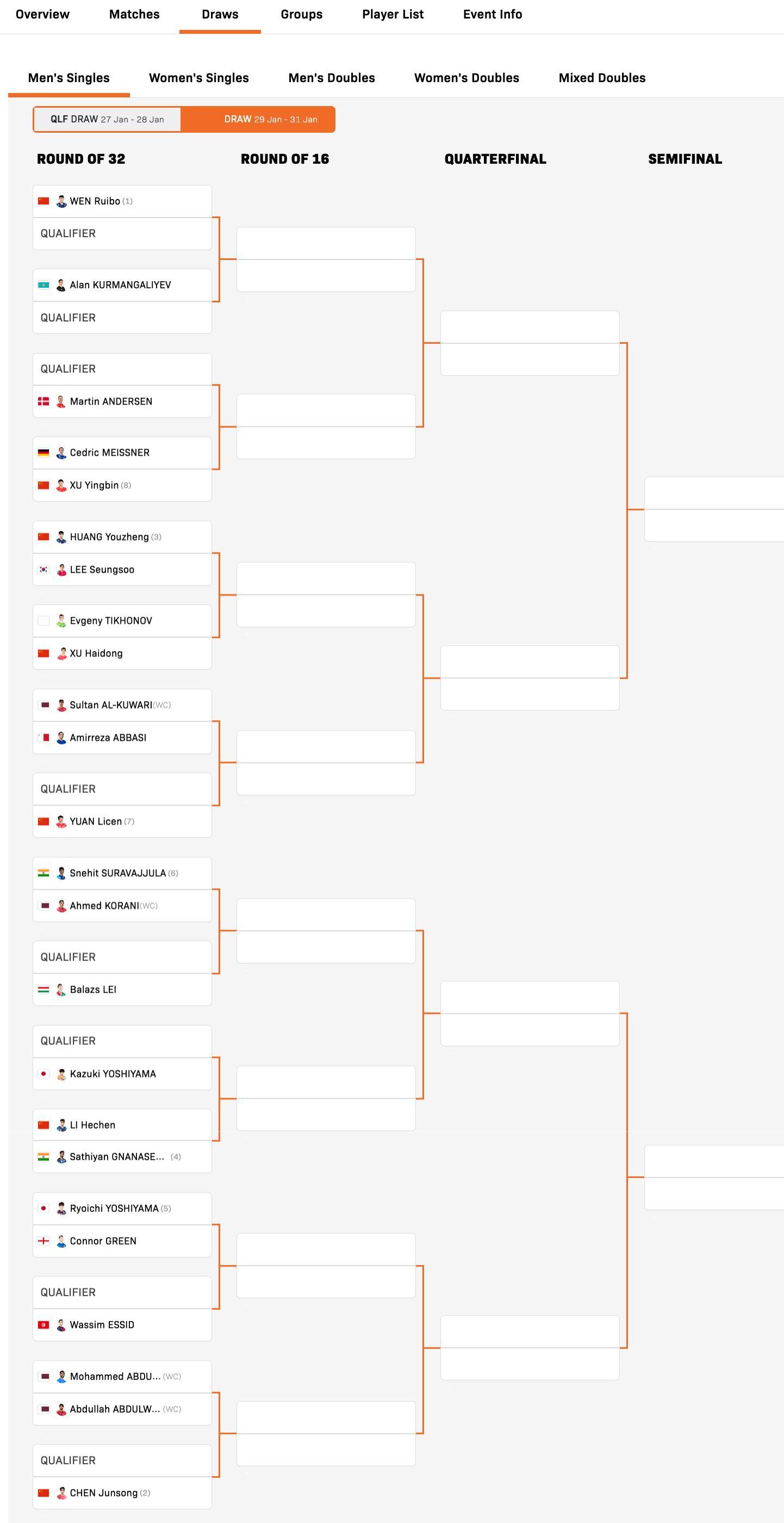 WTT支线赛多哈站丨男单正赛签表【1/8区】温瑞博🇨🇳vsQ、阿兰·库尔曼加利耶夫🇰🇿vsQ【2/8区】Qvs马丁·安德森🇩🇰、塞德里克·迈斯纳🇩🇪VS徐瑛彬🇨🇳【3/8区】黄友政🇨🇳VS李承洙🇰🇷、叶夫根尼·季霍诺夫(AIN)VS徐海东🇨🇳【4/8区】苏丹·库瓦里🇶🇦VS阿米尔雷扎·阿巴斯🇲🇹、Qvs袁励岑🇨🇳【5/8区】斯内希特·苏拉瓦朱拉🇮🇳VS艾哈迈德·科拉尼🇶🇦、Qvs巴拉兹·雷🇭🇺【6/8区】Q'vs吉山和希🇯🇵、李和宸🇨🇳VS沙提安·加纳纳塞卡兰🇮🇳【7/8区】吉山僚一🇯🇵VS康纳·格林🏴、Qvs瓦西姆·埃希德🇹🇳【8/8区】穆罕默德·阿卜杜勒瓦哈卜🇶🇦VS阿卜杜拉·阿卜杜勒瓦哈卜🇶🇦、Qvs陈俊菘🇨🇳