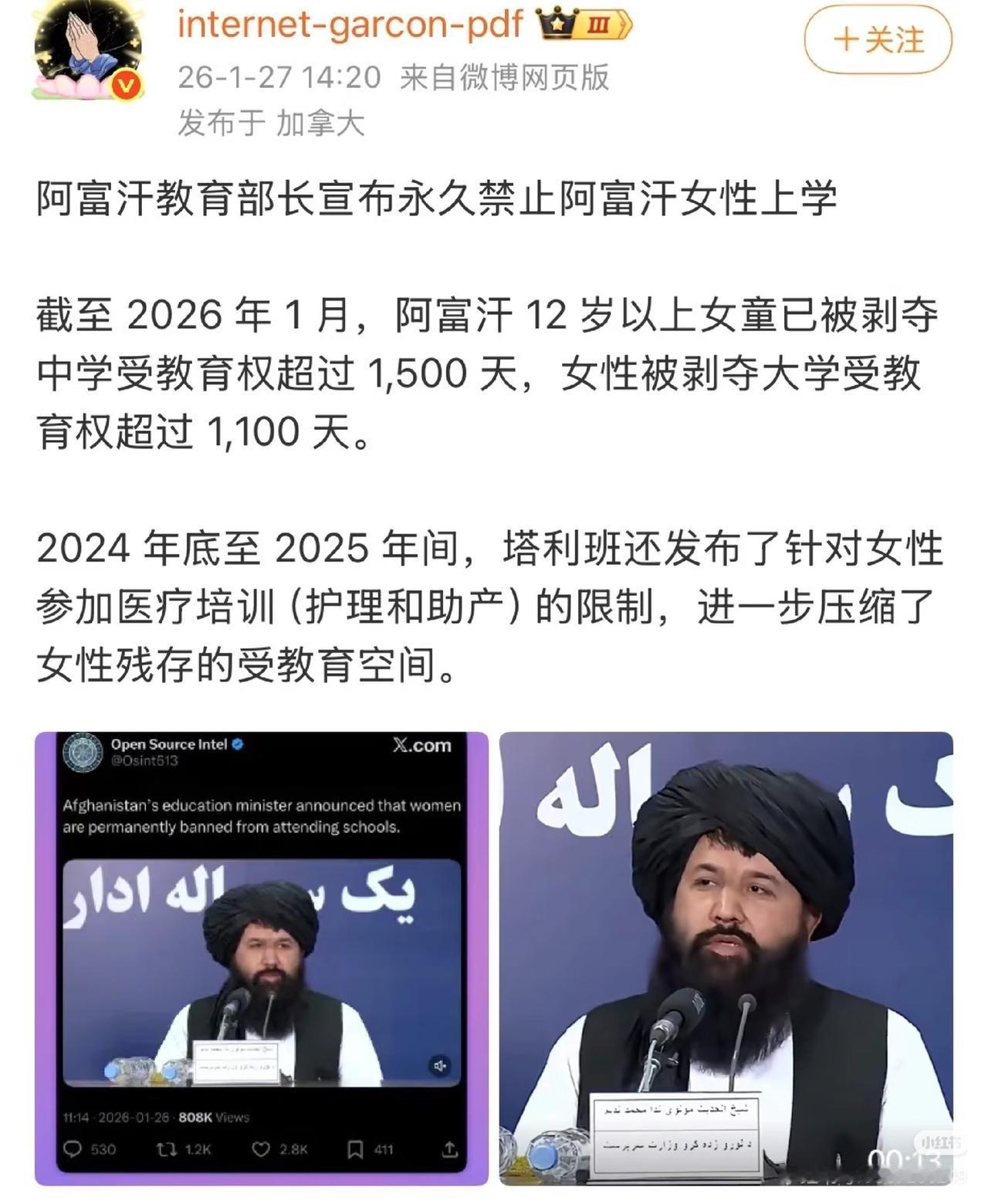 好吃惊! 就在今天,阿富汗部长竟然宣布了一项规定,永久禁止阿富汗女性上学! 据了解,阿富汗12岁以上的女童。已被剥夺中学受教育权超1500天,女性被剥夺大学教育权1100多天。 就连学习护产和医疗也有限制! 真的不能理解,所有国家都在解放生产力,阿富汗封锁一半生产力,这是想灭国啊? 还是把阿富汗改叫阿父汗吧,妥妥的男权社会!使女的故事走进现实! 对此,大家怎么看? 阿富汗 阿富汗新政 阿富汗民族 阿富汗民生困境 阿富汗妇女权益 阿富汗女性