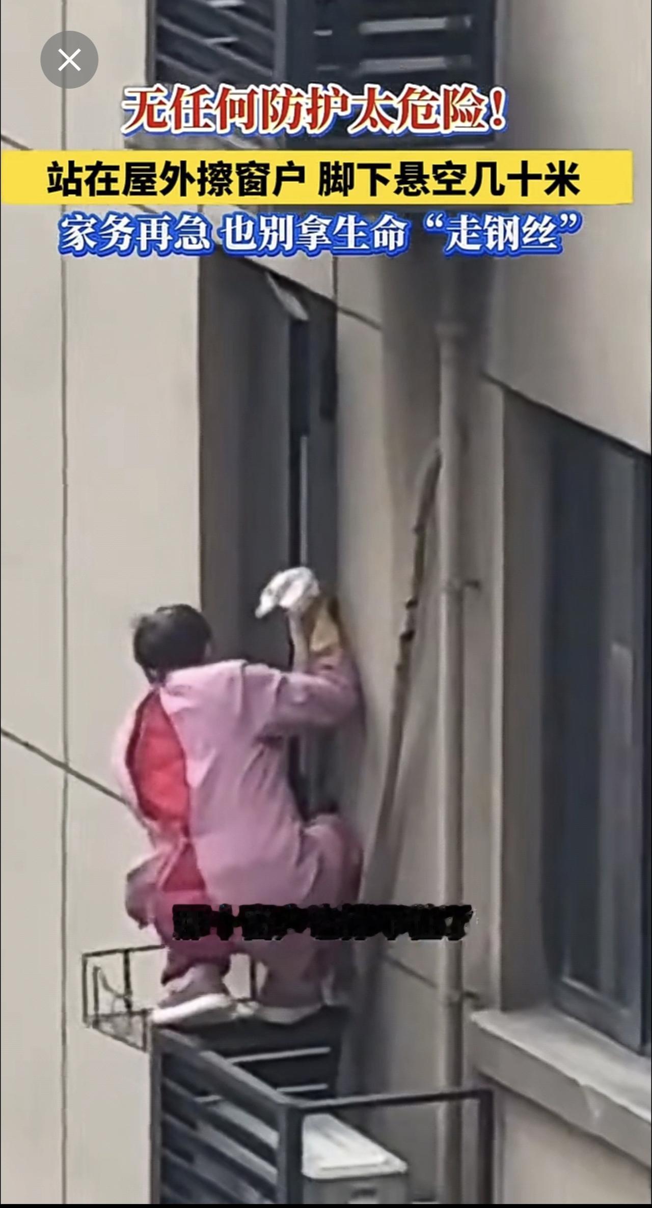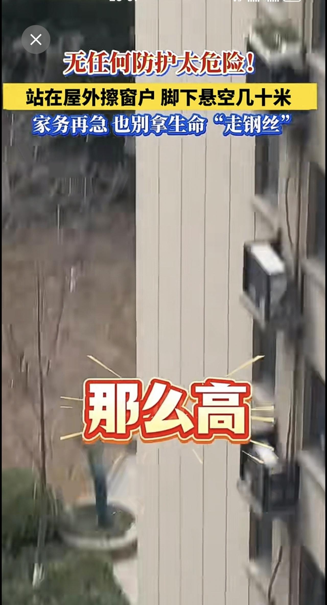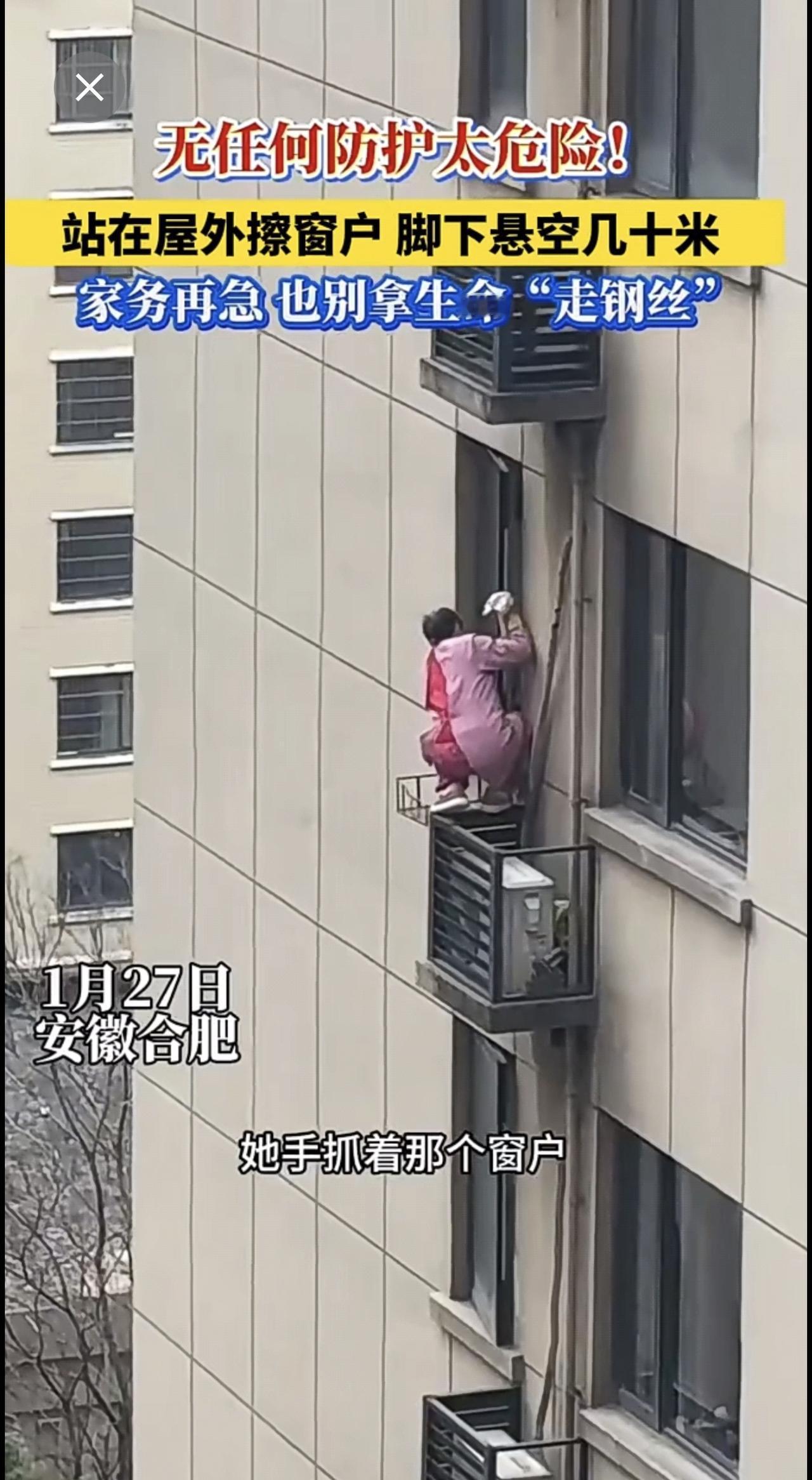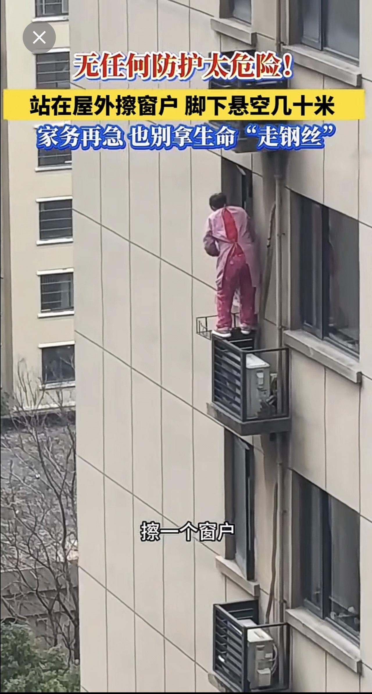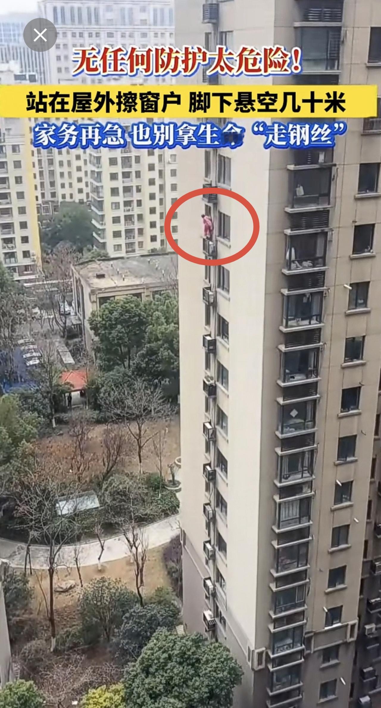 无任何防护太危险!站在屋外擦窗户,脚下悬空几十米。小编提醒:家务再急,也别拿生命“走钢丝”。(来源:南京新闻)
