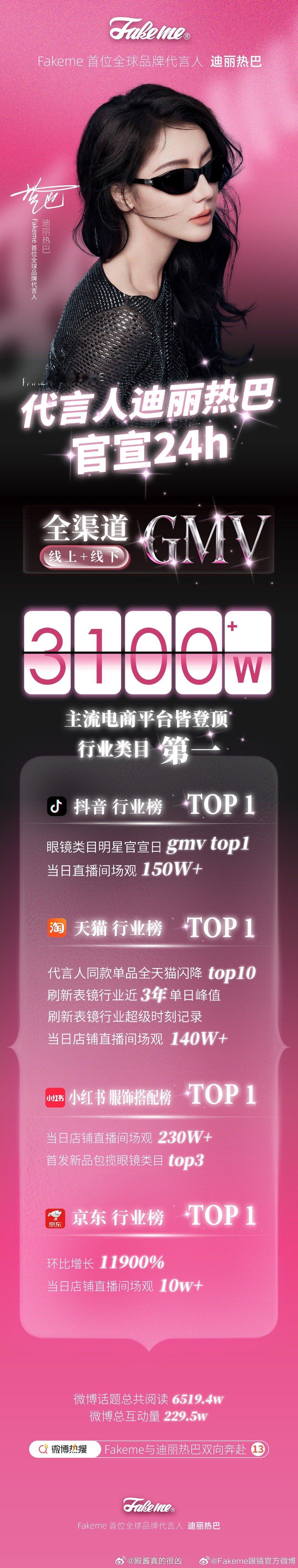 Fakeme代言人迪丽热巴官宣24h战报来了,全渠道线上+线下总GMV破3100万!主流电商4平台全部类目TOP1 !🏆