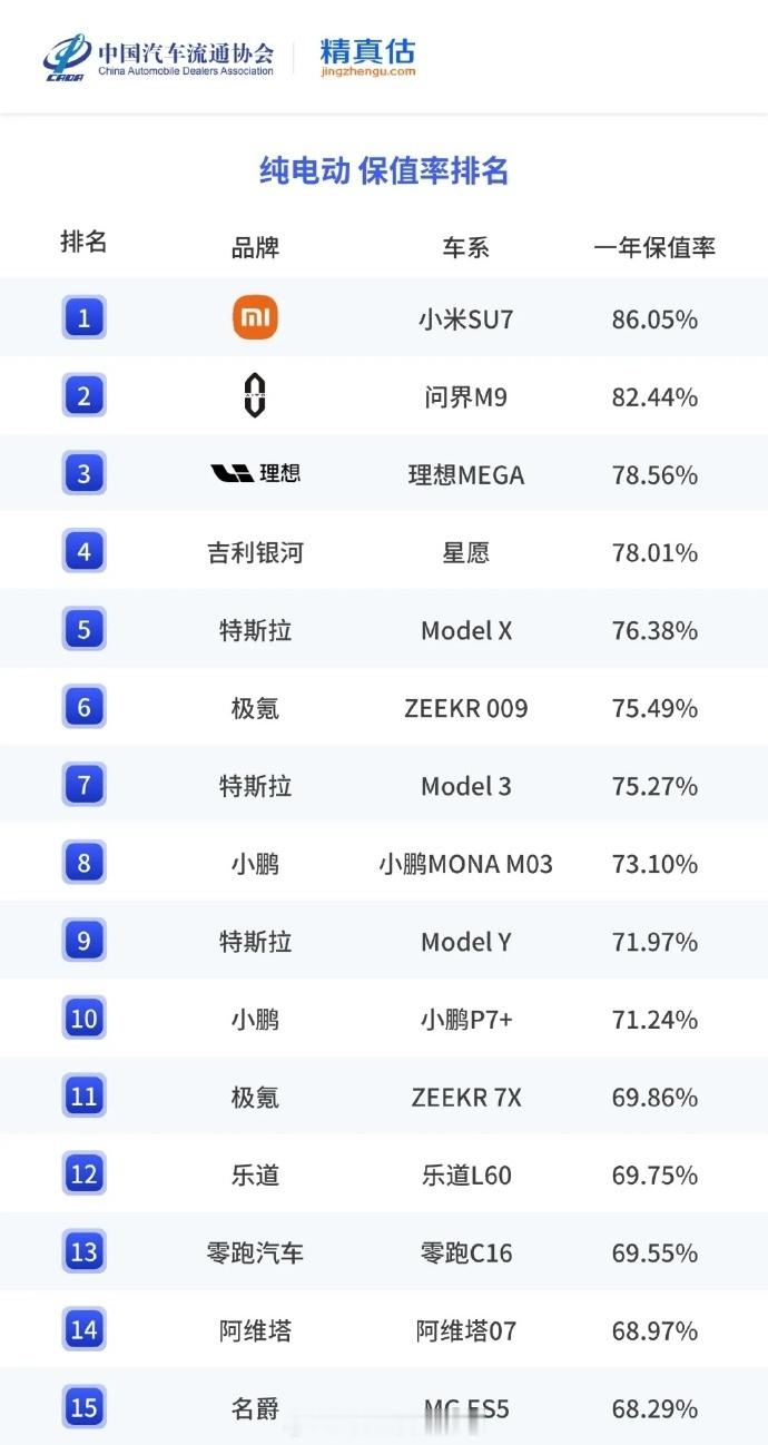我之前就说过,保值率最高的品牌是小米还一堆人喷我,现在信了吧?中国汽车流通协会和精真估发布的《2025年度中国汽车保值率报告》中提到小米SU7以86.05%获纯电一年保值率第一,问界M9 82.44%居第二,销量好保值率就是高,不过还是要提醒大家,买新能源还是做好功课,别49年入国军,你们懂的。买新不买旧,如果买旧要极其谨慎,尤其是发布一年以上的车型,甭听销售忽悠,大概率是新品要上清库存,除非价格极其给力,否则还是观望。大v聊车
