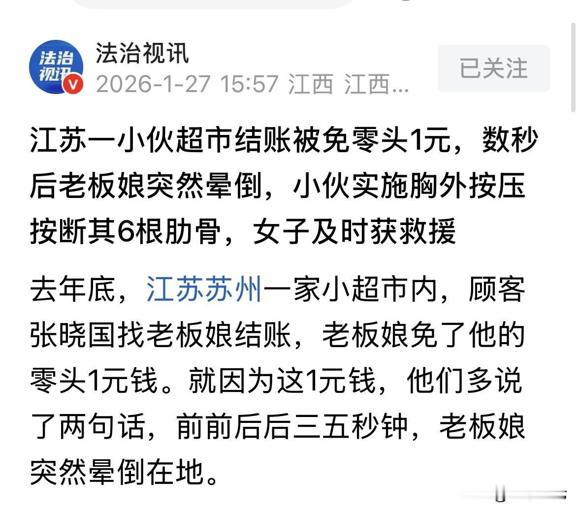 江苏苏州,男子去超市买东西,结账时老板娘给他抹了1块零头,俩人因此多聊了几句,谁知,老板娘聊着聊着突然两眼一黑,晕倒了!男子吓得连忙打120,并在工作人员的隔空指导下,对老板娘实施心肺复苏,男子一刻不敢耽搁,连续按压胸口600次,事后,老板娘虽转危为安,却被按断6根肋骨,她丈夫一句话亮了。 这天,张晓国去小超市买东西,结账时老板娘挺爽快,零头1块钱直接给抹了。 张晓国一看老板人挺好,就和她多聊了两句,结果前后也就三五秒钟的功夫,意外突然就来了。 老板娘聊着聊着,毫无征兆地直挺挺向后倒去,咚一声摔在地上,不省人事。 这把张晓国吓懵了。换做一般人,可能第一反应是吓得往后退,或者手忙脚乱不知道该干啥。 但张晓国这人反应快,他一个箭步冲上去,一边掐老板娘人中一边摸脖子,发现对方已经没脉搏了,也没呼吸了。 那一刻,张晓国脑子里就一个念头:得救人!他手忙脚乱地掏出手机拨了120。 电话接通的那一秒,简直就是生死时速的开始。电话那头是急救中心的调度员吴亚。 吴亚一听情况,知道必须得抓住黄金时间。 她在电话里大声喊着指挥张晓国,说你别慌,把她放平,解开衣服,两手交叠,垂直按压! 对于张晓国这种没受过专业训练的普通人来说,给人做心肺复苏那是真要命的活儿。 吴亚在电话里死死盯着秒表,喊着节奏:01、02、03……按深一点!至少5厘米!别停! 张晓国这时候已经顾不上别的了,汗水顺着额头往下淌,胳膊酸得像灌了铅,但他不敢有一丝一毫的松懈。 他知道,手底下压着的是一条人命,只要停下来,这人可能就真没了。 他就像个不知疲倦的机器,一下、两下、三下……拼命地压着胸口。 连续按了600下,老板娘还是没反应,脸色惨白,连个气儿都没有。 此时,张晓国有点绝望了,他在想,是不是已经晚了?是不是救不回来了? 就在他快要崩溃的时候,吴亚在电话里果断下令:光按不行了,得做人呼吸!捏住鼻子,嘴对嘴吹气,每按30下吹2口气,快! 说实话,对于一个陌生男人来说,给陌生女人做人工呼吸,心里多少是有点顾虑的,尤其是在这种紧急关头,还得克服心理障碍。 但张晓国这时候哪还顾得上这些?救人要紧!他把心一横,按照吴亚的指导,交替着做按压和吹气。 时间一分一秒过去,每一秒都像一年那么长。 终于,救护车的声音在外面响起来了。医护人员冲进来的时候,张晓国已经累得瘫坐在地上,两只手还在不受控制地发抖。 老板娘被抬上担架送去医院抢救。命是保住了,但新的问题来了。 检查结果显示,为了把心脏按起来,张晓国那拼命的几下子,把老板娘的六根肋骨给按断了。 这事儿要是搁在不讲理的人家里,那还了得?把人救了,结果弄断了骨头,家属不得找你拼命索赔啊? 张晓国心里也忐忑,毕竟自己是个外人,把人家骨头弄断了,这怎么交代? 没想到,老板娘的丈夫赶到医院后,看到断了骨头的检查报告,非但没发火,反而拉着张晓国的手,眼泪都快下来了,连声说:谢谢!谢谢!要是没有你这拼了命的施救,她根本活不过来! 这位丈夫是个明白人。 他后来跟医生聊天说,心肺复苏本来就是个偏暴力的动作,要想把停跳的心脏按 重启,力气小了根本没用。 断了骨头能长好,可人要是没了,那就真没了。 人家素不相识,能在关键时刻伸把手,这份恩情,我们全家记一辈子,还都还不完。 这件事不禁让人感叹这段奇妙的缘分。1块钱的零头,换来了一条命。 在如今这个“扶不扶”都要犹豫的时代,张晓国敢在第一时间冲上去,这勇气真不是一般人有的。 那就有人问了,如果老板娘的家属事后追究,张晓国是否要对按断肋骨的事承担民事责任? 《民法典》第184条规定:因自愿实施紧急救助行为造成受助人损害的,救助人不承担民事责任。 这个条款被称为“好人法”。 首先,张晓国的救助行为具备紧急性。 老板娘突然晕倒且心脏骤停,生命垂危,如果不立即施救将面临死亡风险,现场情况刻不容缓。 其次,他主观无恶意。杨晓国实施按压是为了挽救生命,且全程在120调度员的专业指导下进行,他的目的纯粹是为了救助,不存在故意伤害或重大过失。 最后,结果具有合理性。心肺复苏本身就是一种高强度的急救手段,为了维持血流循环,必须施加足够的力度,导致肋骨骨折在医学上是常见的并发症,而非操作不当的必然结果。 所以,杨晓国的行为属于典型的自愿紧急救助,虽造成了肋骨断裂的损害后果,但依法享有民事责任豁免权,他不用负任何责任。 对于这件事,你怎么看? 欢迎关注@一案一论