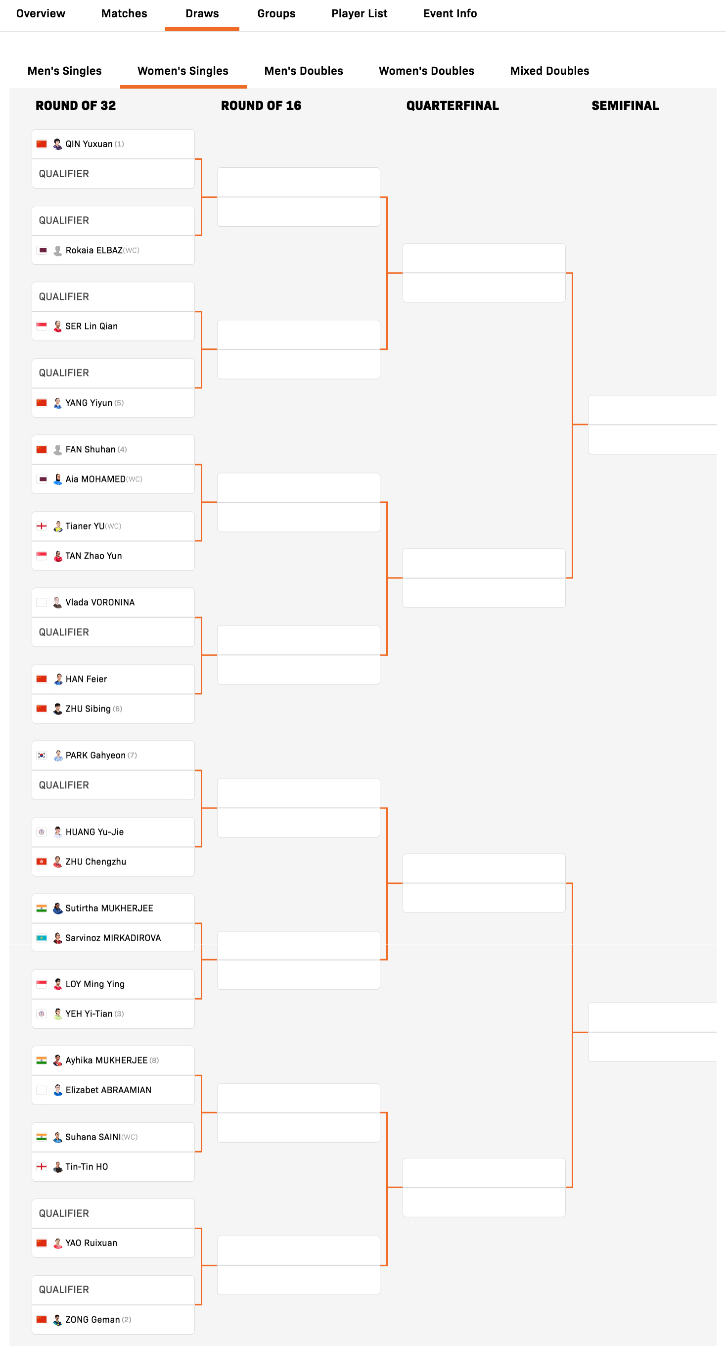 WTT支线赛多哈站丨女单正赛签表【1/8区】覃予萱🇨🇳vsQ、Qvs罗卡亚·埃尔巴兹🇶🇦【2/8区】Qvs舒麟茜🇸🇬、Qvs杨屹韵🇨🇳【3/8区】范姝涵🇨🇳VS艾雅·穆罕默德🇶🇦、迪亚纳·余🏴VS陈昭澐🇸🇬【4/8区】弗拉达·沃罗宁娜(AIN)vsQ、韩菲儿🇨🇳VS朱思冰🇨🇳【5/8区】朴架泫🇰🇷vsQ、黄愉偼(中国台北)VS朱成竹🇭🇰【6/8区】苏提尔塔·穆克吉🇮🇳VS萨维诺兹·米尔卡迪罗娃🇰🇿、黎明映🇸🇬VS叶伊恬(中国台北)【7/8区】艾希卡·穆克吉🇮🇳VS伊丽莎白·阿布拉米安(AIN)、苏珊娜·塞尼🇮🇳VS何天天🏴【8/8区】Qvs姚睿轩🇨🇳、Qvs纵歌曼🇨🇳