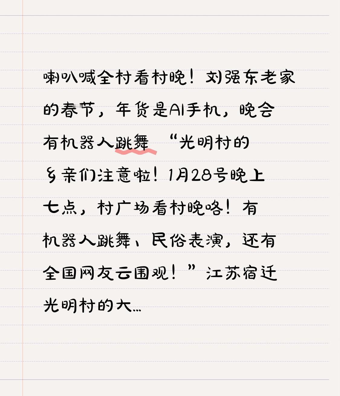 喇叭喊全村看村晚!刘强东老家的春节,年货是AI手机,晚会有机器人跳舞 “光明村的乡亲们注意啦!1月28号晚上七点,村广场看村晚咯!有机器人跳舞、民俗表演,还有全国网友云围观!”江苏宿迁光明村的大喇叭一喊,全村老少都动了起来——这场被村委会“强势安利”的村晚,不仅有传统年味,更藏着科技惊喜,背后是刘强东对老家绵延十几年的牵挂。 谁能想到,这个苏北小村的春节,如今过得比城里还热闹。村委会的喊话刚落地,村广场就忙了起来:搭建舞台的工人踩着梯子布线,村民们自发打扫场地,孩子们围着调试设备的机器人好奇打转。而这只是开端,早在几天前,京东物流的车队就载着超万件年货驶入村子,OPPO方言AI手机、微波炉、血糖仪、筋膜枪堆成小山,每户要派两三个人开着三轮车才能拉完,60岁以上老人还能领到专属暖心礼,这份厚重的年味,光明村村民已经连续十几年稳稳接住。 这场村晚,更是把“传统”与“新潮”焊在了一起。既有宿迁皮影戏、苏北小调等地道民俗表演,让老人们听得过瘾;又有京东青春采销团队的歌舞秀、机器人编队舞蹈,还有AI互动游戏,孩子们追着屏幕拍手叫好。更贴心的是,晚会全程线上直播,在外打工的游子打开手机就能“云回家”,和爸妈一起看节目、话家常。而村晚背后,还有更大的惊喜:一间全新的AI教室正在村里落成,配备早教益智、3D创意等功能区,让乡村孩子在家门口就能接触前沿科技,缩小城乡教育差距。 反转来了:这场热闹非凡的村晚,不是单纯的“回馈”,更是一场双向奔赴的感恩。十几年前,考上大学的刘强东凑不齐学费,是全村人你家5块、我家10块,凑了500元和76个鸡蛋送他上路。这份情,他记了一辈子。从2015年给60岁以上老人发万元红包,到2025年送上超3000万元的现金和年货,再到今年的AI手机、村晚和科技教室,他用一年年的实际行动,回应着老家的养育之恩。而村民们也用最朴素的方式回馈:自发放烟花迎接年货车队,送上“情系群众 大爱于民”的锦旗,就连村支书都骄傲地说,村里6000多人就业率100%,不少人都在京东找到了工作。 更让人暖心的是,这份温情还在向外传递。今年京东发起的“我给老家送年货”活动,以光明村为起点,雷佳音、蔡明、迪丽热巴等明星接力参与,把新春祝福送到全国多个城市。而光明村的村晚也不局限于本村,通过直播让全国网友感受到乡村年味,不少人在评论区留言:“这才是春节该有的样子”“被这份乡情狠狠戳中”。村委会干部说:“喊大家来看村晚,不仅是凑个热闹,更是想让这份感恩之心一代代传下去。” 其实村晚的热闹背后,是最真挚的乡土情。刘强东曾说,乡亲们的帮助是他走向世界的本钱,而他用十几年的坚持证明,成功从来不是忘记来路。村委会的大喇叭喊的是村晚,更是团圆与牵挂;村民们期待的是表演,更是那份被记挂的温暖。 这场被村委会“喊话”的村晚,没有华丽的舞台,却有最浓的年味;没有惊天动地的场面,却有最动人的真情。愿每个在外打拼的人都有人牵挂,愿每个故乡都能被温柔以待,愿这份双向奔赴的乡情,永远温暖人心。你过年会回村看村晚吗?评论区聊聊你的家乡年味~