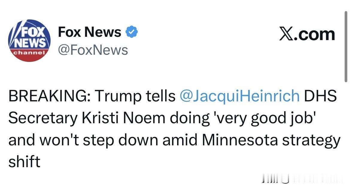 福克斯新闻报道:美国总统唐纳德·特朗普告诉国土安全部长克里斯蒂·诺姆,她最近“做得非常好”,不会在明尼苏达州战略转变之际,将诺姆撤职。