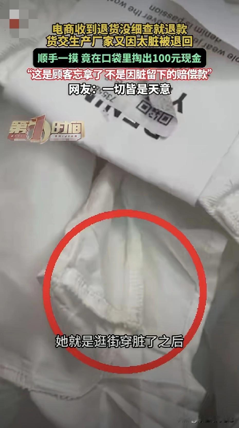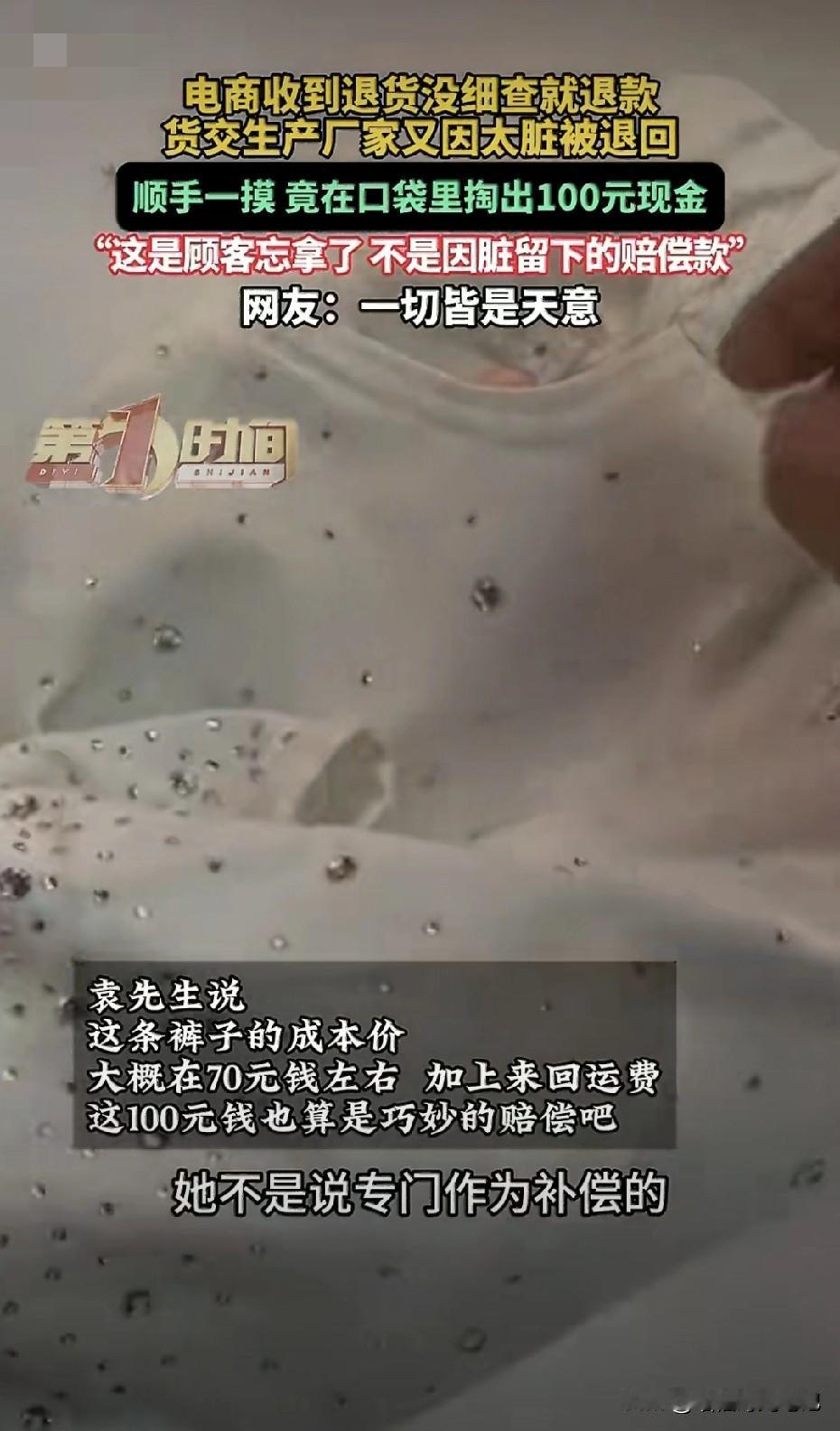 这不是“赔偿”,是生活偷偷给的糖。东莞一位电商老板,收到退货时随手一摸,竟从那条被穿脏的裤兜里摸出100块。 同款裤子退回好几条,根本找不到是谁落下的。他索性把这笔钱当成“自动补偿”:裤子成本70元,来回运费刚好,多出来的那30,权当生活塞给他的小红包。 评论区里有人笑:“这顾客是怕老板吃亏,故意留的?” 也有人酸:“穿脏了还退,素质呢?” 我也看见另一层—— 在“仅退款”“货不对板”吵翻天的电商江湖里,突然冒出一张皱巴巴的百元钞,像一记温柔的刹车: 原来不是所有故事都要剑拔弩张,也可以潦草地、悄悄地把善意塞回对方口袋。 老板没打算追是谁、也没高调捐款,只是把钱留在抽屉,等下一笔订单缺零头时顺手抹平。 那一刻,他像在暗夜里点亮一根火柴的人 火苗小到照不亮整条街,却足够让屏幕前的我,忽然愿意相信: 生意场不只有算计,还有误打误撞的良心循环。 100元买不回一条新裤子,却买回我们对陌生人的一点信心。 原来“体面”不一定靠规则约束,也可以靠口袋里意外遗落的一张纸币,轻轻托住。 (图源:@纵览新闻)