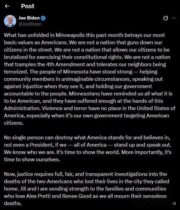 美国前总统乔·拜登,就特朗普政府的ICE移民特工当街枪杀美国公民的事件发表声明: “过去一个月在明尼阿波利斯发生的事件,背叛了我们作为美国人最基本的价值观。我们不是一个会在街头枪杀本国公民的国家。我们不是一个容许公民因行使宪法权利而遭受暴力的国家。我们不是一个践踏《第四修正案》、容忍邻人被恐吓的国家。 明尼苏达人民始终坚强——他们在难以想象的困境中帮助社区成员,看到不公时挺身而出,要求政府对人民负责。 明尼苏达人提醒了我们,成为美国人意味着什么,他们已经在本届政府手中承受了太多。 暴力与恐怖在美利坚合众国没有立足之地,尤其是在我们的政府将枪口对准本国公民的时候。 只要我们——整个美国,站出来发声,就没有任何人,即使是总统,也无法摧毁美国所代表与坚守的信念。 我们知道我们是谁。是时候向世界展示了。更重要的是,是时候向我们自己证明了。 如今,实现正义,需要对那两位美国人为何在在自己称之为家的城市失去生命展开全面、公正、透明的调查。 我与吉尔正向亚历克斯·普雷蒂和蕾妮·古德的家人及所爱之人致以慰问,与大家一同悼念他们无谓的牺牲。”