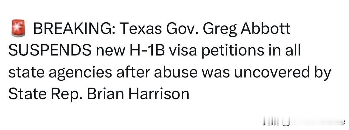 突发新闻:共和党籍的德克萨斯州州长格雷格·阿博特,在德州共和党籍的众议员布莱恩·哈里森揭露得克萨斯州内存在大量滥用H-1B签证申请后,正式宣布暂停所有得克萨斯州政府及其附属机构受理新的H-1B签证申请。